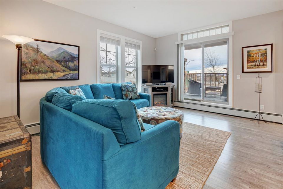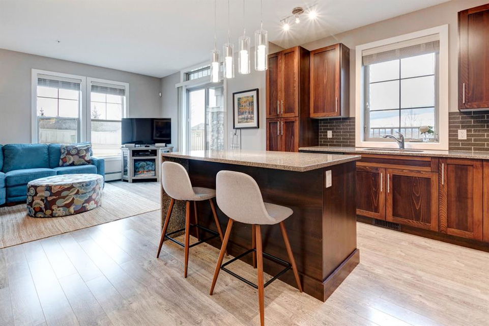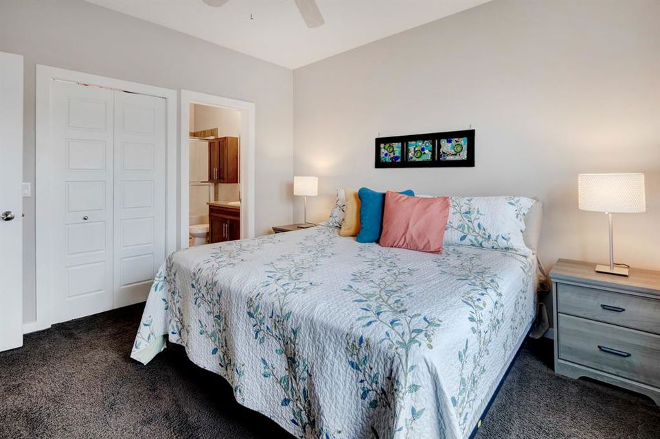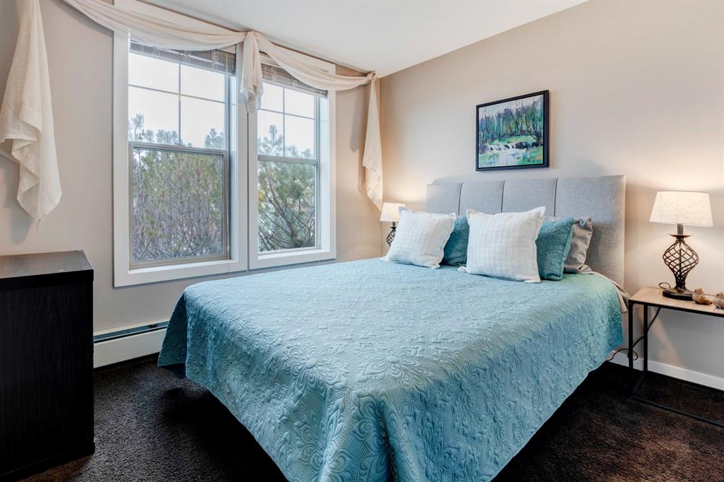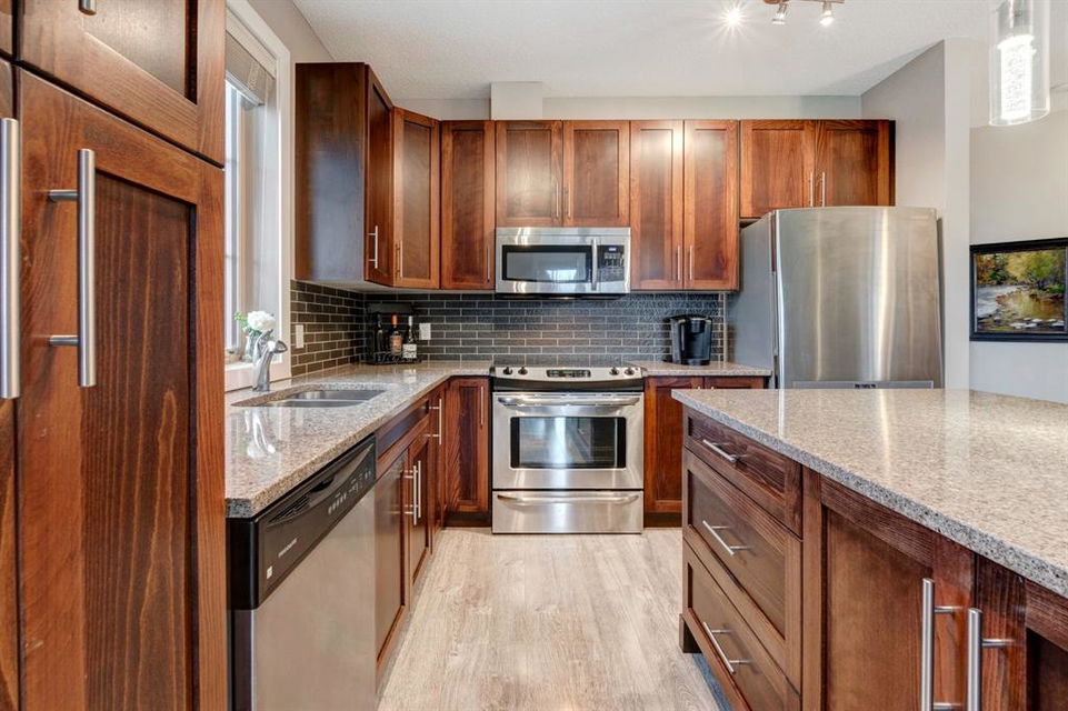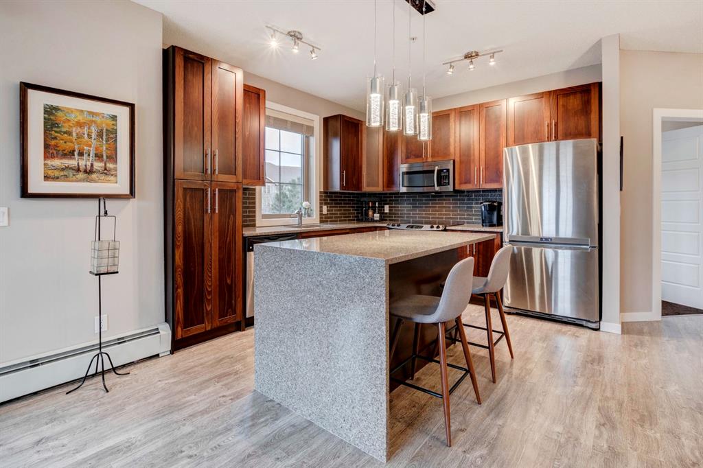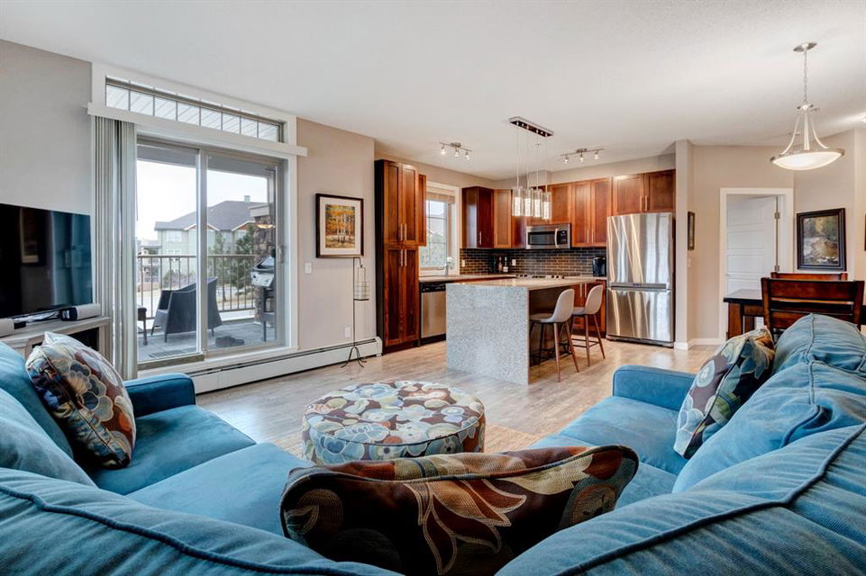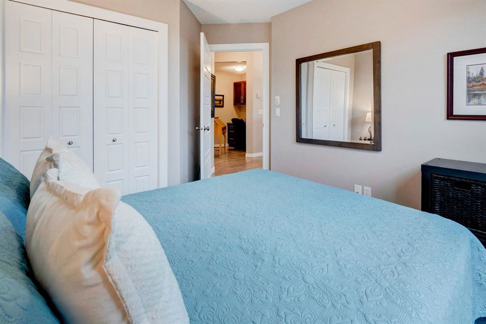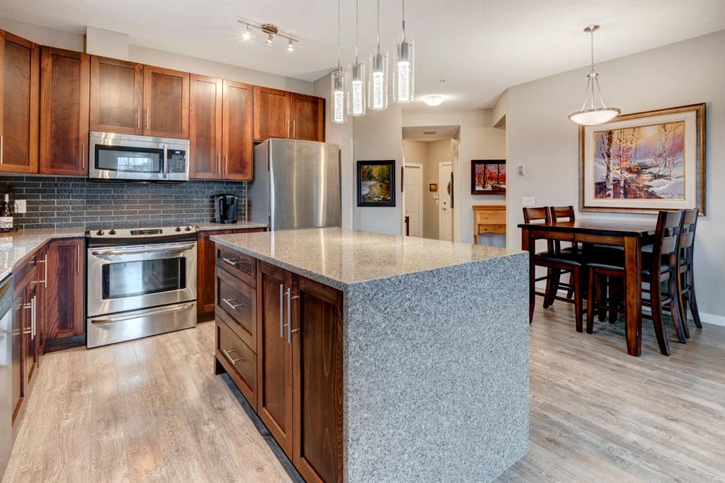 Spacious 2 bedroom, 2 bathroom corner unit with a great layout, modern finishings, 2 titled parking stalls, an oversized balcony, and a lovely mountain view! This bright, trendy condo offers an open floor plan, 9″ ceilings, plenty of windows and Hunter Douglas blinds throughout. The upgraded kitchen includes stained maple cabinetry, granite counters, island with seating for 2 and stainless steel appliances. The living room with patio doors leading to the expansive patio. The master bedroom easily accommodates a king size bed and has a walk-in closet and 3-piece ensuite. There is a 2nd bedroom, 4-piece bathroom, den with built-in desk and cabinetry, and a very handy and sizeable laundry room with storage space. This condo offers one of the largest patios in the complex where you can enjoy the mountain views and the convenience of having a gas line for your BBQ. The layout is excellent with the 2 bedrooms being on opposite sides of the condo and no wasted space. 2 titled parking stalls including one underground heated stall with a storage locker and one surface stall with plug-in. The Alora is a well-maintained complex with a fitness facility, guest suites and plenty of visitor parking stalls. This former show suite is sure to impress!