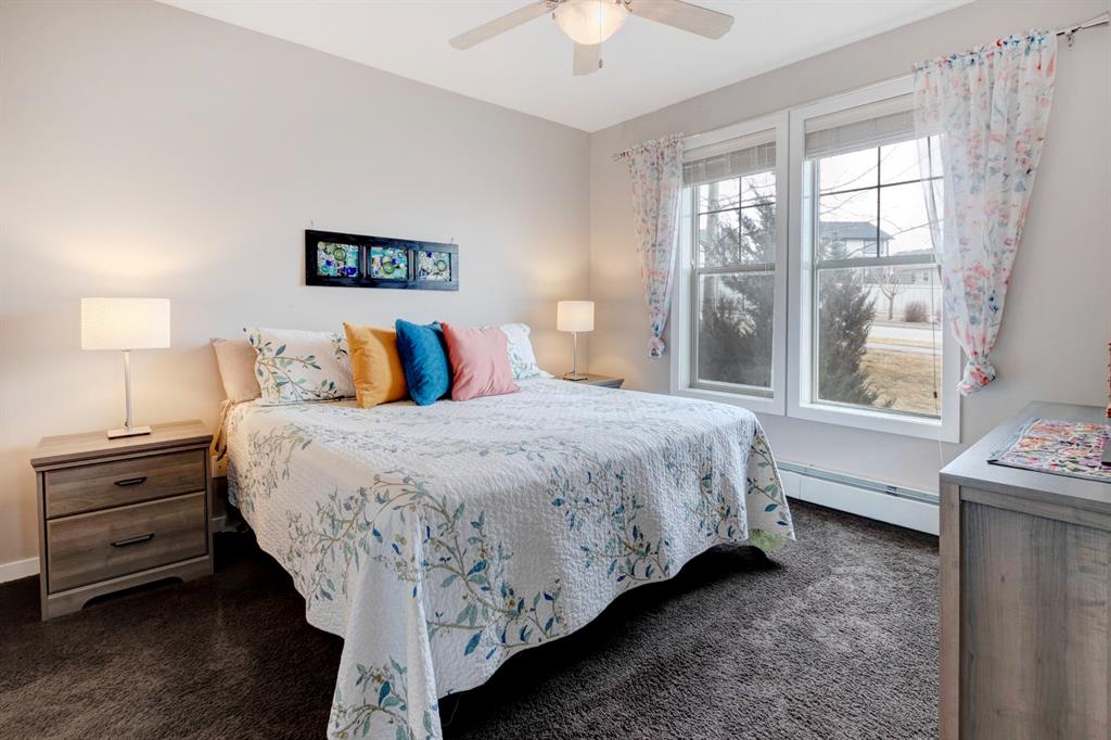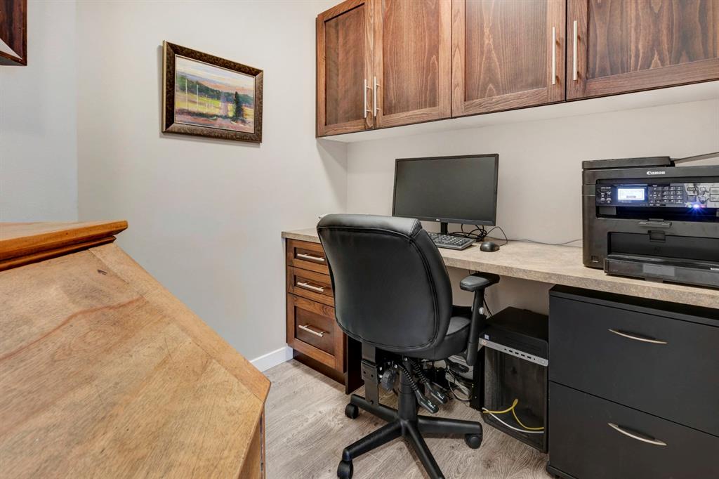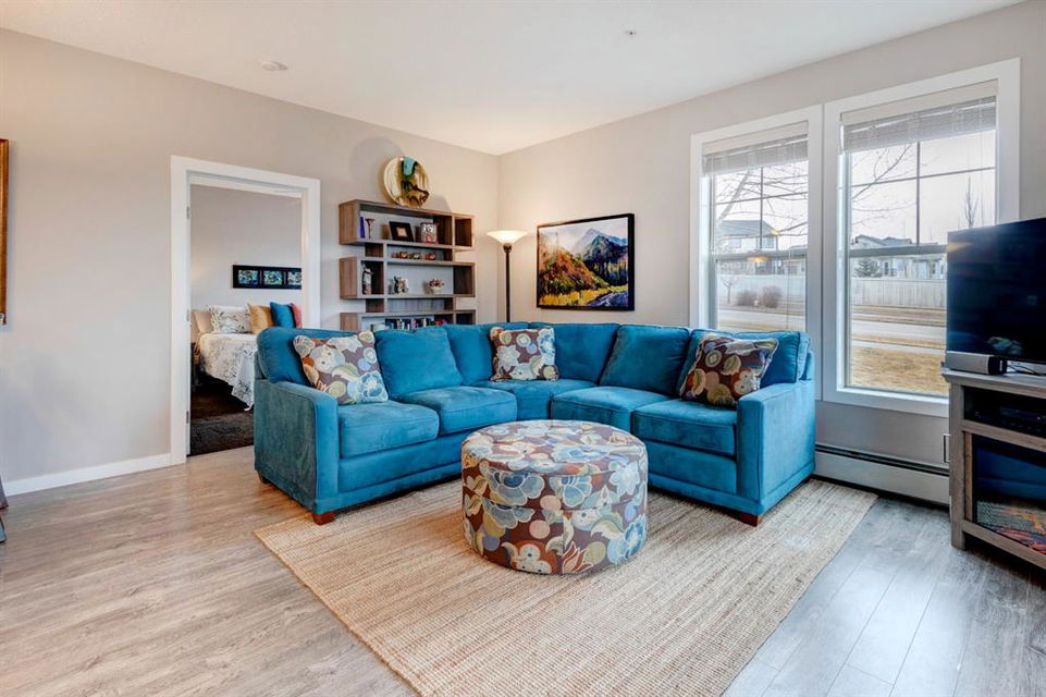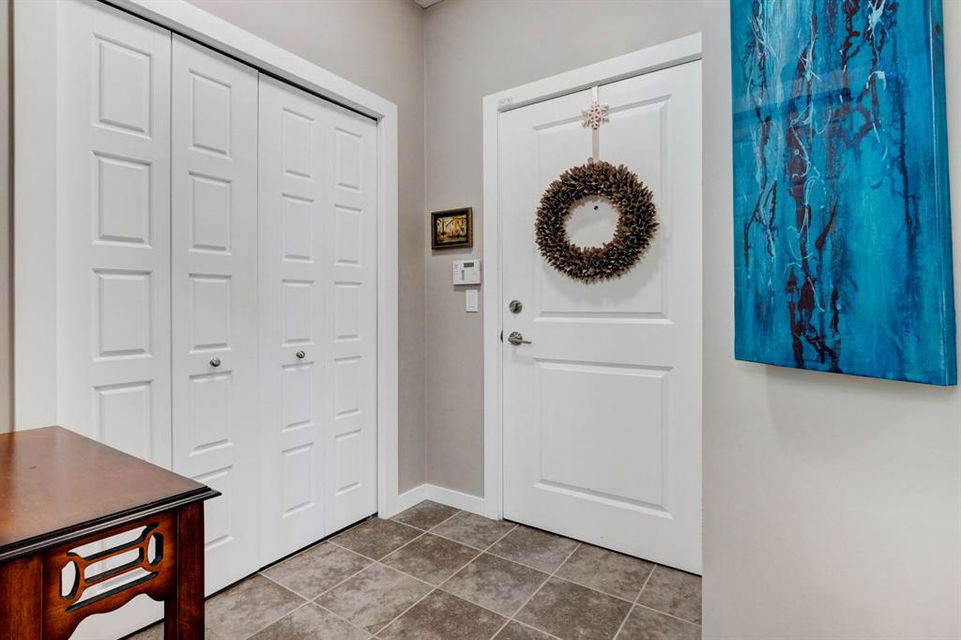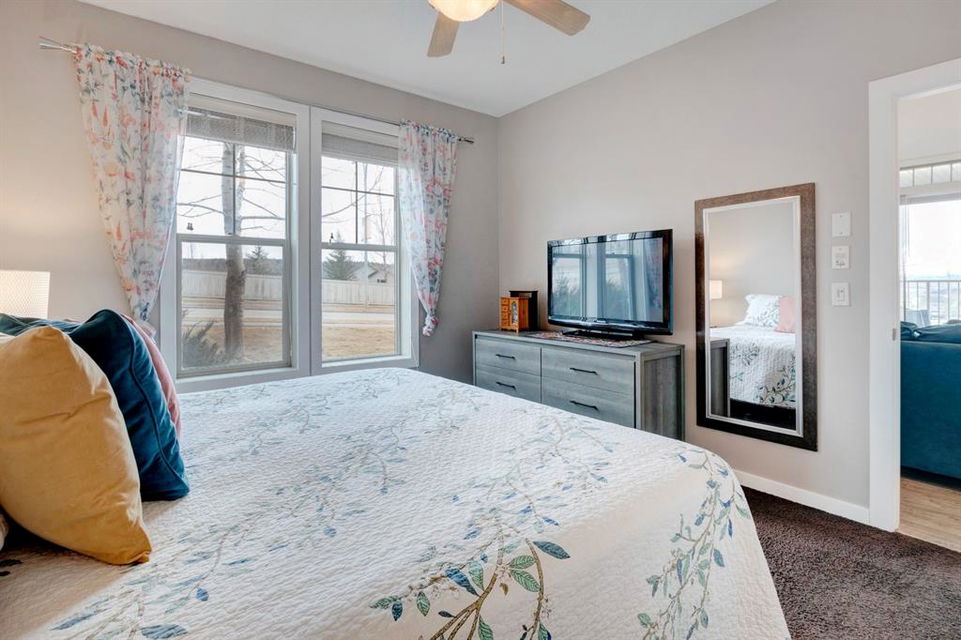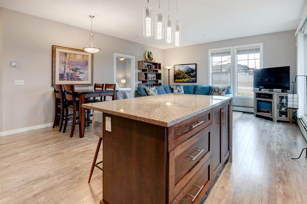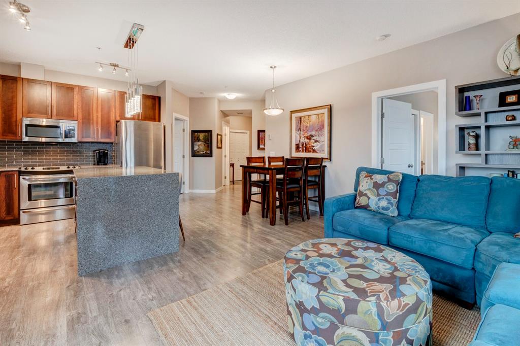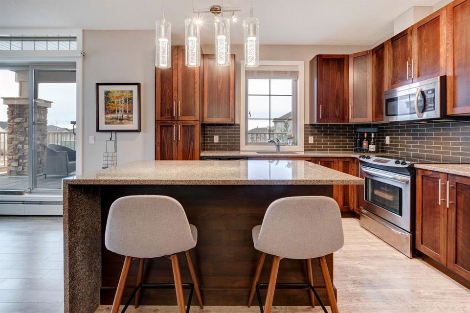 Spacious 2 bedroom, 2 bathroom corner unit with a great layout, modern finishings, 2 titled parking stalls, an oversized balcony, and a lovely mountain view! This bright, trendy condo offers an open floor plan, 9″ ceilings, plenty of windows and Hunter Douglas blinds throughout. The upgraded kitchen includes stained maple cabinetry, granite counters, island with seating for 2 and stainless steel appliances. The living room with patio doors leading to the expansive patio. The master bedroom easily accommodates a king size bed and has a walk-in closet and 3-piece ensuite. There is a 2nd bedroom, 4-piece bathroom, den with built-in desk and cabinetry, and a very handy and sizeable laundry room with storage space. This condo offers one of the largest patios in the complex where you can enjoy the mountain views and the convenience of having a gas line for your BBQ. The layout is excellent with the 2 bedrooms being on opposite sides of the condo and no wasted space. 2 titled parking stalls including one underground heated stall with a storage locker and one surface stall with plug-in. The Alora is a well-maintained complex with a fitness facility, guest suites and plenty of visitor parking stalls. This former show suite is sure to impress!