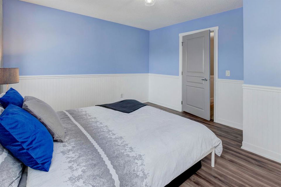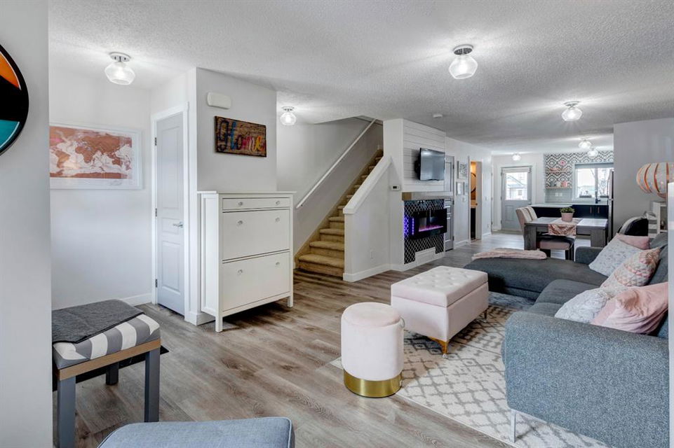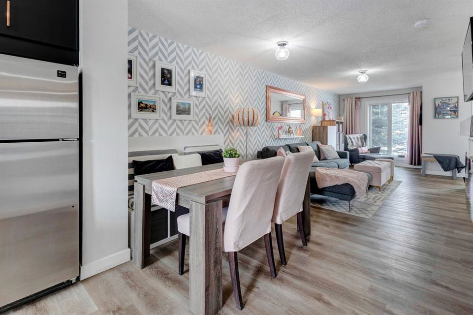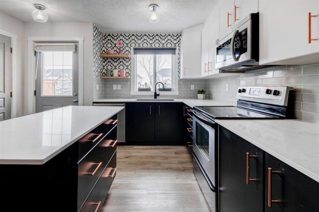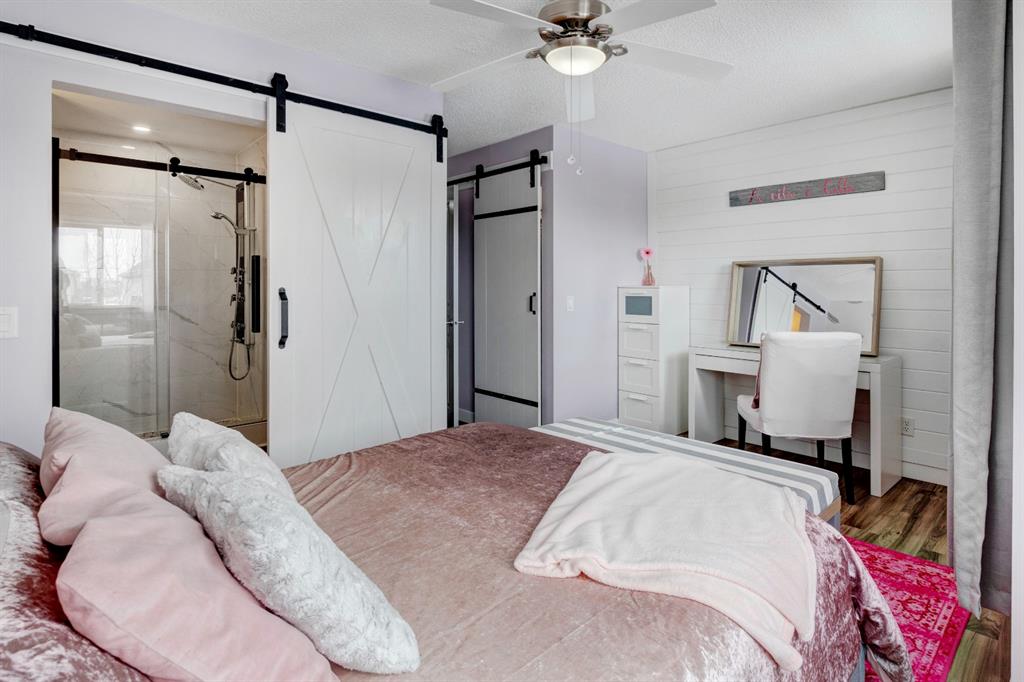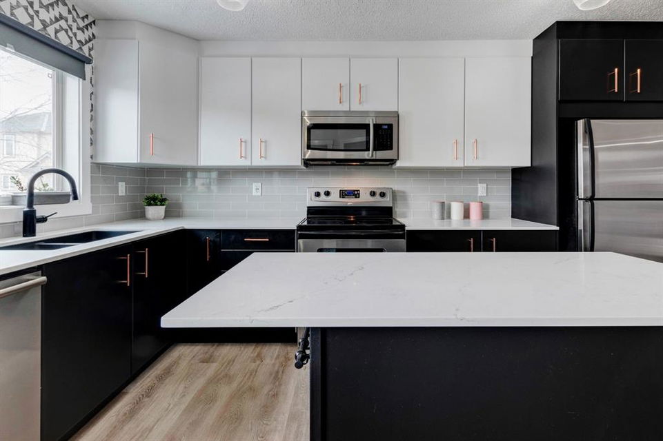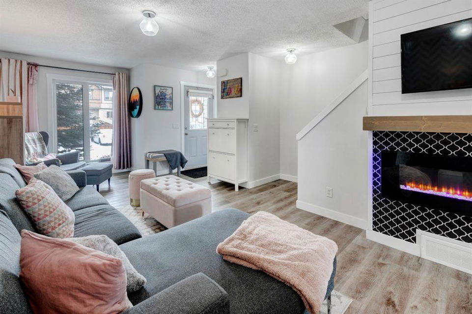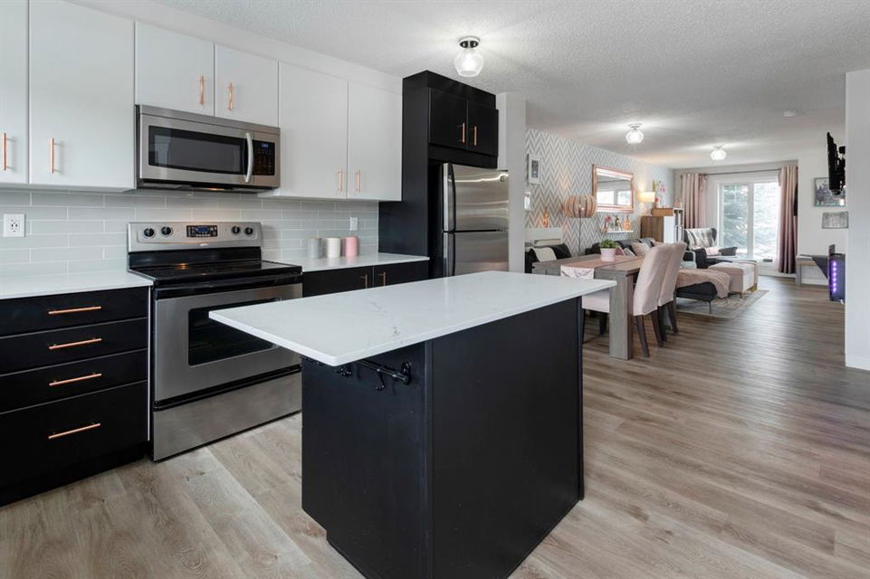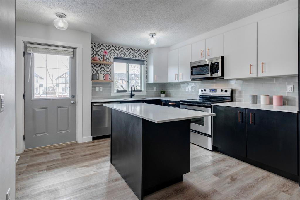 Welcome home to this extensively renovated, trendy, modern townhome in the pet-friendly Zen of King’s Heights complex. So many renovations over the past 4 years including the addition of an ensuite to the primary bedroom, upper level bathroom and powder room both fully renovated, quartz kitchen countertops added, kitchen cabinetry freshly painted, kitchen backsplash redone, vinyl plank flooring on the main floor, laminate flooring upstairs, new lighting, the addition of an electric fireplace with tile surround, plus doors and walls all painted. The open concept main floor offers a spacious kitchen with quartz countertops, an island with seating, full height cabinetry with modern hardware and open shelving, tiled backsplash, pantry and stainless steel appliances including a new dishwasher & over range microwave. The kitchen opens onto the dining area featuring an electric fireplace with a mantle, tile surround and beadboard wall above. The living room is bright, spacious and has a trendy chevron pattern feature wall. A stylish powder room with contemporary tile flooring and barn wood wall completes the main level. The upper level offers 2 bedrooms and 2 full bathrooms. The primary bedroom has a shiplap feature wall, walk-in closet with barn door, and a newly added ensuite with a fully tiled shower with built-in bench, shelf and rolling glass door, vinyl plank flooring, double vanity, modern backsplash and barn door. The second bedroom is a great size and space for a kids’ room or guest room and features wainscoting paneling, and the additional 4 piece bathroom upstairs is fully renovated including subway tiled shower/tub with multiple shower heads including body jets and rain drop, vinyl plank flooring, vanity and lighting. Unfinished basement with laundry including new washing machine, tonnes of storage space, bathroom rough-in and future potential to develop into useful living space. The west facing yard is fully fenced and private. This property is located in the middle of the complex backing onto an open area and the basketball court, and comes with 1 titled parking stall and 1 assigned parking stall. The shingles were replaced in 2019 and the front and back doors are in the plans to be replaced this year. The location is very convenient with Save on Foods, restaurants, playgrounds, fully fenced dog park, scenic walking trail around the pond, and schools all in the neighbourhood. Very well renovated property with trendy choices in finishes throughout, if you are looking for a modern place to call home, this is the place for you!