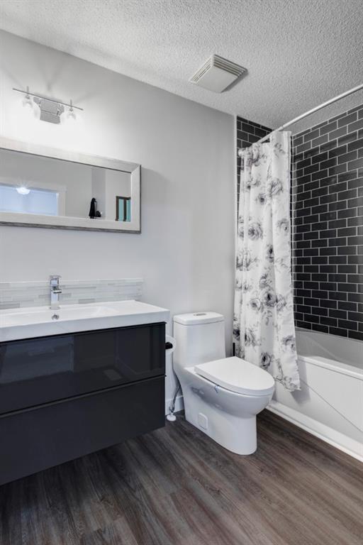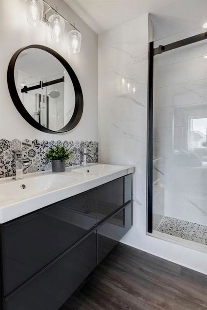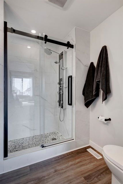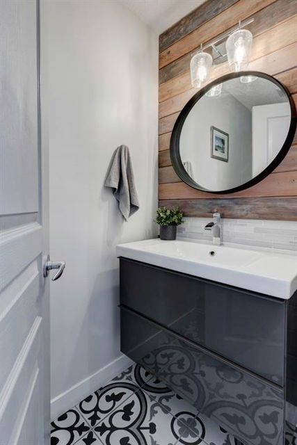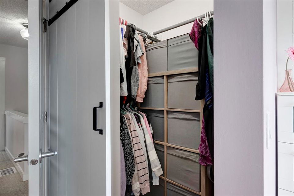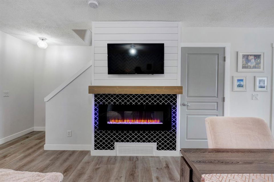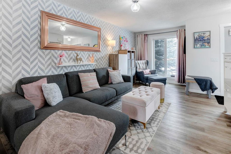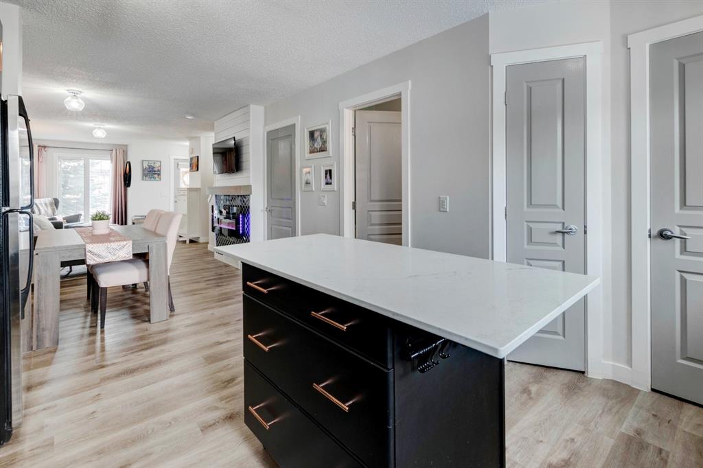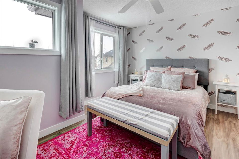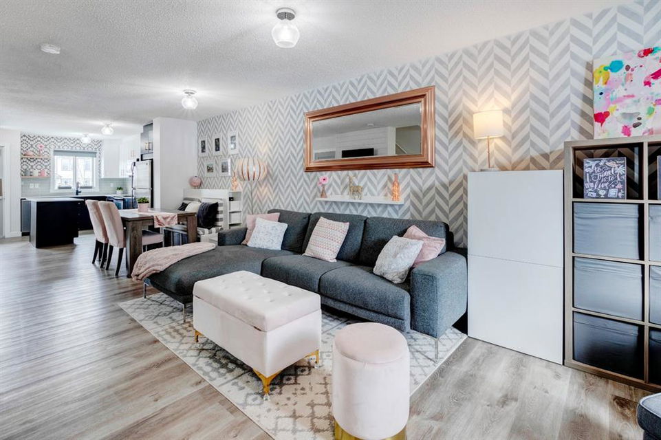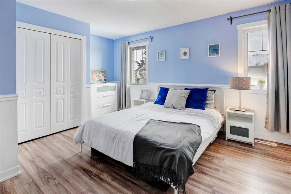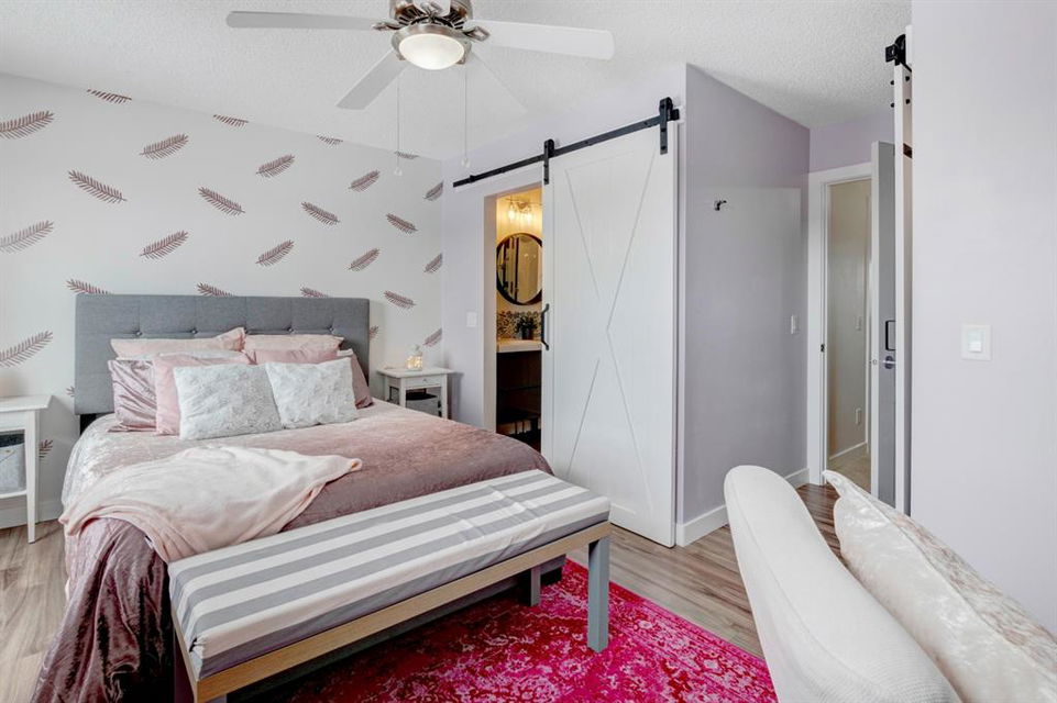 Welcome home to this extensively renovated, trendy, modern townhome in the pet-friendly Zen of King’s Heights complex. So many renovations over the past 4 years including the addition of an ensuite to the primary bedroom, upper level bathroom and powder room both fully renovated, quartz kitchen countertops added, kitchen cabinetry freshly painted, kitchen backsplash redone, vinyl plank flooring on the main floor, laminate flooring upstairs, new lighting, the addition of an electric fireplace with tile surround, plus doors and walls all painted. The open concept main floor offers a spacious kitchen with quartz countertops, an island with seating, full height cabinetry with modern hardware and open shelving, tiled backsplash, pantry and stainless steel appliances including a new dishwasher & over range microwave. The kitchen opens onto the dining area featuring an electric fireplace with a mantle, tile surround and beadboard wall above. The living room is bright, spacious and has a trendy chevron pattern feature wall. A stylish powder room with contemporary tile flooring and barn wood wall completes the main level. The upper level offers 2 bedrooms and 2 full bathrooms. The primary bedroom has a shiplap feature wall, walk-in closet with barn door, and a newly added ensuite with a fully tiled shower with built-in bench, shelf and rolling glass door, vinyl plank flooring, double vanity, modern backsplash and barn door. The second bedroom is a great size and space for a kids’ room or guest room and features wainscoting paneling, and the additional 4 piece bathroom upstairs is fully renovated including subway tiled shower/tub with multiple shower heads including body jets and rain drop, vinyl plank flooring, vanity and lighting. Unfinished basement with laundry including new washing machine, tonnes of storage space, bathroom rough-in and future potential to develop into useful living space. The west facing yard is fully fenced and private. This property is located in the middle of the complex backing onto an open area and the basketball court, and comes with 1 titled parking stall and 1 assigned parking stall. The shingles were replaced in 2019 and the front and back doors are in the plans to be replaced this year. The location is very convenient with Save on Foods, restaurants, playgrounds, fully fenced dog park, scenic walking trail around the pond, and schools all in the neighbourhood. Very well renovated property with trendy choices in finishes throughout, if you are looking for a modern place to call home, this is the place for you!
