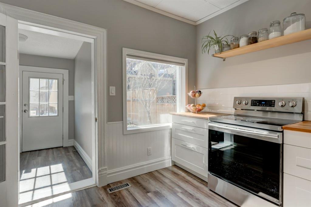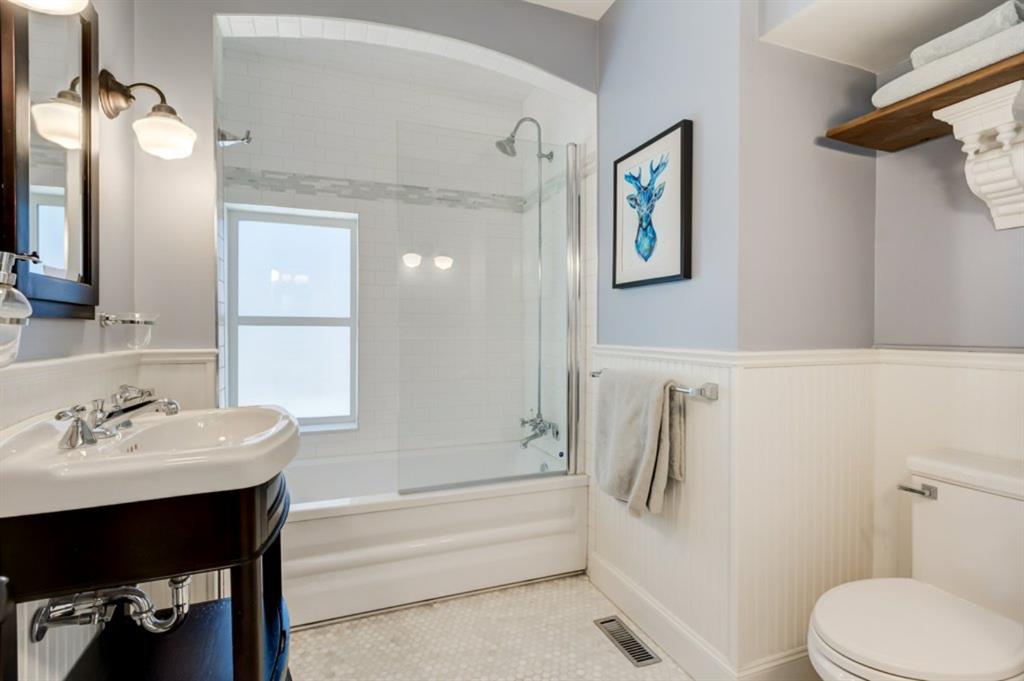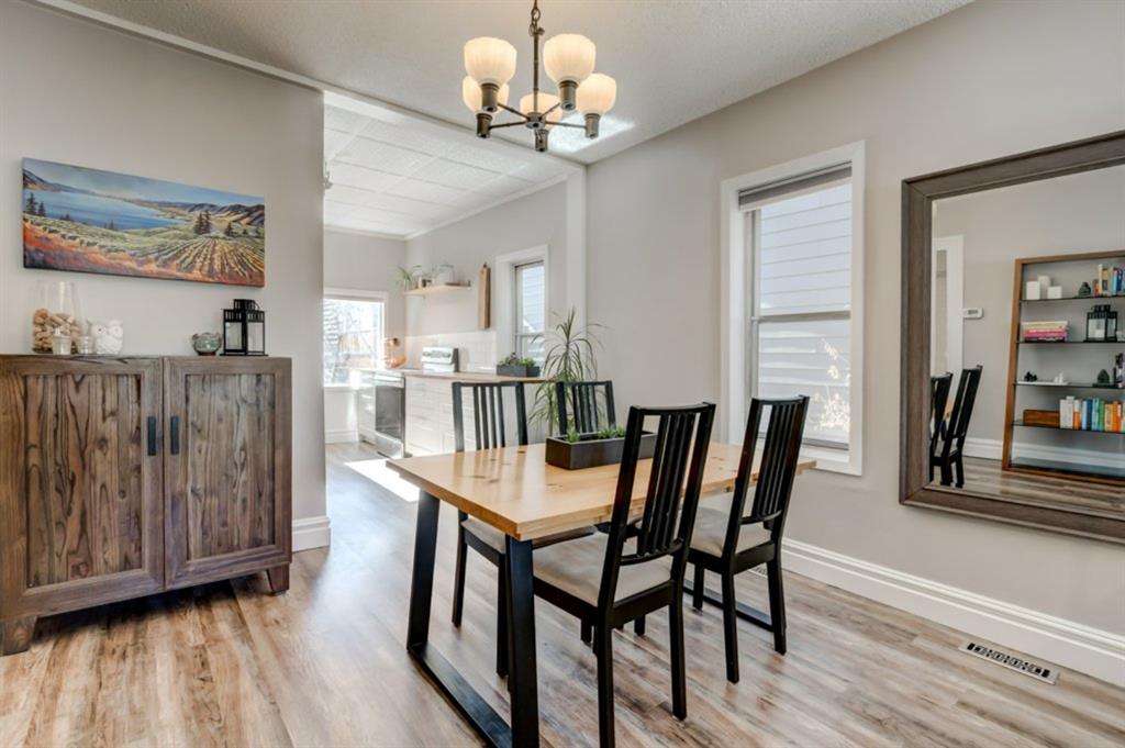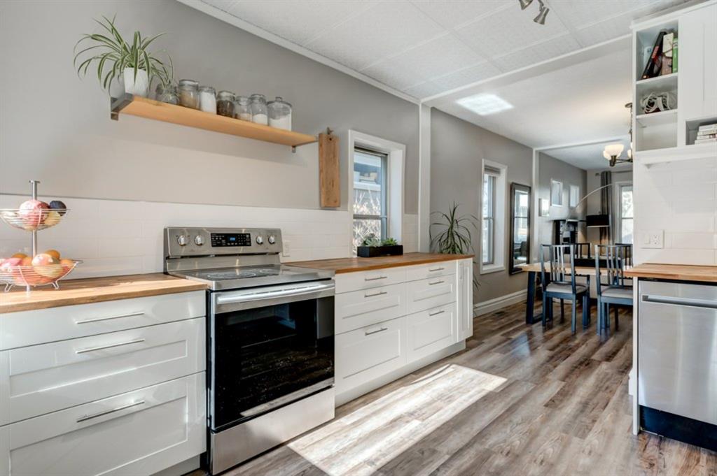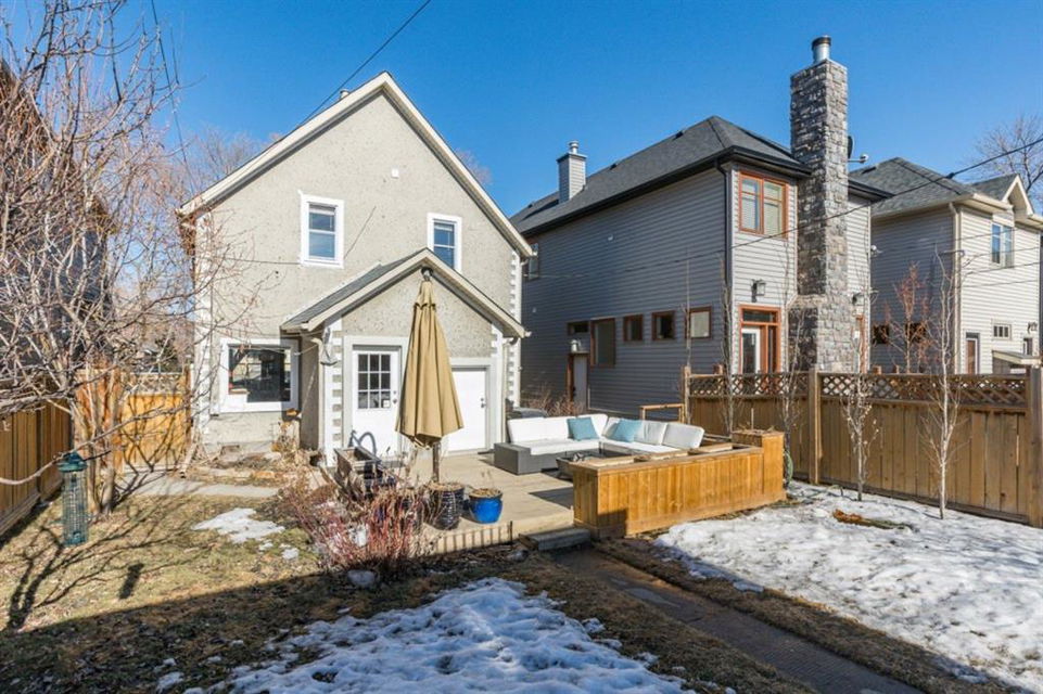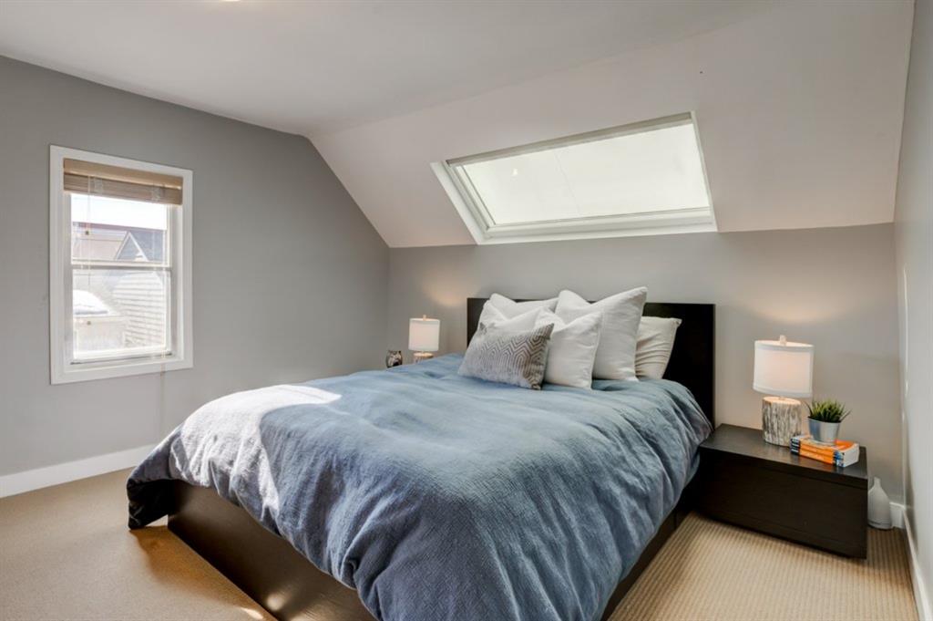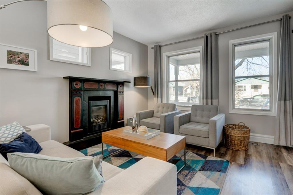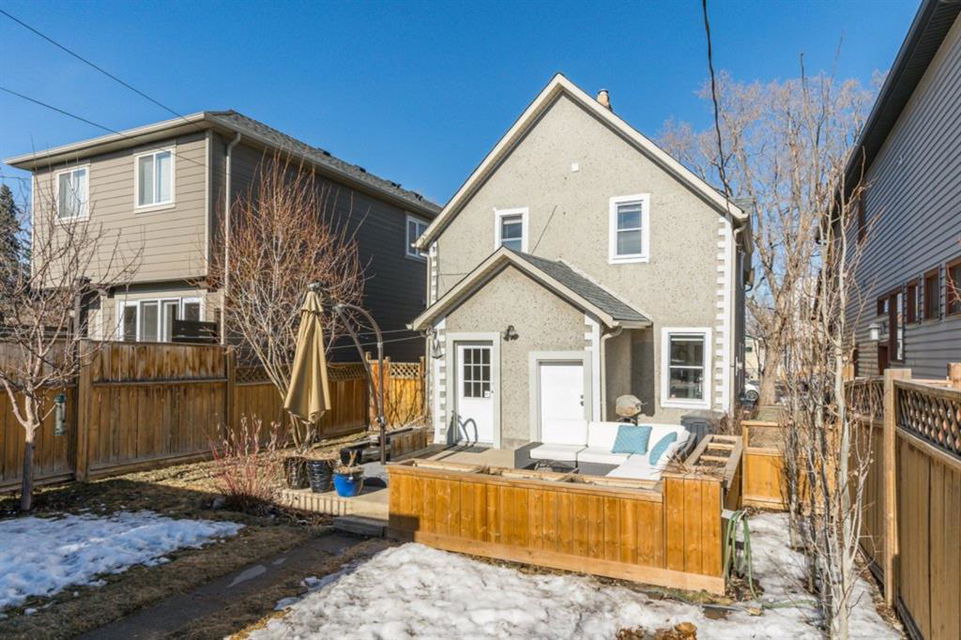 Charming and very nicely updated family home located just steps from the heart of Inglewood, on a large (33 ft x 123 ft) south facing lot with an oversized single garage. Many updates since 2017 including replacement of the shingles on the house (2020), kitchen renovation (2020/2021) including new stainless steel appliances, opening up the main floor layout (2020), vinyl plank flooring (2020), baseboards and paint throughout (2020) and insulation added to the attic in 2018. The open concept main floor offers a living room with gas fireplace, dining room, renovated kitchen with stainless steel appliances, butcher block counters, white cabinetry and subway tile backsplash. 2 bedrooms on the main floor that double as home offices or storage and modern 4 piece bathroom with heated marble floor. Upper level with huge master bedroom that easily accommodates a king size bed, additional furniture and has a large closet. Completing the upper level is a 3 piece bathroom, 2 more bedrooms (do not have closets) and bonus room that is perfect for a TV area, den or could be converted into another bedroom. The bright basement has a great laundry area and plenty of storage space. Plumbing and electrical have been modernized from 2004-2009 and high efficiency basement furnace installed in 2013. Sunny, south facing yard with deck, planters, space for a garden, mature trees and a large 20′ x 16′ oversized single garage built in 2007. Fantastic location with easy access to the pathway system and just 2 blocks from 9th Avenue and all of the amenities that Inglewood offers. Charming century home with many modern updates, must be seen to be fully appreciated!
