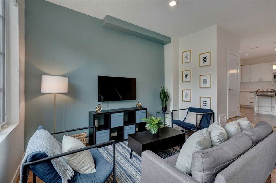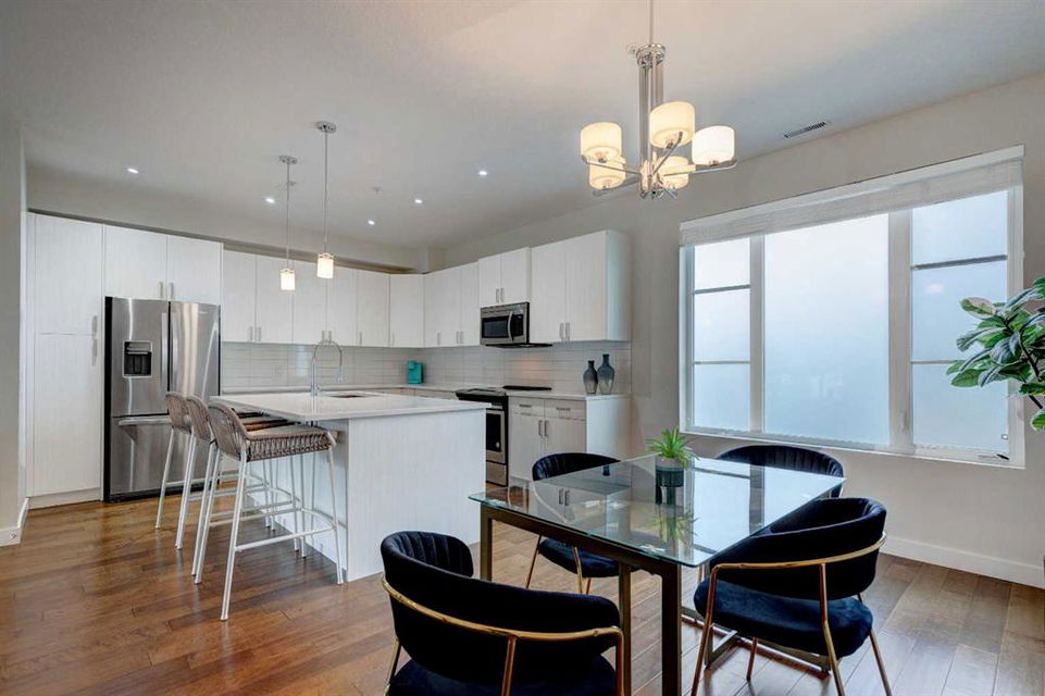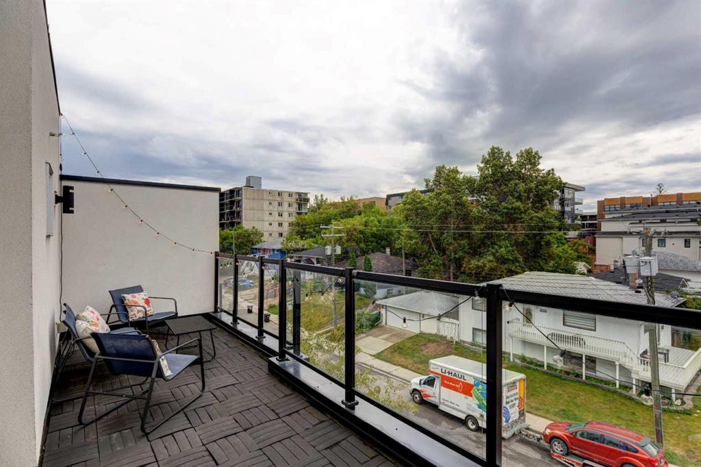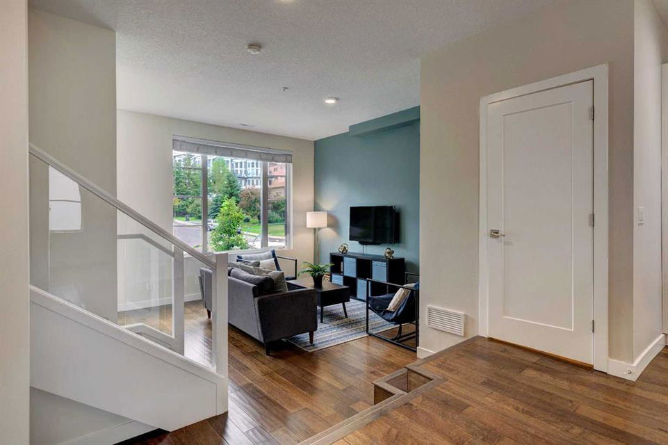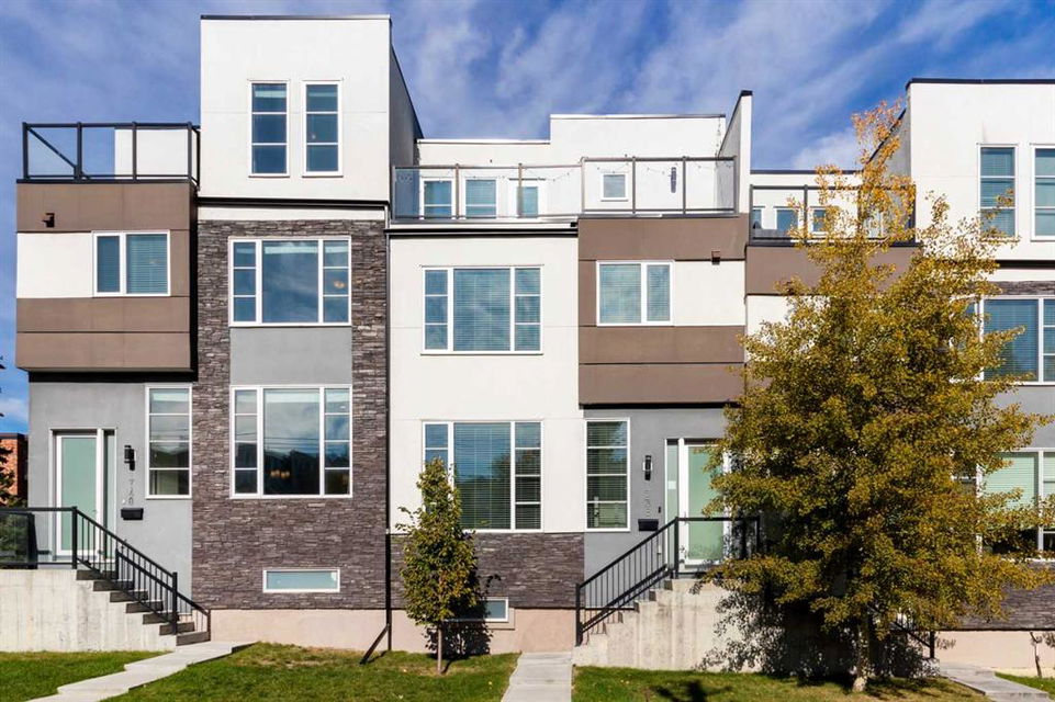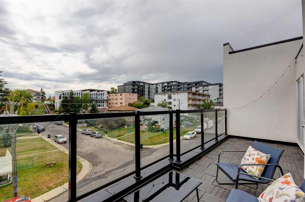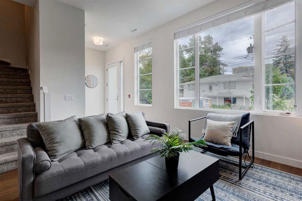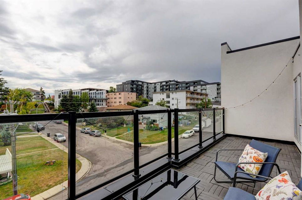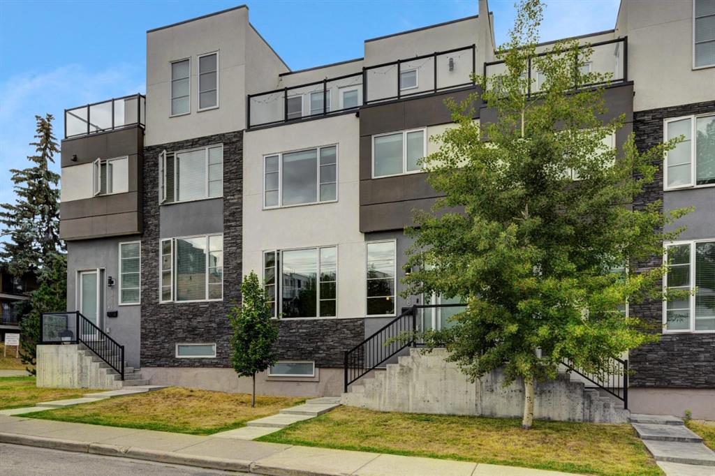 Welcome to this trendy and very well-maintained 1848 sq ft, 3-storey, 3 bedroom, 3.5 bathroom townhouse with a great layout, quality finishings and underground parking. Upon entering you are greeted with a spacious foyer with walk-in closet, and a bright living room with large south facing windows. Spacious and modern kitchen with plenty of cabinetry, quartz countertops, island seating for 3, and stainless steel appliances. The dining room with space for a table plus additional furniture is conveniently right beside the kitchen. The powder room completes the main floor. The 2nd level has 2 bedrooms, including the primary bedroom with large windows, walk-in closet, and modern ensuite with 2 sinks, quartz countertops, large soaker tub and a tiled shower with glass door. The 2nd bedroom is also spacious and is located next to the 2nd full bathroom. The laundry room with built-in cabinetry and utility room completes this level. The 3rd level hosts the 3rd large bedroom with hardwood flooring, a 3-piece ensuite, and access to the beautiful 23 ft x 8 ft south-facing sunny balcony. This level would make an amazing at home office or TV room if you do not require the 3rd bedroom. The basement level is the mudroom with storage space and access to the underground heated parkade. One parking stall (with space for storage) is included with this unit. This complex is in excellent condition and has been extremely well-maintained by the owner, who has owned all 5 units since the complex was built. Excellent inner city Bankview location with quick access to downtown, 14th Street, 17th Ave, and Marda Loop. Close to many parks including the Bankview Dog Park, Buckmaster Park and 20th Street playground. Furniture and furnishings are available for purchase. Don’t miss out on this excellent opportunity to call this property your new home!