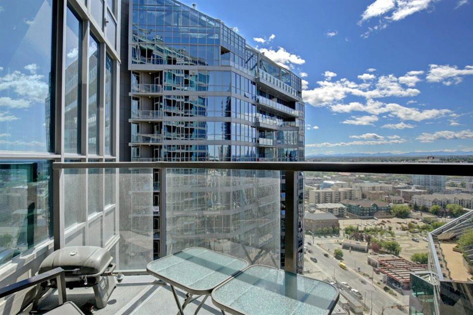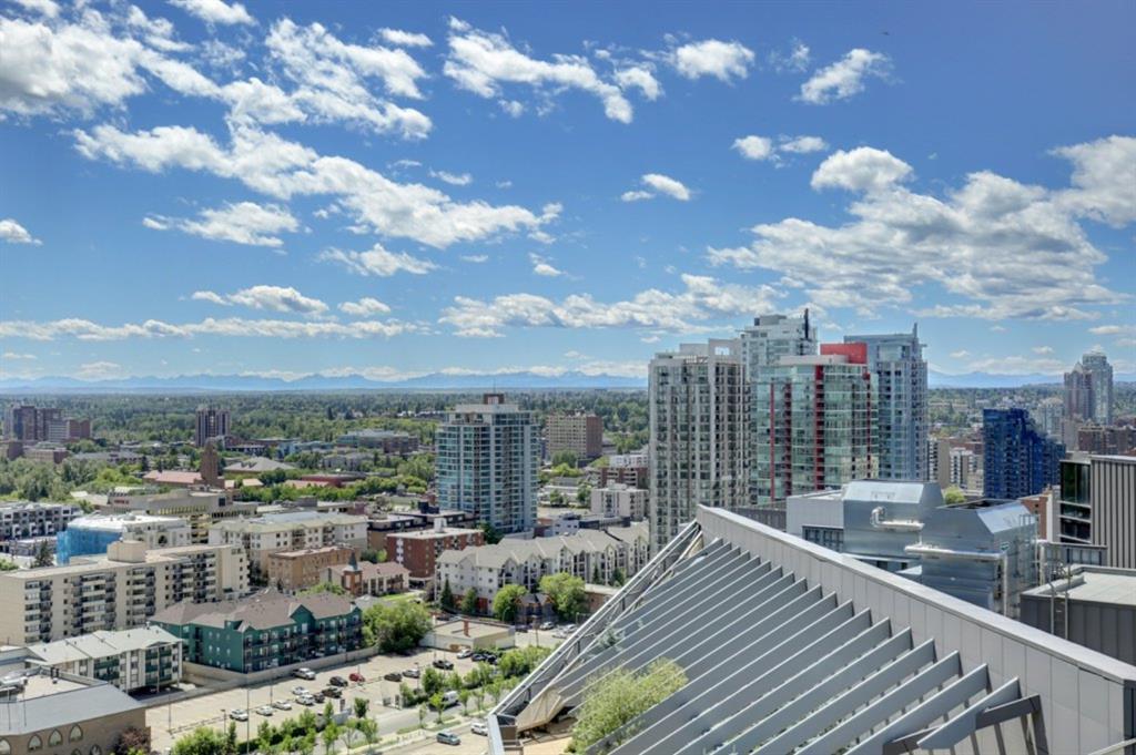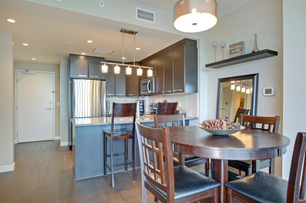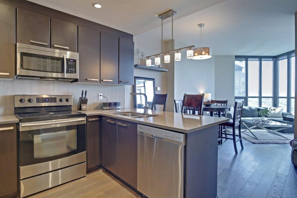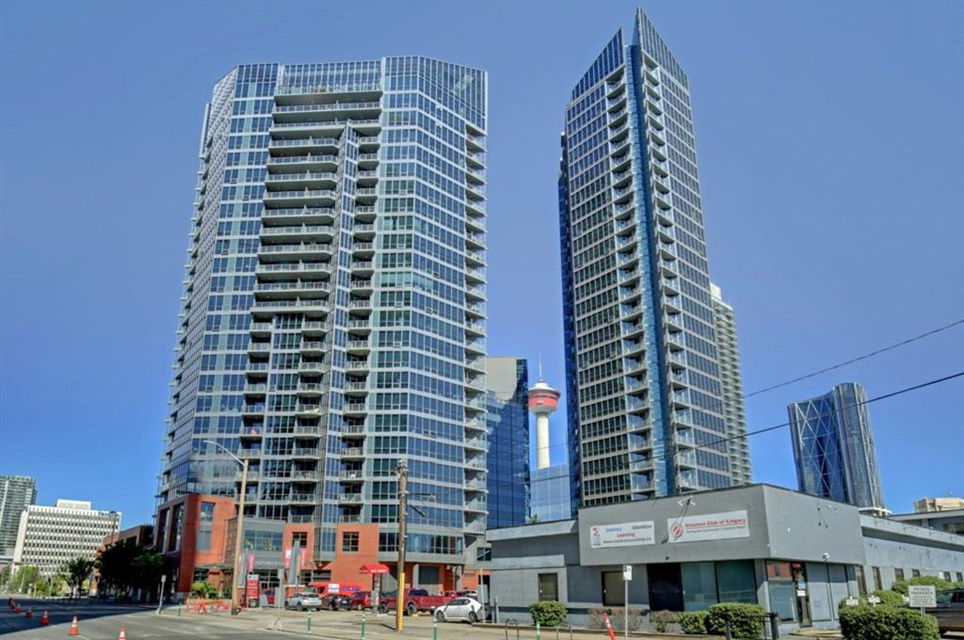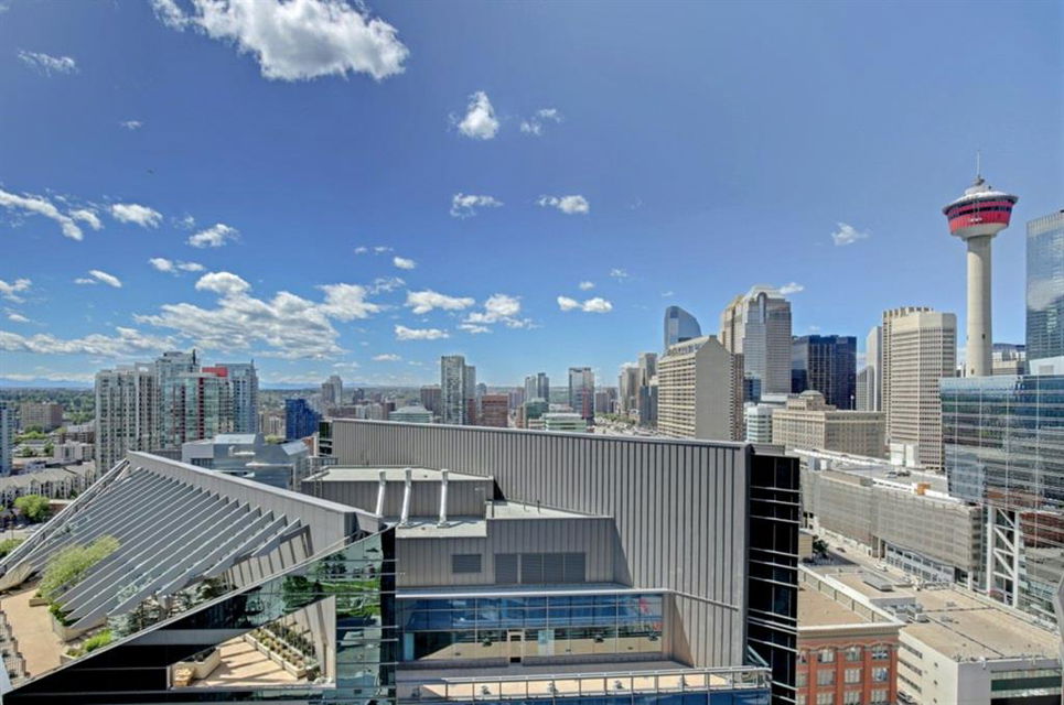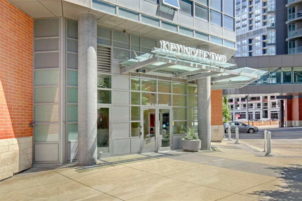 Located on the 22nd floor of Keynote 2, this SW facing condo offers beautiful views, plenty of natural light and a very functional floor plan. Open concept kitchen with quartz counters, stainless steel appliances and breakfast bar opens onto the dining area that can easily accommodate a table for 4 or 6. Just off of the kitchen an additional bank of upper & lower cabinets with butcher block counter top has been added creating lots of extra storage. Living room offers several windows with great city & mountain views and access to the balcony that can accommodate a couple of chairs and a small table. Spacious bedroom, 4 piece bathroom and laundry room complete this trendy condo. Added bonuses include NO structural pillars impeding the space, central air conditioning, added kitchen storage and high floor location with beautiful views. HUGE titled parking stall that measures 15’10″x14’5″ and is conveniently located just steps from the elevator. Titled storage locker included too. Vacant and ready for quick possession. Building amenities include fitness facility, hot tub, multi purpose/games room, plus 15 outdoor space and guest suites. Get to Sunterra Market without going outside, quick walk to downtown, Saddledome and the C-Train. Well kept condo in an extremely desirable location, being sold by the original owner. Builder size 626 sq ft.