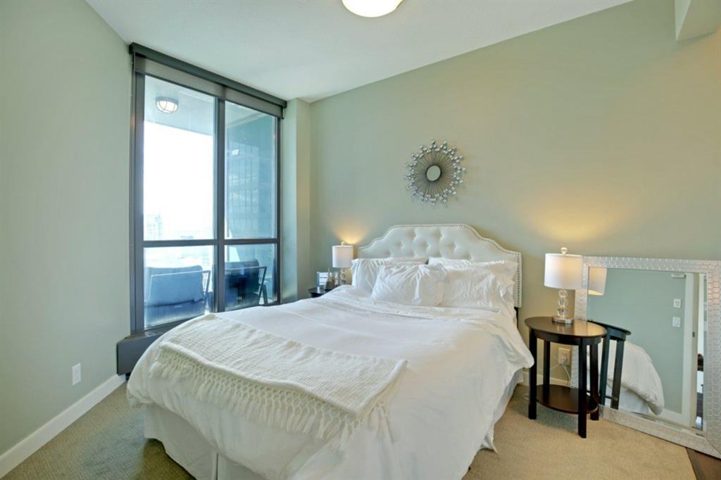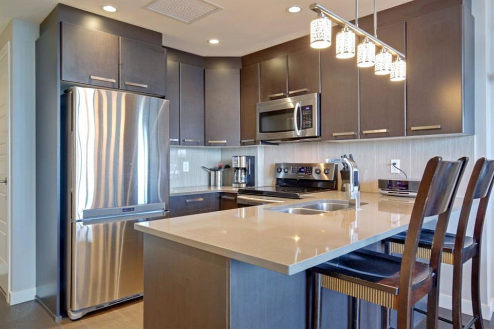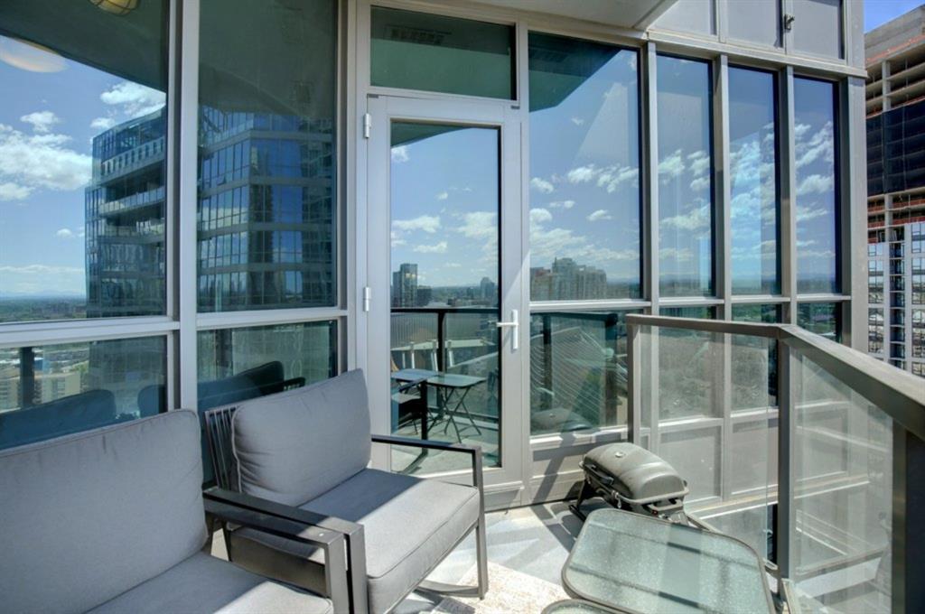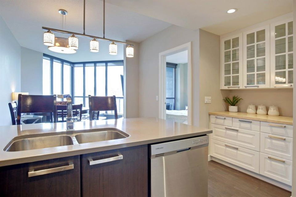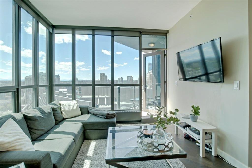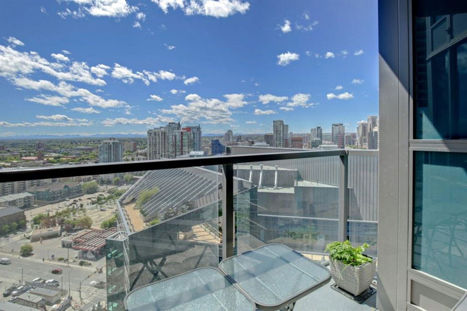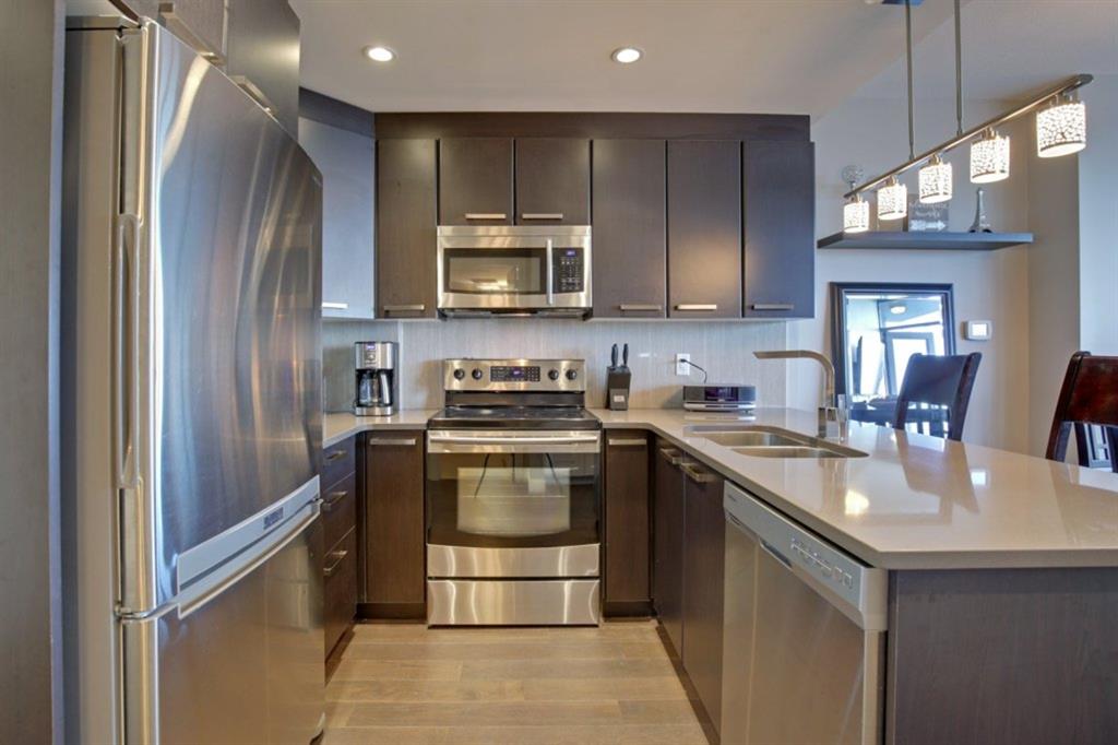 Located on the 22nd floor of Keynote 2, this SW facing condo offers beautiful views, plenty of natural light and a very functional floor plan. Open concept kitchen with quartz counters, stainless steel appliances and breakfast bar opens onto the dining area that can easily accommodate a table for 4 or 6. Just off of the kitchen an additional bank of upper & lower cabinets with butcher block counter top has been added creating lots of extra storage. Living room offers several windows with great city & mountain views and access to the balcony that can accommodate a couple of chairs and a small table. Spacious bedroom, 4 piece bathroom and laundry room complete this trendy condo. Added bonuses include NO structural pillars impeding the space, central air conditioning, added kitchen storage and high floor location with beautiful views. HUGE titled parking stall that measures 15’10″x14’5″ and is conveniently located just steps from the elevator. Titled storage locker included too. Vacant and ready for quick possession. Building amenities include fitness facility, hot tub, multi purpose/games room, plus 15 outdoor space and guest suites. Get to Sunterra Market without going outside, quick walk to downtown, Saddledome and the C-Train. Well kept condo in an extremely desirable location, being sold by the original owner. Builder size 626 sq ft.