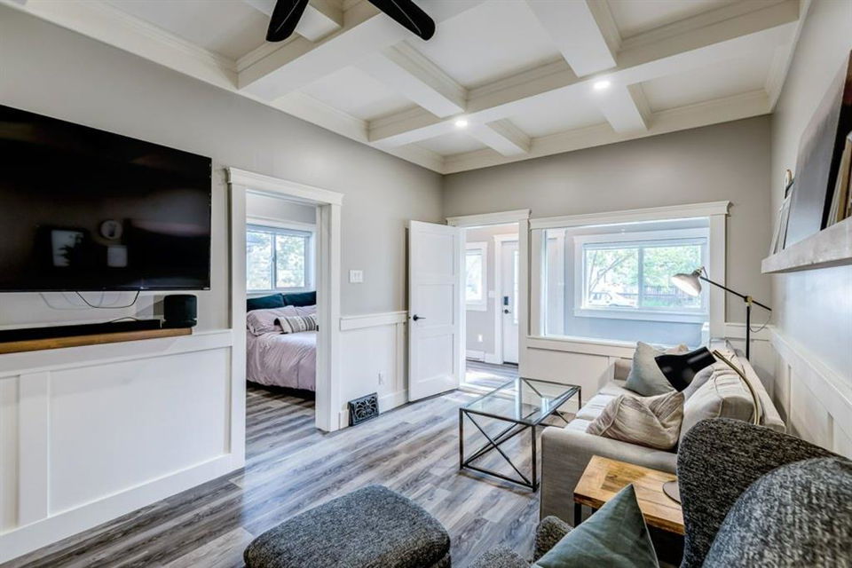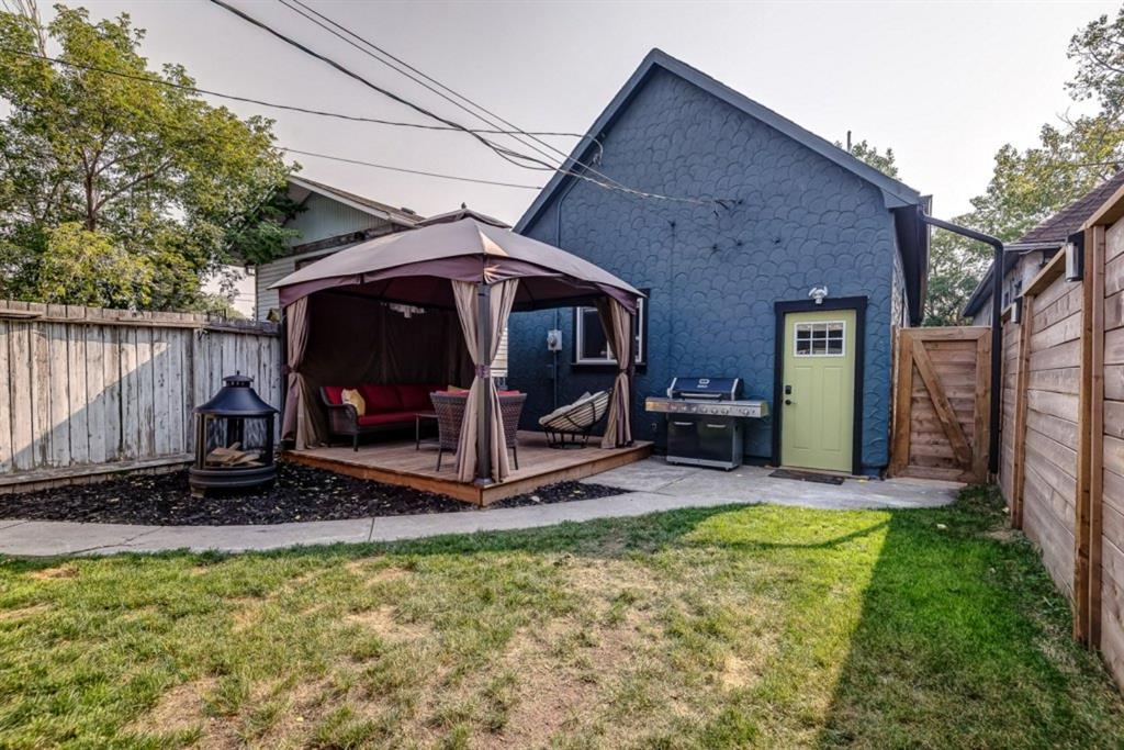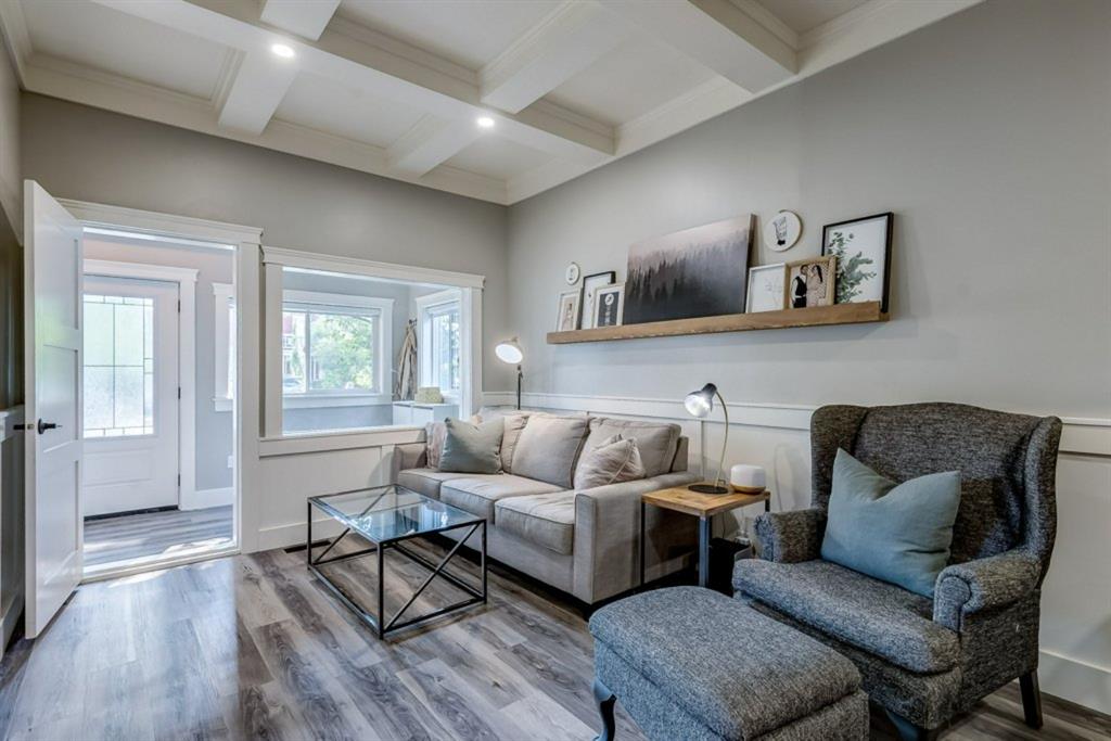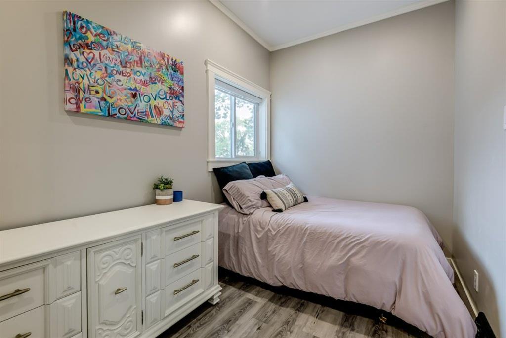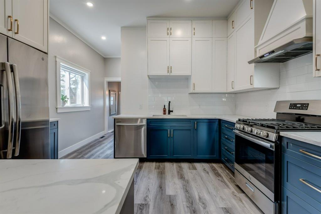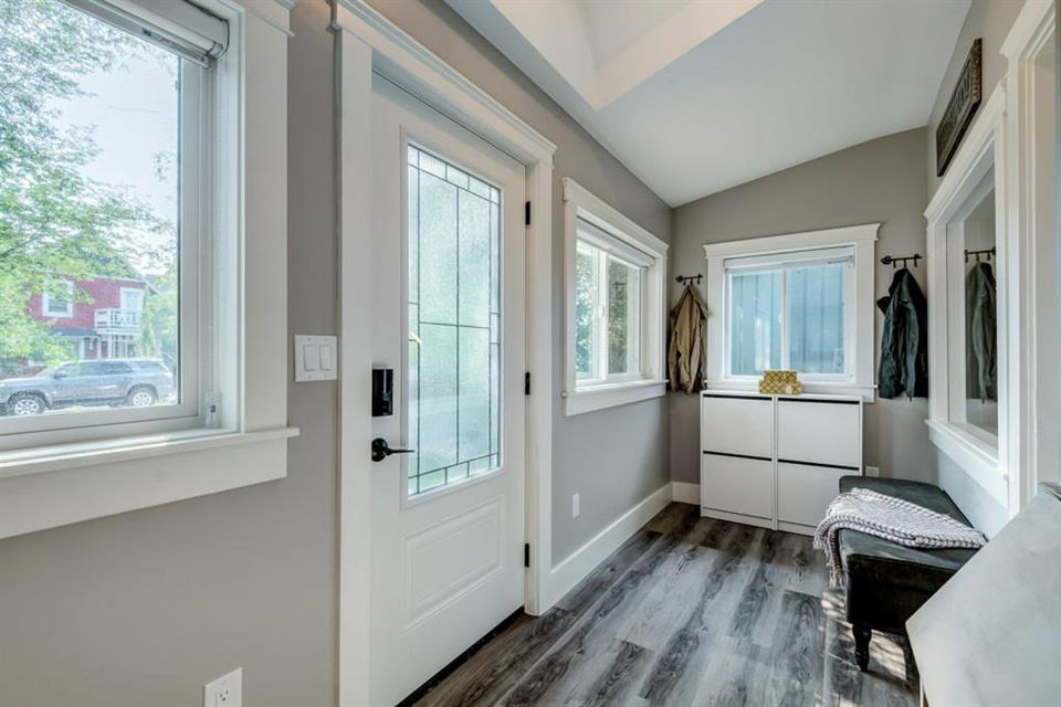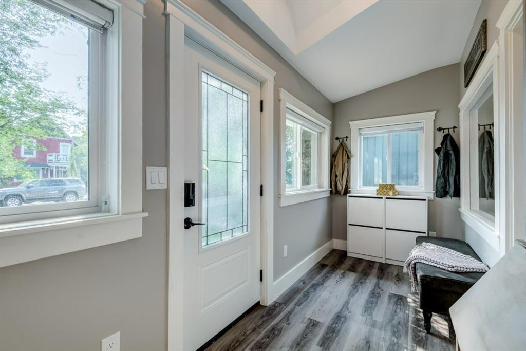 Charming and professionally renovated 2 bedroom character home located on a beautiful tree lined street in Inglewood. The open concept main floor offers a modern kitchen featuring full height custom made and lacquered cabinetry with soft close hardware, quartz countertops, stainless steel appliances, subway tile backsplash and pantry. Living room with wainscotting and coffered ceiling opens onto the dining area with a built-in shelf. The primary bedroom features a custom cabinetry closet system and the second bedroom also has a custom closet with barn door. Beautiful 4 piece bathroom with tiled stand up shower, re-finished clawfoot tub, custom vanity with quartz countertop and linen closet. The front porch has been rebuilt, insulated, electrical and radiant heat added and now offers a great flex space that can be used as a mud room, foyer or even as an at home office. The main floor offers 9’7″ ceilings, all new paint (walls and ceilings), trim and vinyl plank floors. Extensive list of renovations over the past 2 years including : new custom kitchen and bathroom, vinyl plank flooring throughout main level, paint, trim, LED pot lights, ceiling fans, all new appliances, all new windows on the main floor, new window coverings, new exterior doors with Weiser smart locks, 60 gallon hot water tank, Lennox high efficiency furnace, shingles replaced on the house, eavestroughs replaced on the house and garage, Hardie Board siding on the front of the house, stucco painted on the house and garage, new ABS sewer line from sidewalk to house, new deck, and the list goes on! Laundry, storage space and utilities are in the unfinished basement . West facing, fully fenced yard with deck, oversized double detached garage and parking pad for your trailer or extra vehicles. Located just steps from an off leash dog park, walking distance to the Inglewood Bird Sanctuary and pathways. An amazing move in ready home where all of the work has been done for you, just move in and enjoy!