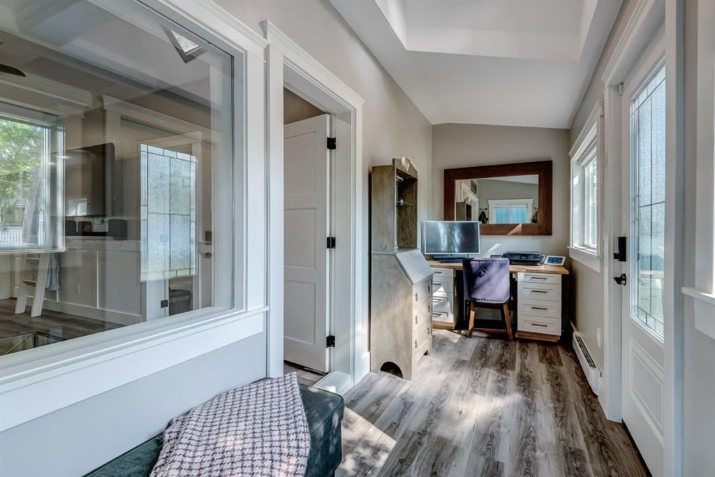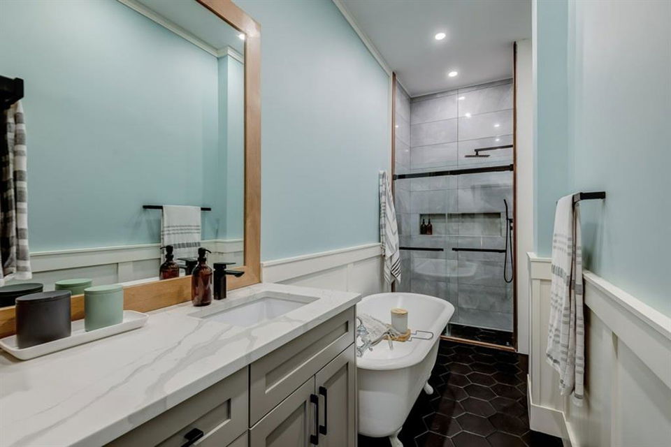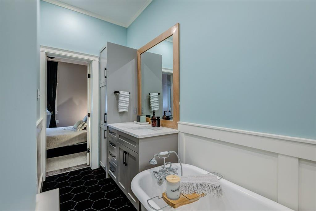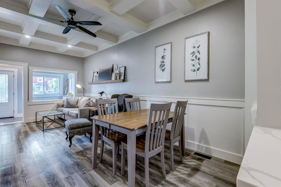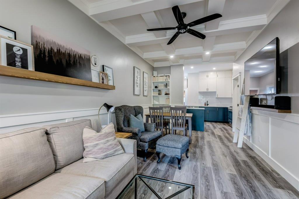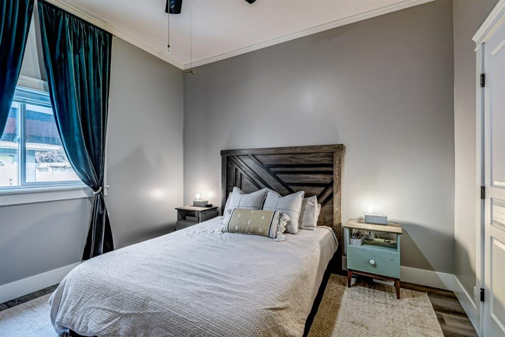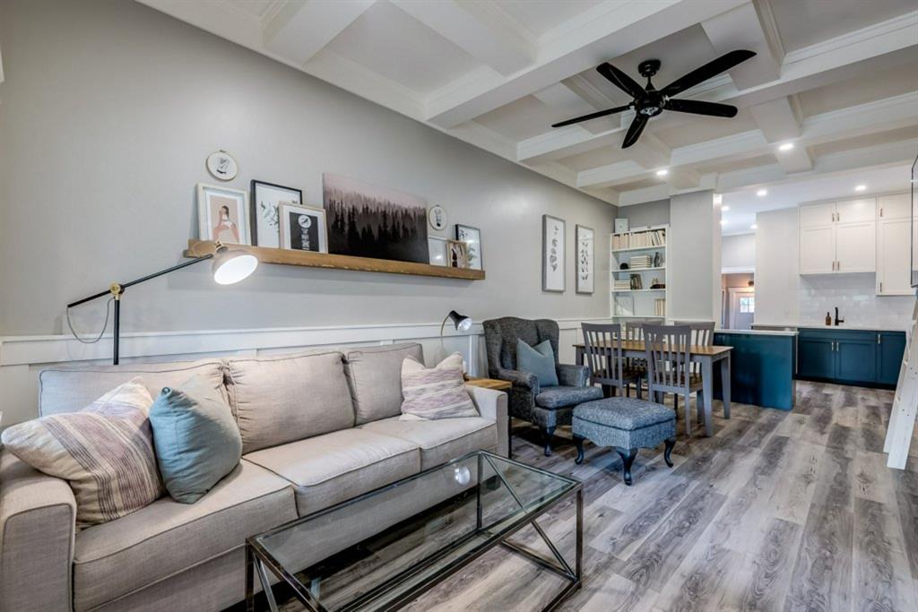 Charming and professionally renovated 2 bedroom character home located on a beautiful tree lined street in Inglewood. The open concept main floor offers a modern kitchen featuring full height custom made and lacquered cabinetry with soft close hardware, quartz countertops, stainless steel appliances, subway tile backsplash and pantry. Living room with wainscotting and coffered ceiling opens onto the dining area with a built-in shelf. The primary bedroom features a custom cabinetry closet system and the second bedroom also has a custom closet with barn door. Beautiful 4 piece bathroom with tiled stand up shower, re-finished clawfoot tub, custom vanity with quartz countertop and linen closet. The front porch has been rebuilt, insulated, electrical and radiant heat added and now offers a great flex space that can be used as a mud room, foyer or even as an at home office. The main floor offers 9’7″ ceilings, all new paint (walls and ceilings), trim and vinyl plank floors. Extensive list of renovations over the past 2 years including : new custom kitchen and bathroom, vinyl plank flooring throughout main level, paint, trim, LED pot lights, ceiling fans, all new appliances, all new windows on the main floor, new window coverings, new exterior doors with Weiser smart locks, 60 gallon hot water tank, Lennox high efficiency furnace, shingles replaced on the house, eavestroughs replaced on the house and garage, Hardie Board siding on the front of the house, stucco painted on the house and garage, new ABS sewer line from sidewalk to house, new deck, and the list goes on! Laundry, storage space and utilities are in the unfinished basement . West facing, fully fenced yard with deck, oversized double detached garage and parking pad for your trailer or extra vehicles. Located just steps from an off leash dog park, walking distance to the Inglewood Bird Sanctuary and pathways. An amazing move in ready home where all of the work has been done for you, just move in and enjoy!