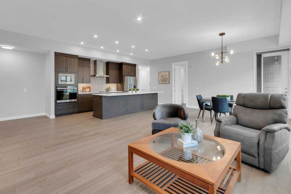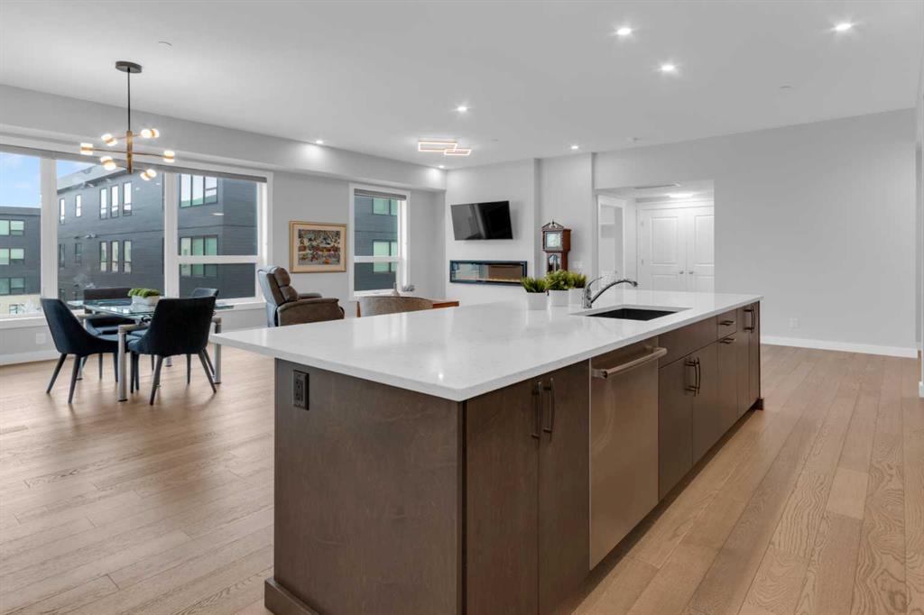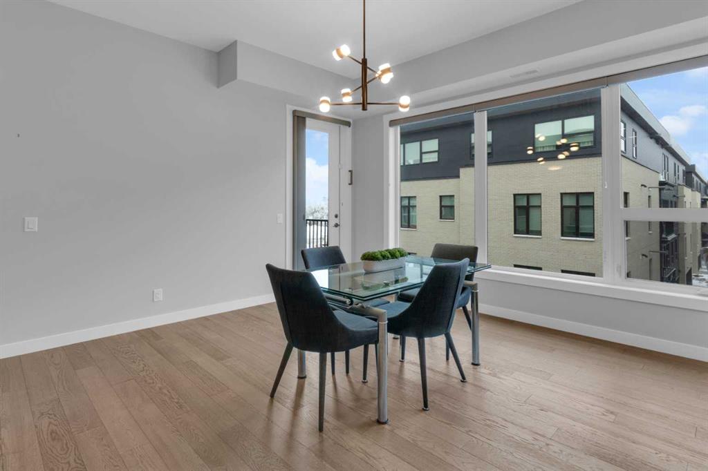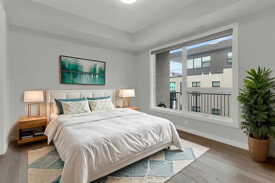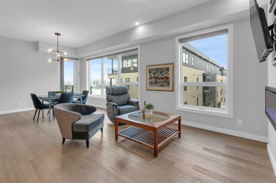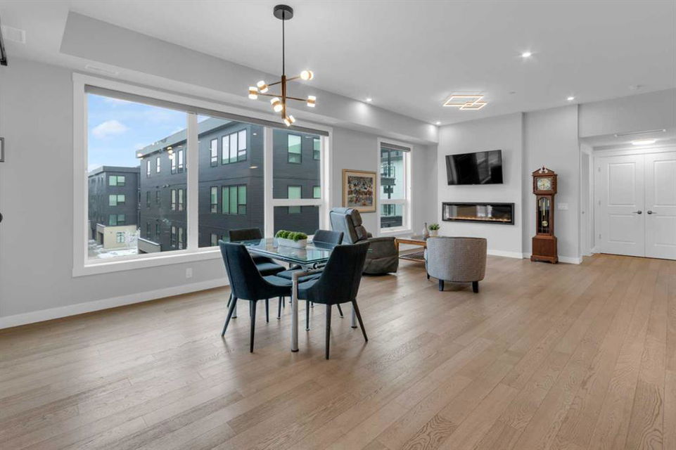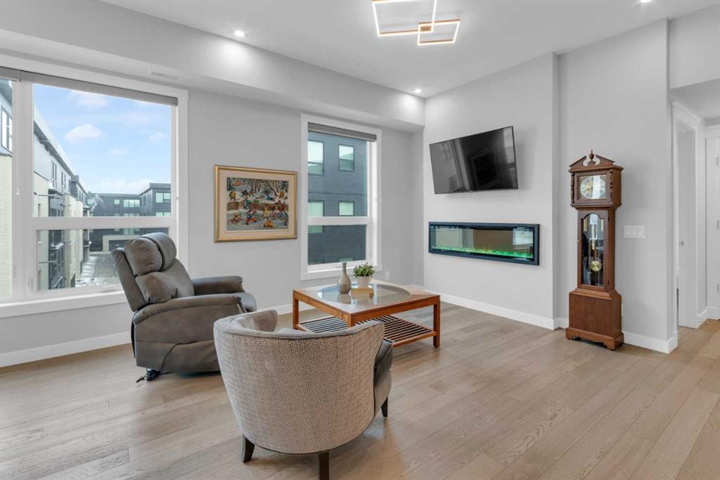 Welcome to Capella in University District, a small condo building with only 8 Estate Style single level luxury homes. This spacious and well laid-out 2 bedroom, 2 bathroom condo with single garage is just steps away from all of the amenities this highly desirable community offers. Located on the third floor is this modern residence with hardwood flooring, 10 foot ceilings, many large windows, central air conditioning, designer bathrooms and well-equipped spacious kitchen. The open concept main living space is flooded with natural light and features a sleek kitchen with expansive island, quartz countertops and full height cabinetry. The kitchen opens directly on to the dining space, the living room with electric fireplace, and a nook that works well for a den/office or as space for additional furniture. The bright primary suite offers enough space for a king size bed, a walk-in closet, and a 5-piece ensuite with heated floors, free standing tub, dual vanity, and fully tiled walk-in shower. The second bedroom has a murphy bed, a full bathroom across the hall, and is located on the other side of the condo from the primary bedroom, providing privacy between the bedrooms. Enjoy the morning sunrise on the spacious east-facing covered balcony that is equipped with a gas line for your BBQ or heater and a water line. The private, heated singe garage is attached to the building has epoxy floors, storage space, and a water softener for the condo unit. This well cared for building is part of a 7 building complex that offers a fitness centre, visitor parking, and courtyard spaces. Conveniently situated within walking distance to a grocery store, restaurants and coffee shops. Steps away from Market Mall, the U of C and the Children’s Hospital and a quick commute to downtown and access out to the mountains.