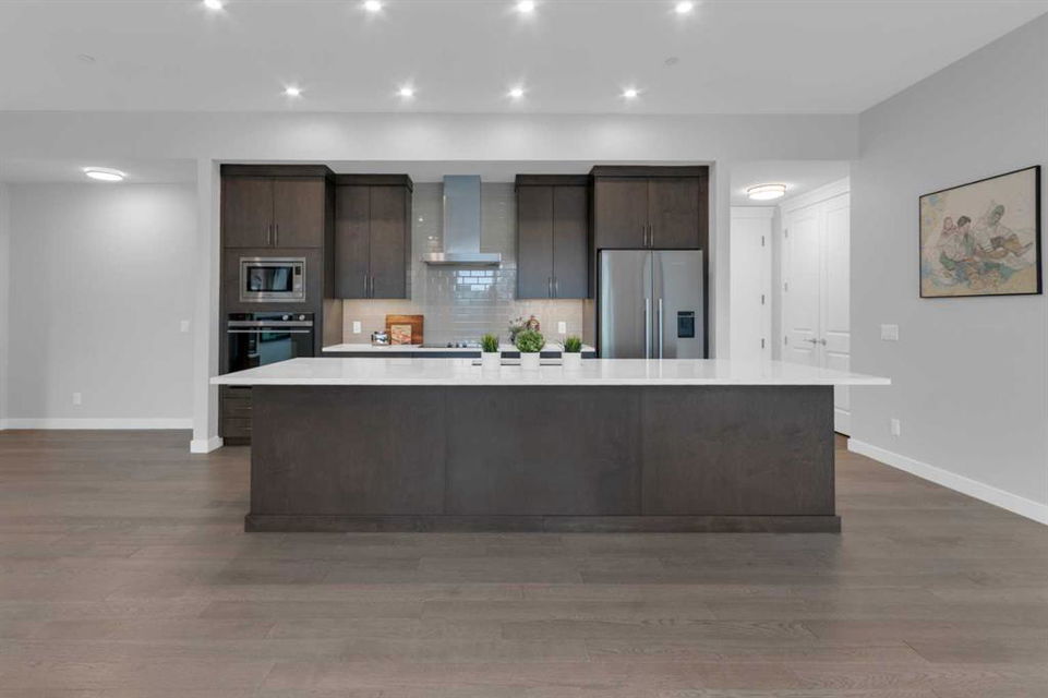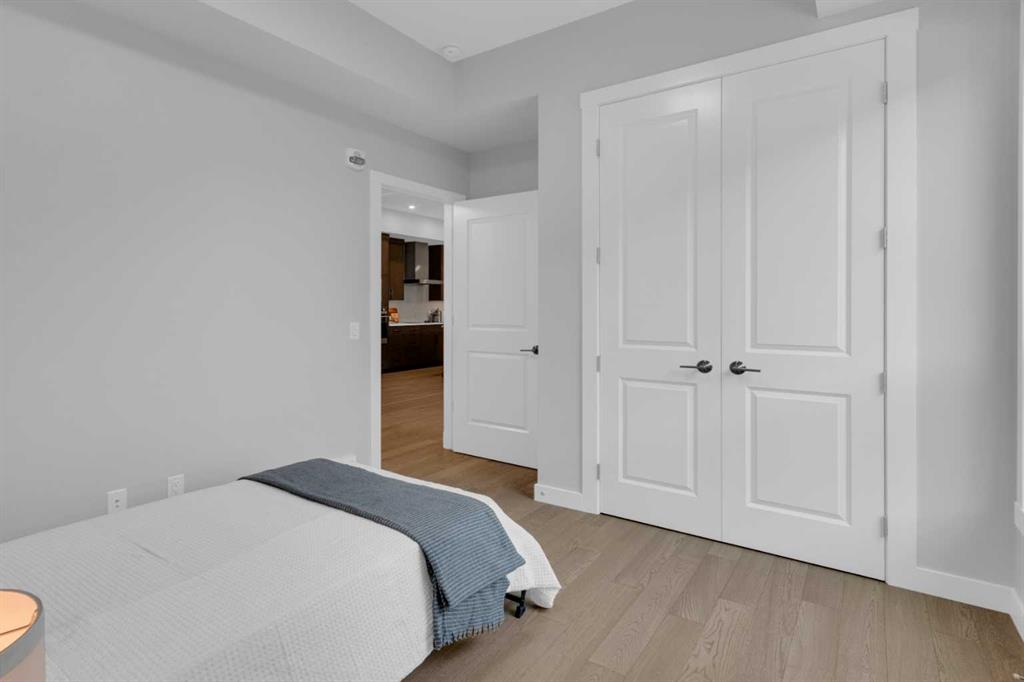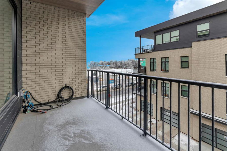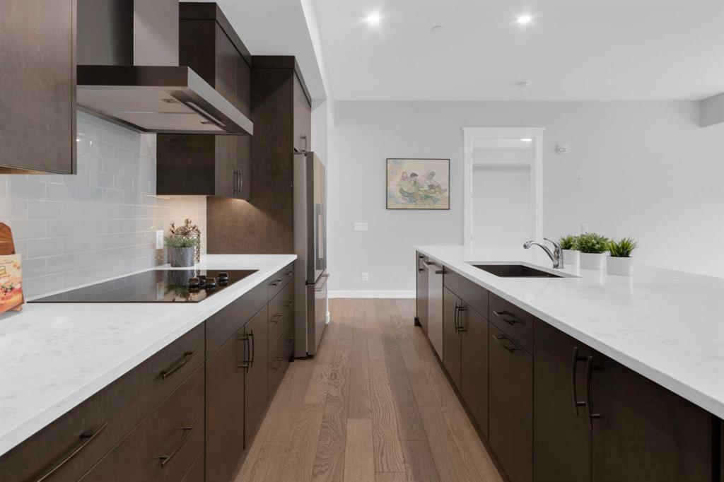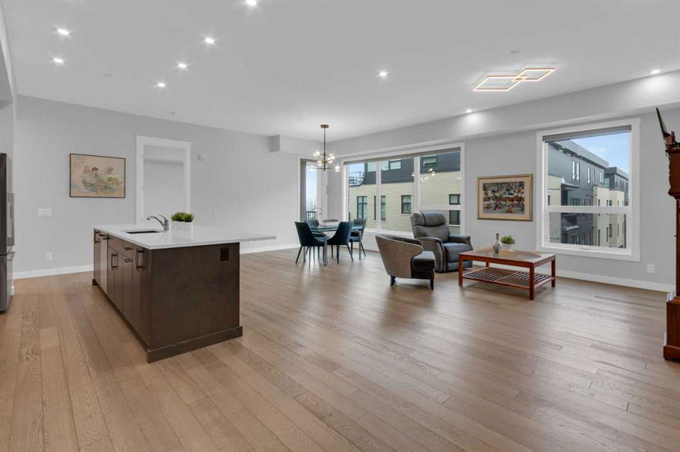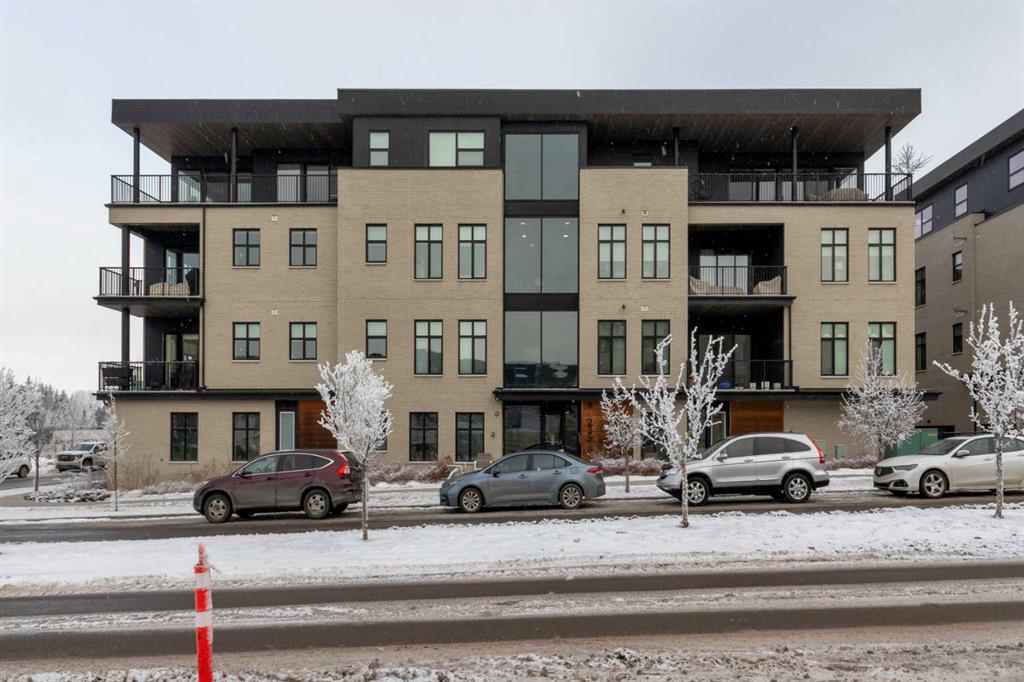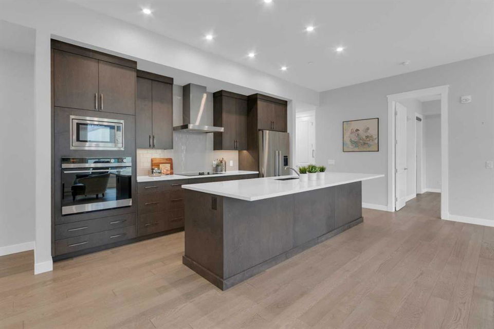 Welcome to Capella in University District, a small condo building with only 8 Estate Style single level luxury homes. This spacious and well laid-out 2 bedroom, 2 bathroom condo with single garage is just steps away from all of the amenities this highly desirable community offers. Located on the third floor is this modern residence with hardwood flooring, 10 foot ceilings, many large windows, central air conditioning, designer bathrooms and well-equipped spacious kitchen. The open concept main living space is flooded with natural light and features a sleek kitchen with expansive island, quartz countertops and full height cabinetry. The kitchen opens directly on to the dining space, the living room with electric fireplace, and a nook that works well for a den/office or as space for additional furniture. The bright primary suite offers enough space for a king size bed, a walk-in closet, and a 5-piece ensuite with heated floors, free standing tub, dual vanity, and fully tiled walk-in shower. The second bedroom has a murphy bed, a full bathroom across the hall, and is located on the other side of the condo from the primary bedroom, providing privacy between the bedrooms. Enjoy the morning sunrise on the spacious east-facing covered balcony that is equipped with a gas line for your BBQ or heater and a water line. The private, heated singe garage is attached to the building has epoxy floors, storage space, and a water softener for the condo unit. This well cared for building is part of a 7 building complex that offers a fitness centre, visitor parking, and courtyard spaces. Conveniently situated within walking distance to a grocery store, restaurants and coffee shops. Steps away from Market Mall, the U of C and the Children’s Hospital and a quick commute to downtown and access out to the mountains.