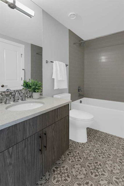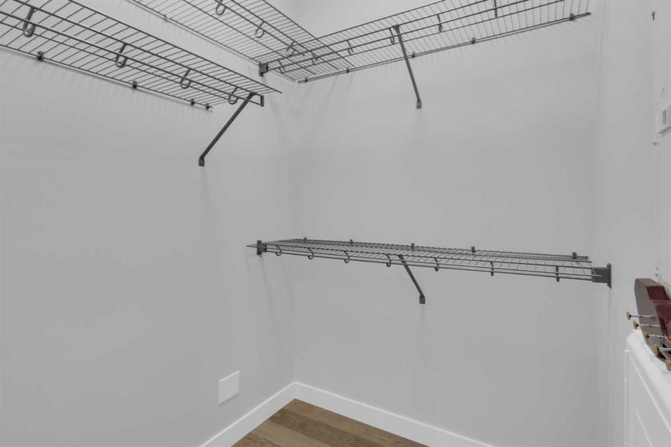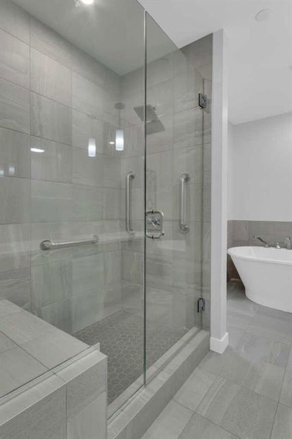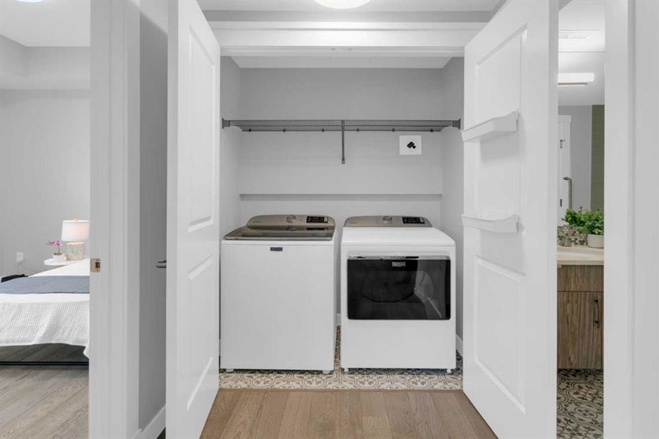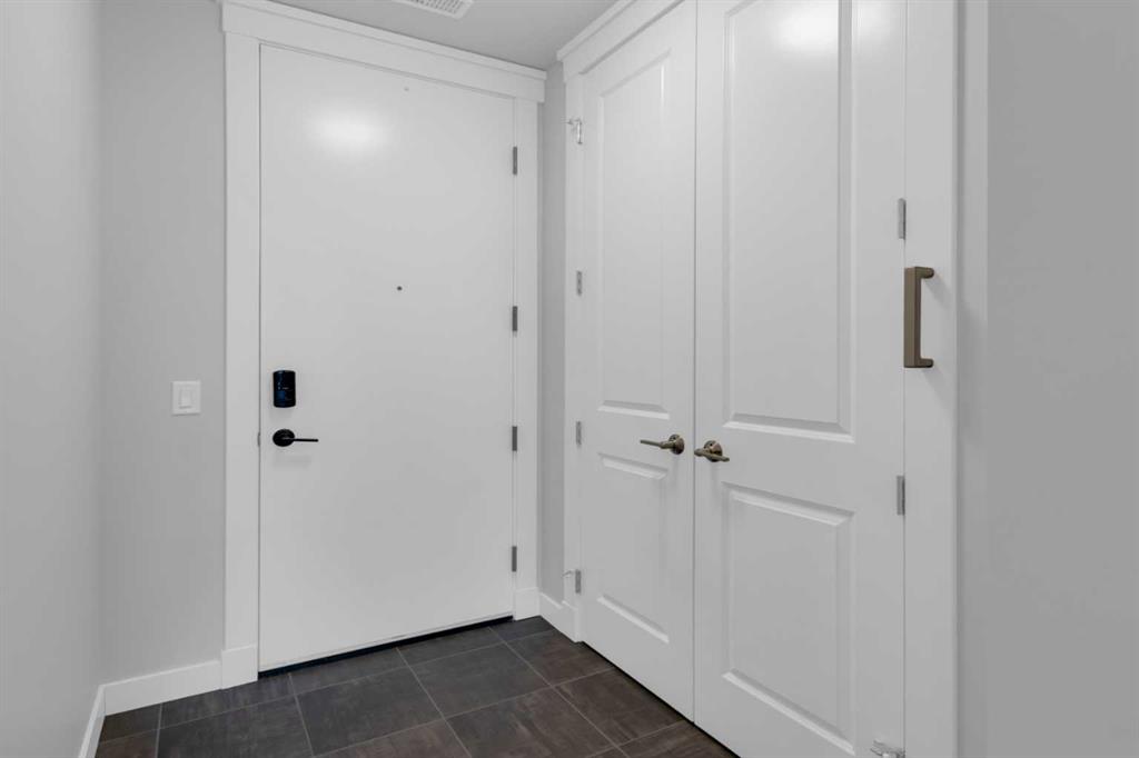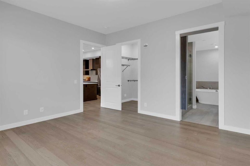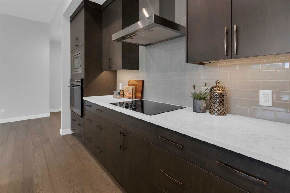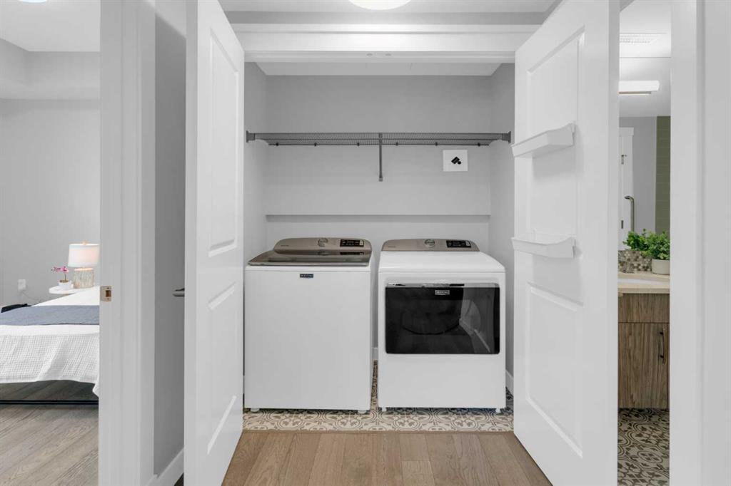 Welcome to Capella in University District, a small condo building with only 8 Estate Style single level luxury homes. This spacious and well laid-out 2 bedroom, 2 bathroom condo with single garage is just steps away from all of the amenities this highly desirable community offers. Located on the third floor is this modern residence with hardwood flooring, 10 foot ceilings, many large windows, central air conditioning, designer bathrooms and well-equipped spacious kitchen. The open concept main living space is flooded with natural light and features a sleek kitchen with expansive island, quartz countertops and full height cabinetry. The kitchen opens directly on to the dining space, the living room with electric fireplace, and a nook that works well for a den/office or as space for additional furniture. The bright primary suite offers enough space for a king size bed, a walk-in closet, and a 5-piece ensuite with heated floors, free standing tub, dual vanity, and fully tiled walk-in shower. The second bedroom has a murphy bed, a full bathroom across the hall, and is located on the other side of the condo from the primary bedroom, providing privacy between the bedrooms. Enjoy the morning sunrise on the spacious east-facing covered balcony that is equipped with a gas line for your BBQ or heater and a water line. The private, heated singe garage is attached to the building has epoxy floors, storage space, and a water softener for the condo unit. This well cared for building is part of a 7 building complex that offers a fitness centre, visitor parking, and courtyard spaces. Conveniently situated within walking distance to a grocery store, restaurants and coffee shops. Steps away from Market Mall, the U of C and the Children’s Hospital and a quick commute to downtown and access out to the mountains.