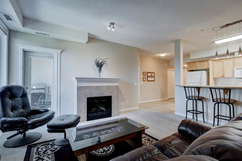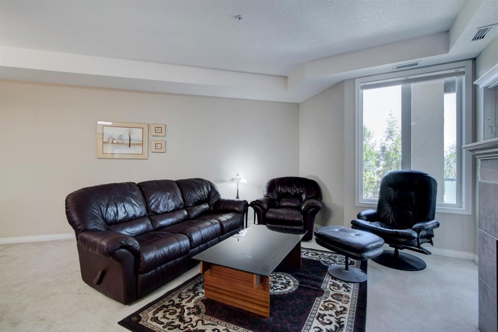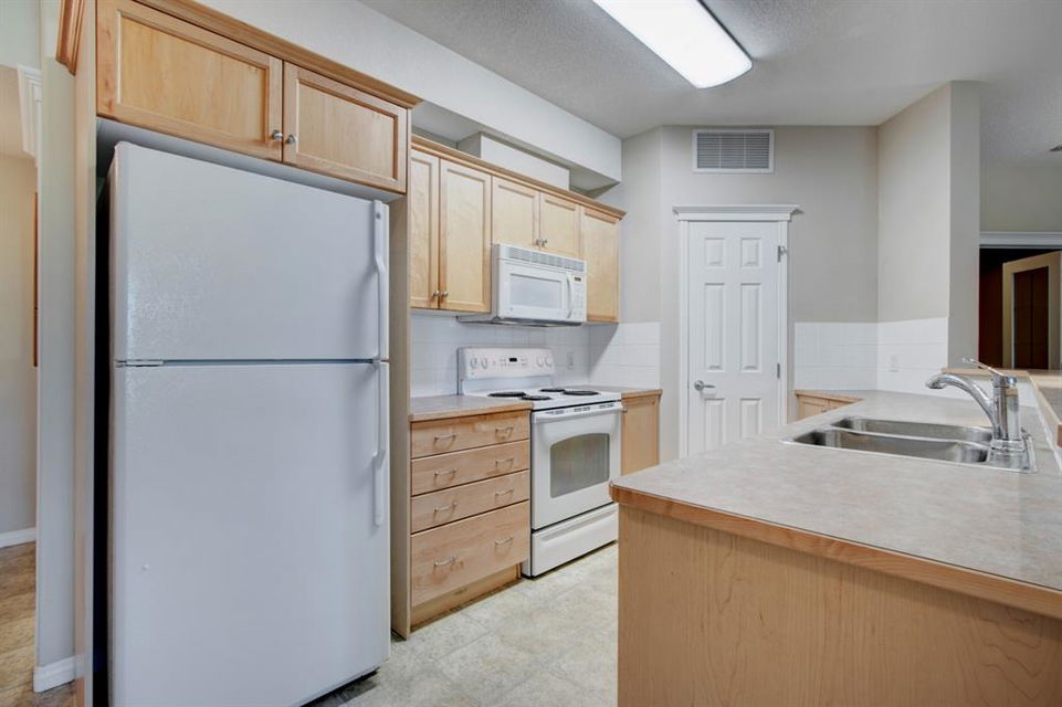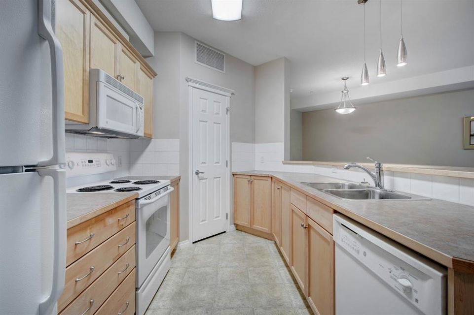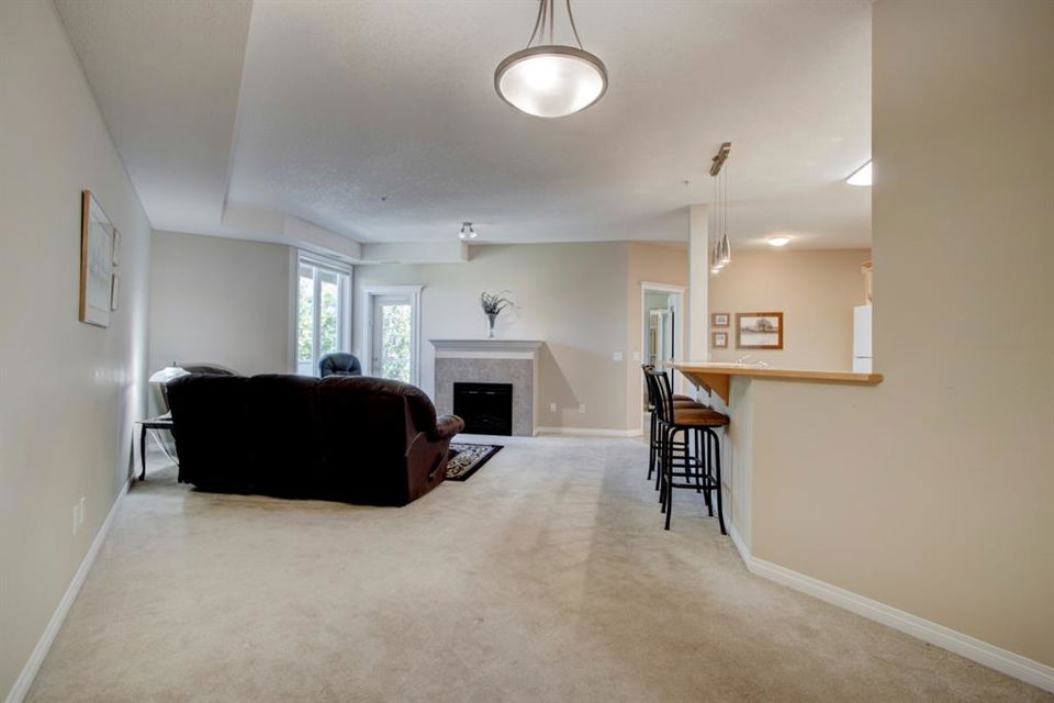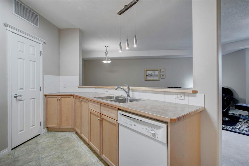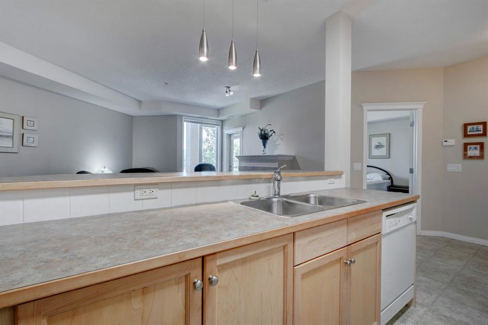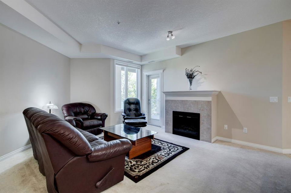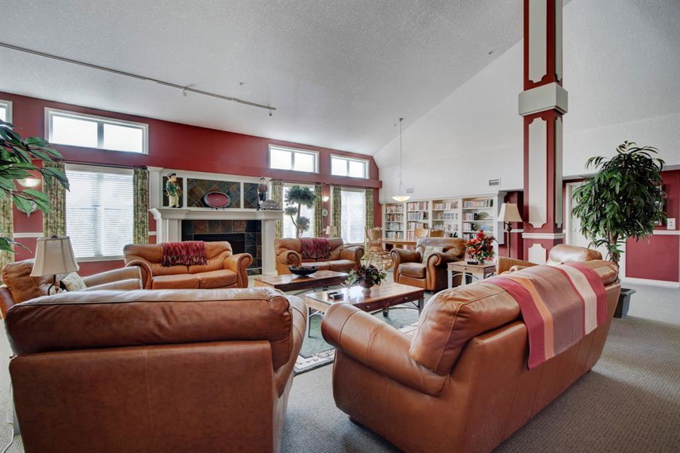 Welcome to this spacious and very well maintained 1 bedroom plus den, 2 bathroom condo unit in the excellent Sierras of Evergreen 55+ complex. The open floor plan features the living room with a fireplace with mantle, kitchen with breakfast bar seating, and dining room area. The living room has a patio door leading to the oversized 11 ft x 10 ft balcony. Large master bedroom with a walk-in closet and full ensuite bathroom. The den with french doors makes a useful work space/office area or room for a guest to sleep. 2nd full bathroom and a sizeable laundry room with storage space completes this condo. One titled underground parking stall and a storage locker are included. This building has a number of amenities including a hobby/woodworking room, swimming pool, hot tub, exercise room, wine and beer making room, party room, 2 meeting rooms and a sitting room with fireplace.
