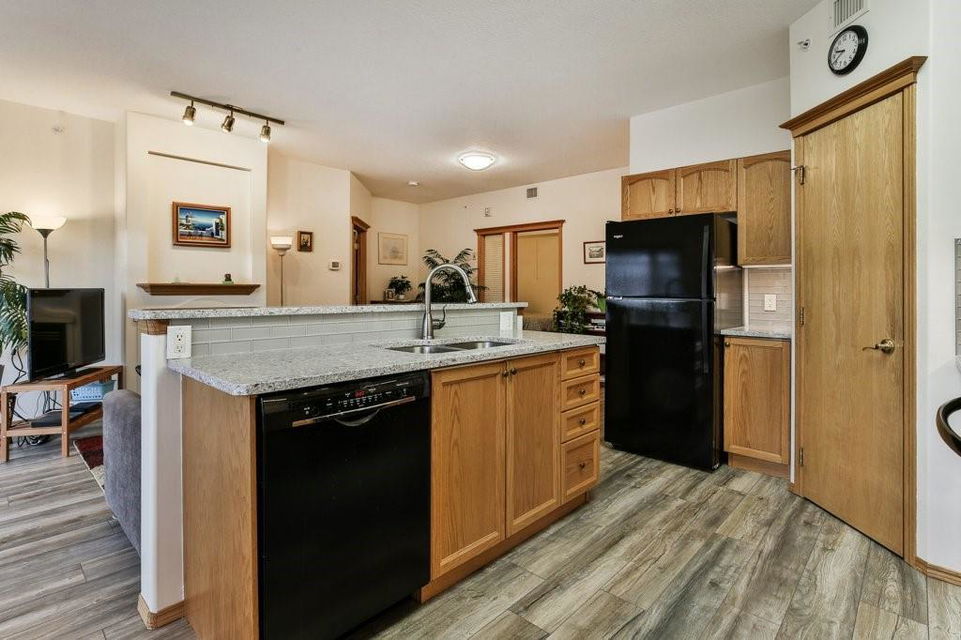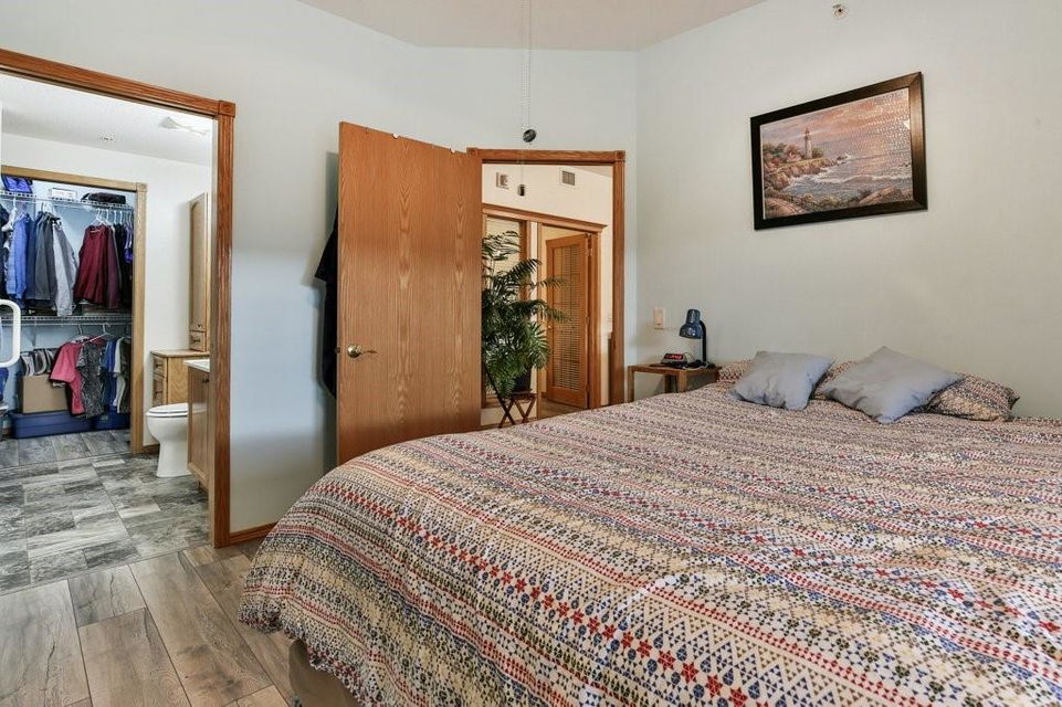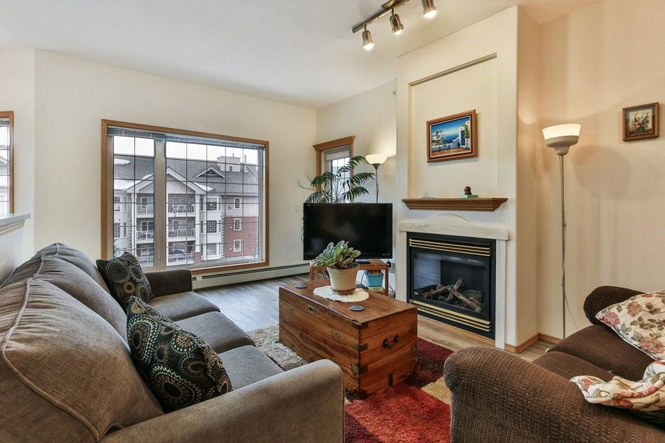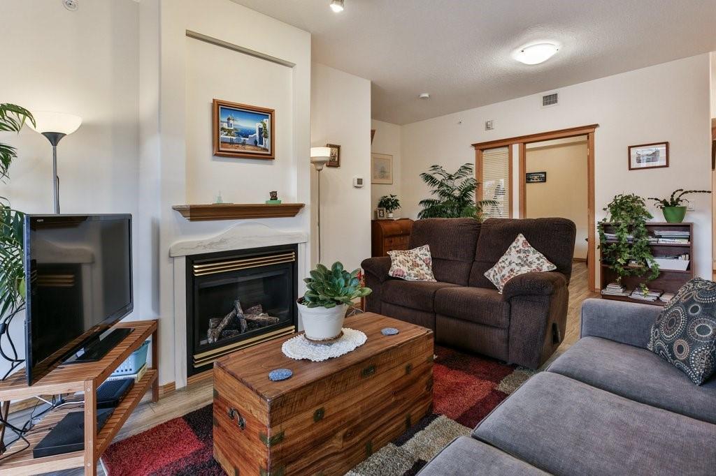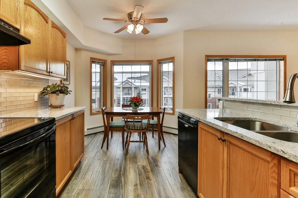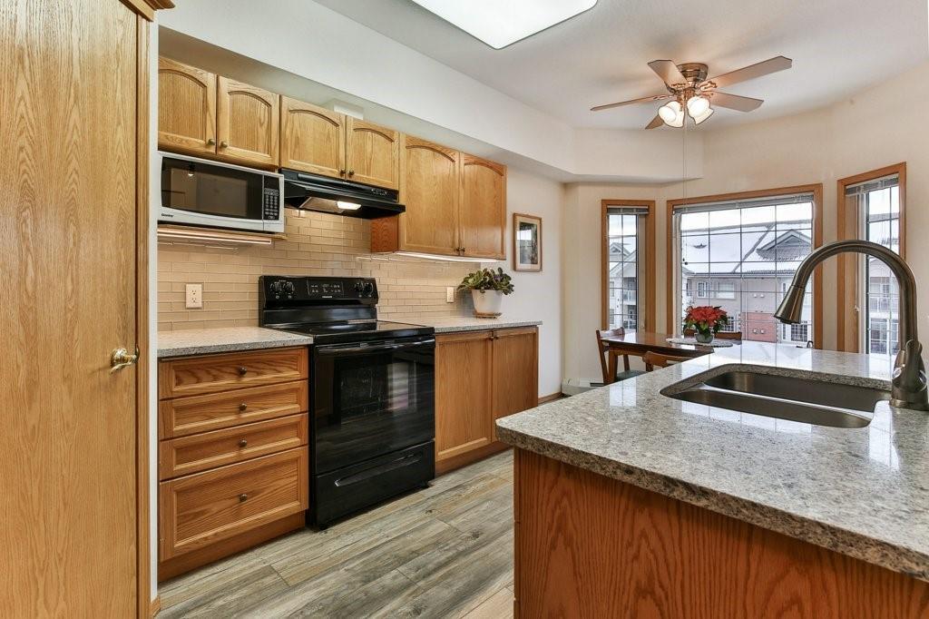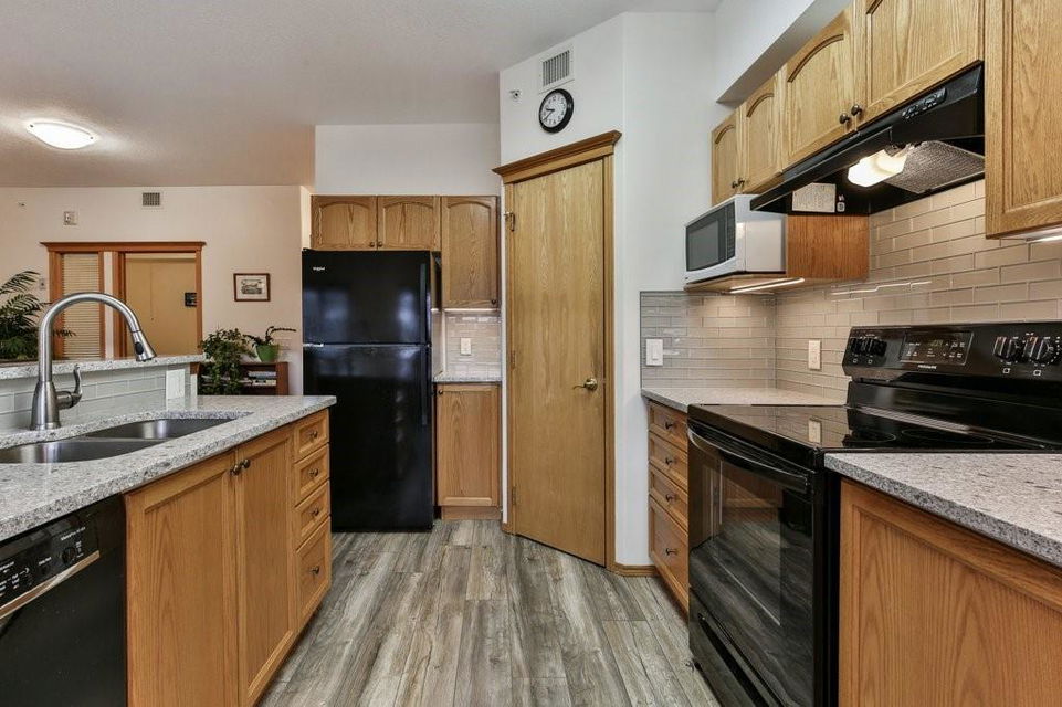 Updated, top floor, south facing condo in the very popular Sierra’s of Tuscany 40+ adult complex. Several updates to this spacious 1 bedroom + den unit since 2017 including – 5 new appliances, quartz countertops, under cabinet lighting, sink & faucet all in the kitchen, back splash in kitchen & bathrooms, laminate & vinyl flooring, all walls & ceilings painted, addition of ceiling fans & updated lighting & fireplace serviced & thermostat added. This very well kept condo offers an open concept kitchen with corner pantry, bright breakfast nook, living room with gas fireplace, master bedroom with ensuite & large walk-in closet, den with closet (large enough for 2nd bedroom), 2 piece bathroom & spacious laundry/storage room. Loads of in-suite storage, central air conditioning & south facing covered balcony. 1 assigned underground parking stall with enclosed storage locker in front of the stall. Great amenities including gym, pool, theatre, ball room, library, work shop, car wash, bowling alley & guest suites.