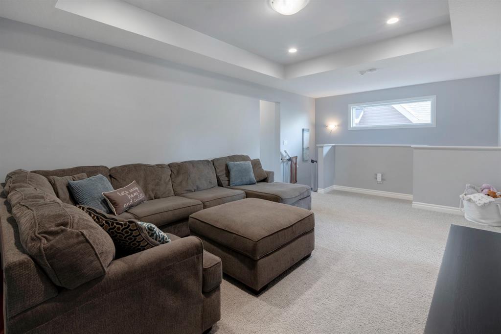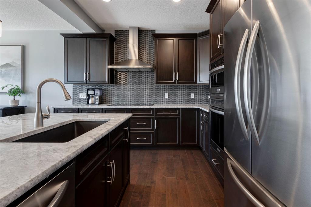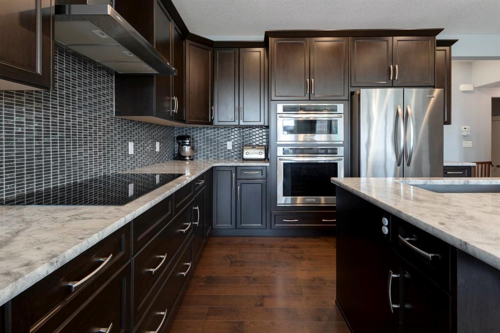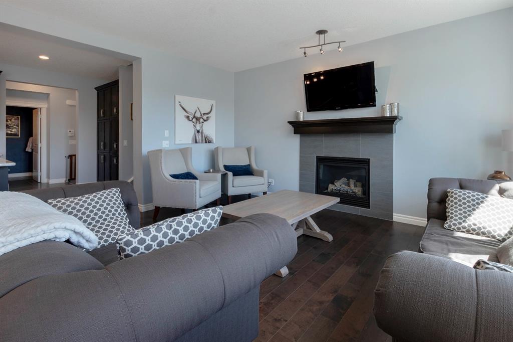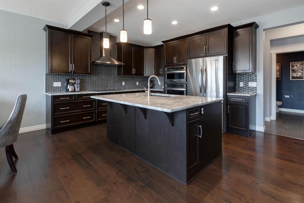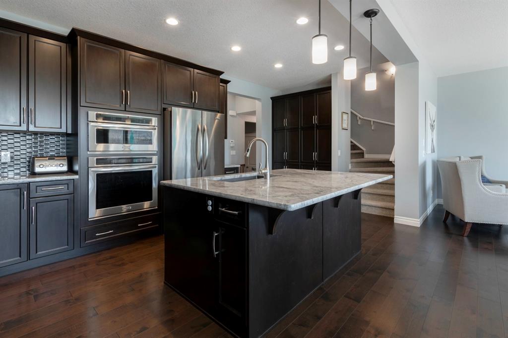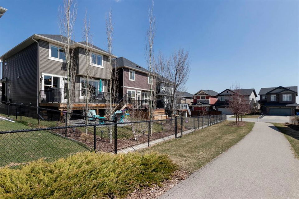 Extremely well kept and upgraded family home with a great layout, backing onto the pathway system. This Trico Home has 3 bedrooms, 2.5 bathrooms , an oversized double garage (can fit an F150), and a professionally fully landscaped yard. The open concept main floor features wide plank hardwood flooring, knockdown ceilings and trendy paint colours. Expansive kitchen with a full pantry wall of built-in cabinetry, beautiful granite countertops, a Kitchen Aid appliance package including double wall ovens and cooktop, a spacious island, mosaic tile backsplash, pendant lighting & pot lights. The kitchen opens onto the dining area that faces the yard and with access out to the south facing deck and yard. The living room also faces the yard in this open concept main level, and features a gas fireplace with mantle, tile surround and a built-in fan. The spacious front entrance with built-in storage bench & walk-in closet and a powder room complete the main level. On the upper level you will find the primary bedroom with vaulted ceilings, walk-in closet with a window, and a stunning ensuite with double vanity with granite countertops, beautiful fully tiled shower, and a soaker tub. Two additional bedrooms upstairs are great sizes. The 4 piece bathroom is located beside the 2 kids’ bedrooms, and you also find on this level the laundry room and a bonus room that is a perfect TV room, kids’ play room or both! The unfinished basement is well laid out, future bathroom is roughed-in, and provides lots of storage space. The south facing yard is professionally landscaped including a deck with a gas line for your BBQ, stamped concrete patio, lots of mature trees that offer privacy, and the yard backs onto the very well cared for pathway system. Easy access to playgrounds, shopping, restaurants, and to major routes to get in and out of the community. This very clean, well maintained home is being sold by the original owners.