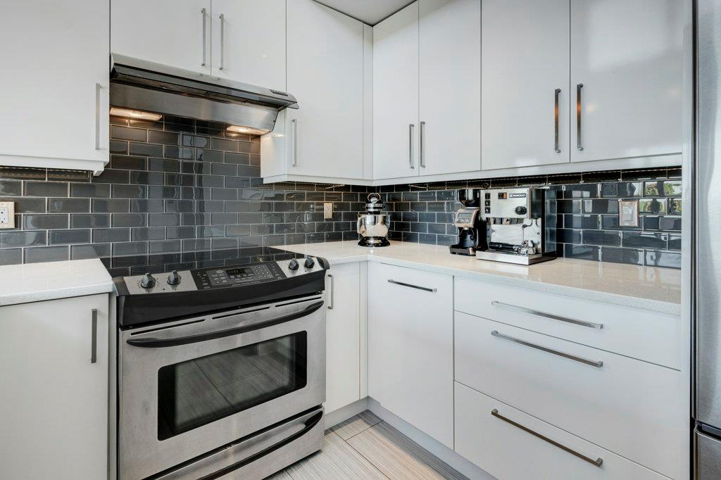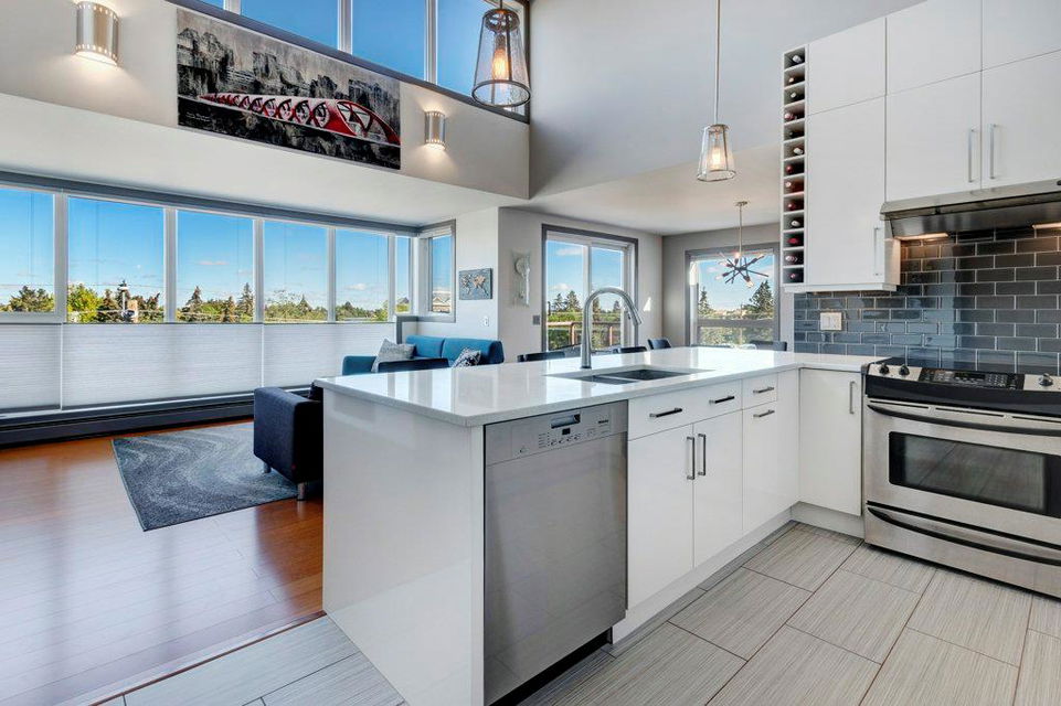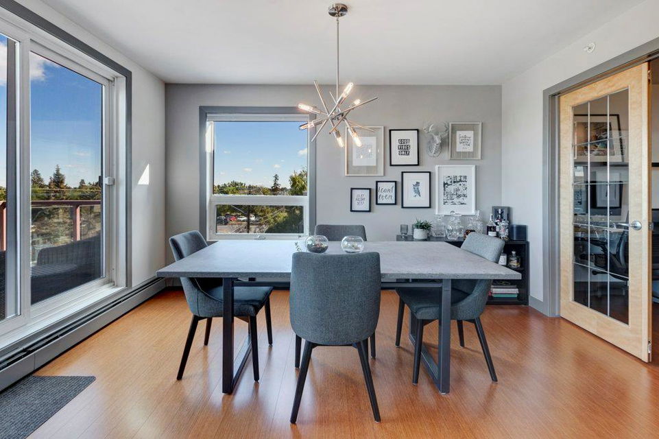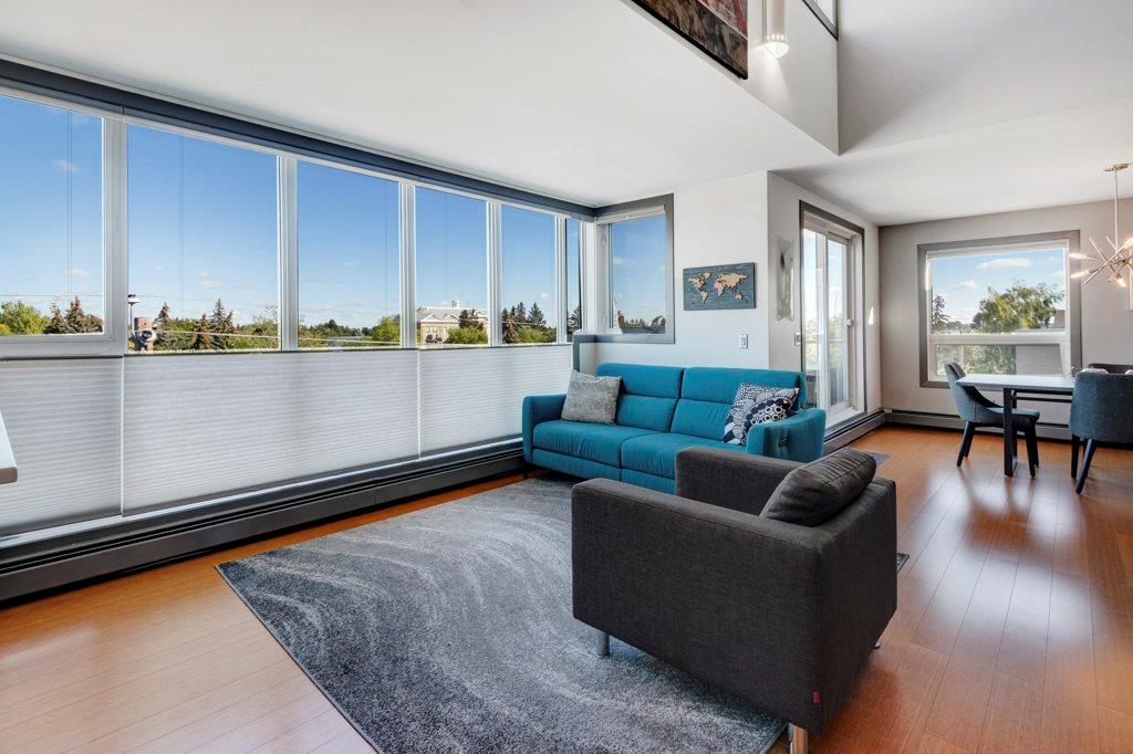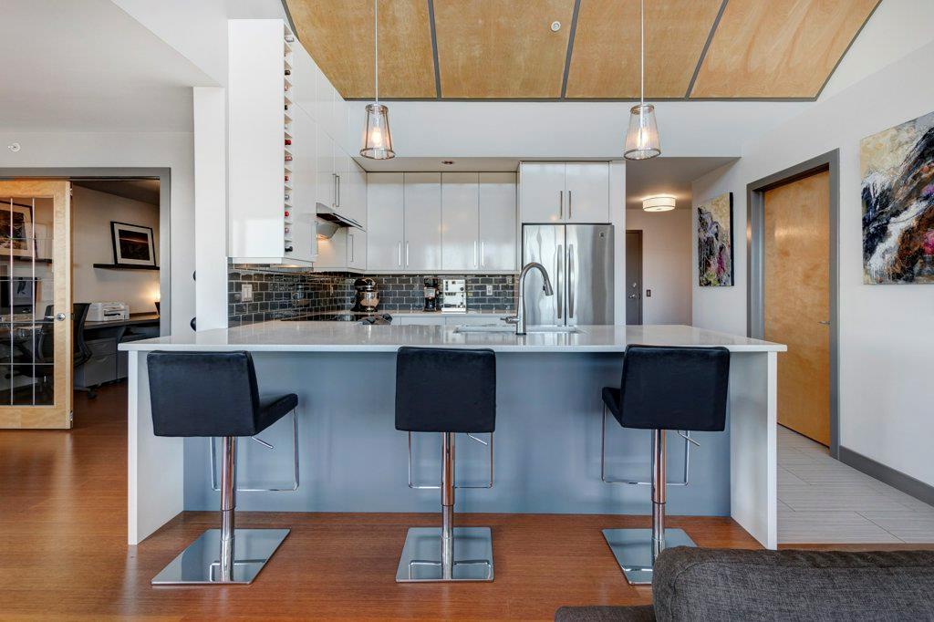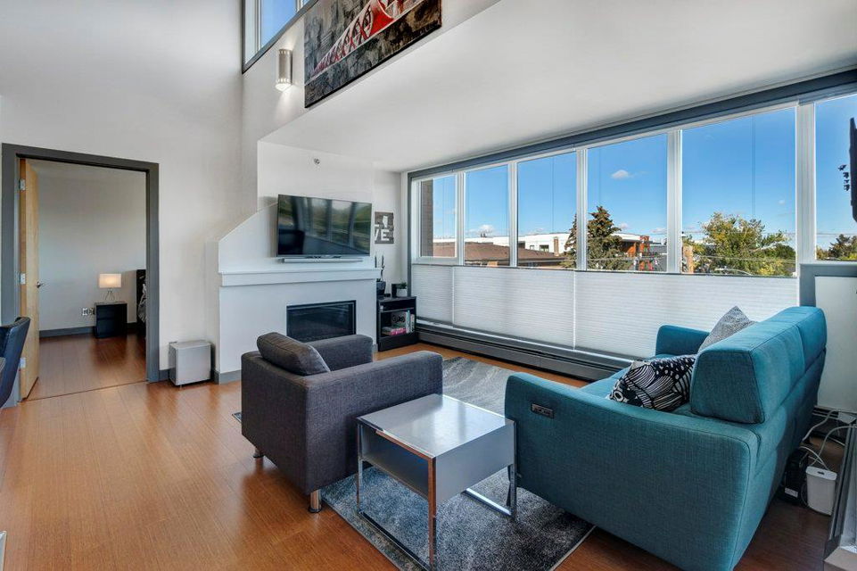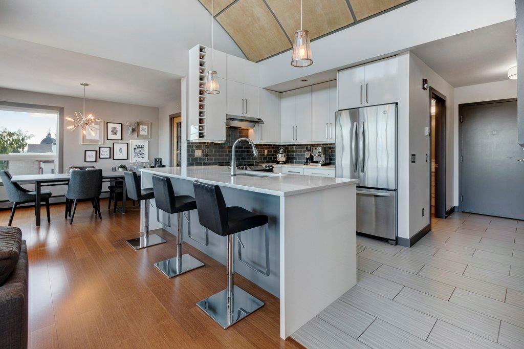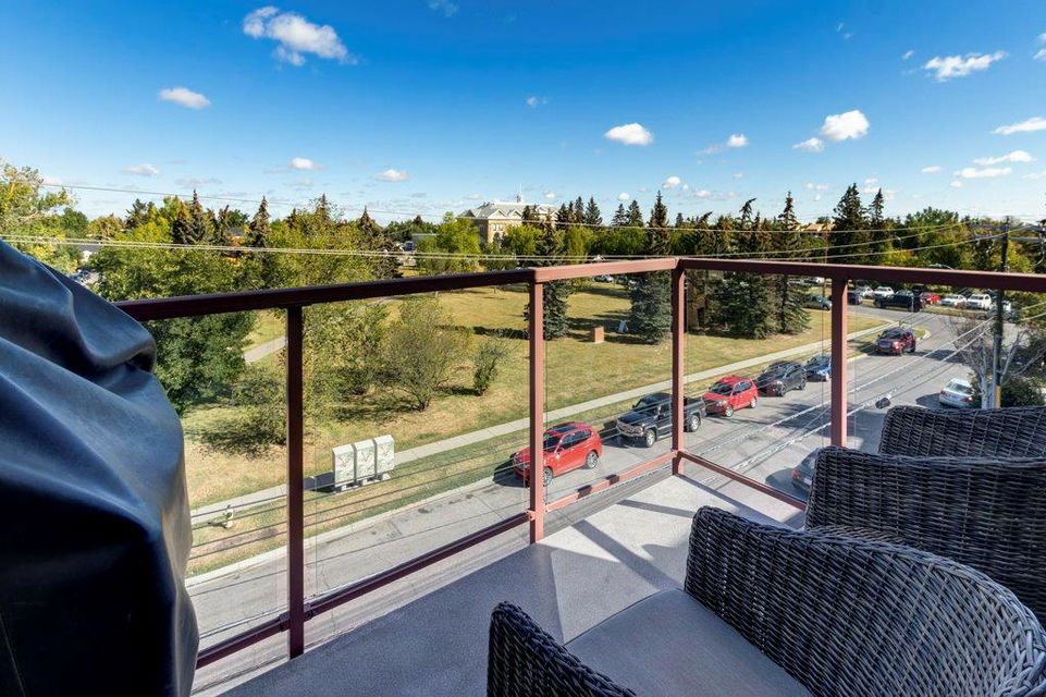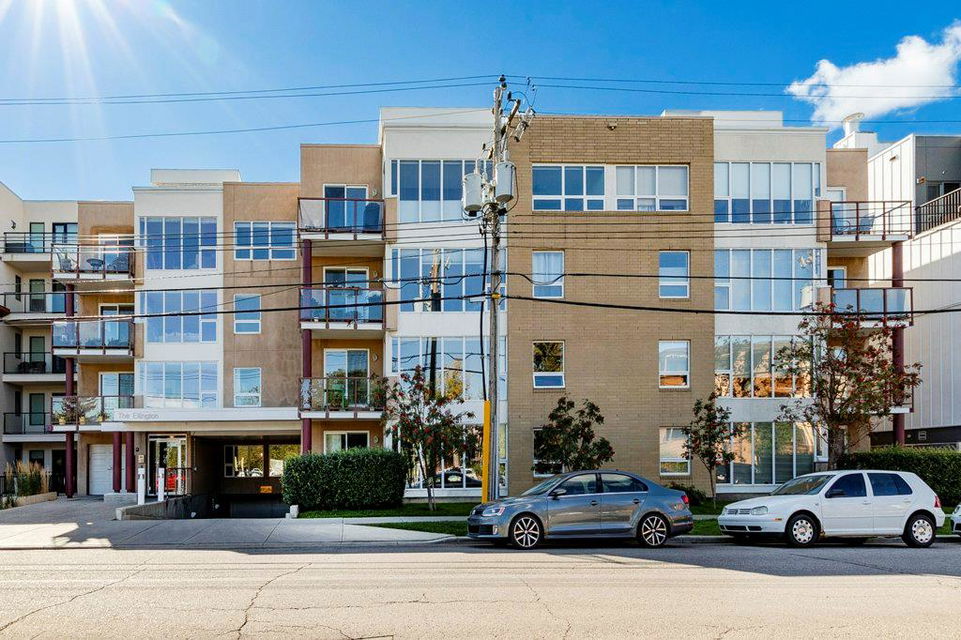 Fully renovated, 1,029 sq ft top floor condo facing a lovely neighbourhood green space offers 1 bedroom plus den (large enough to be a second bedroom) and 2 full bathrooms. A very functional layout, several windows to allow natural light in, and a long list of renovations that include: new kitchen (2014), new ensuite (2018), new fireplace (2018), new lighting (2018 & 2020), new second bathroom (2020), new window coverings throughout (2021), and new washer & dryer (2021). Modern open concept kitchen with 15 foot wood panelled ceiling, quartz counters, flat panel cabinets, under cabinet lighting, and stainless steel appliances that is open to the living room with gas fireplace and wall of windows. Dining area is spacious and can accommodate a table for 6 with room to spare for additional furniture. Primary bedroom with double closets and 4 piece ensuite with marble floors, fully tiled shower/tub combo, and custom vanity with quartz countertop. Den is large enough to use as a second bedroom or enjoy the built-in desk to work from home. If you would prefer the desk to be removed, no problem the owners can do this for possession. Second bathroom has a fully tiled stand up shower and custom vanity with quartz counter top. Walk-in storage room has built-in shelving, washer, dryer, and custom recycling centre with counter top. Balcony faces Bridgeland Park and it has a gas line for your BBQ. Titled underground parking stall, assigned storage locker, and lots of street parking surrounding the building. The Ellington is a pet friendly, 23 unit building with many long term owners and few rentals. Fantastic location with a park across the street, a few blocks away from the amenities that Edmonton Trail and Bridgeland have to offer. Quick commute to downtown and great access to many major roadways.