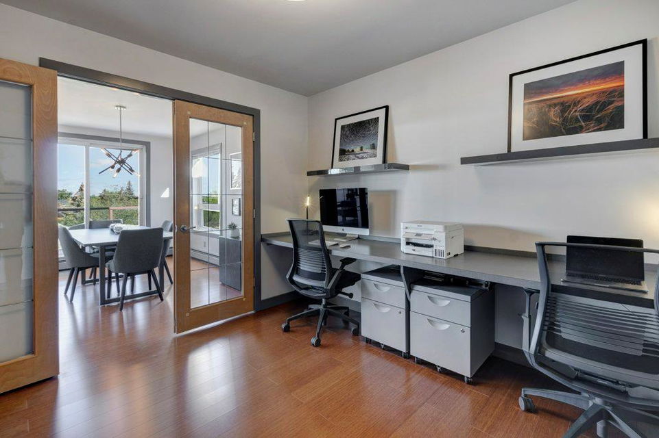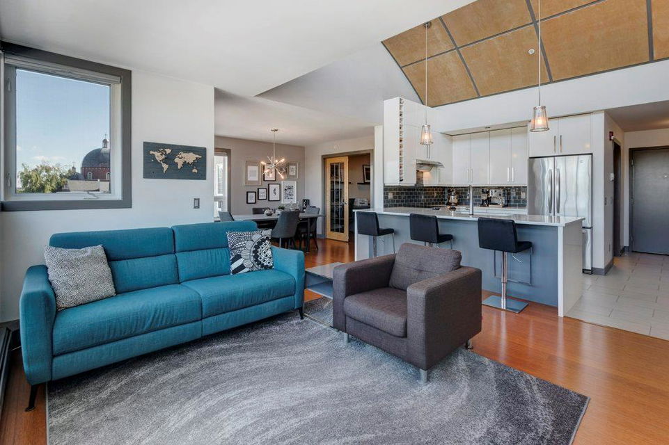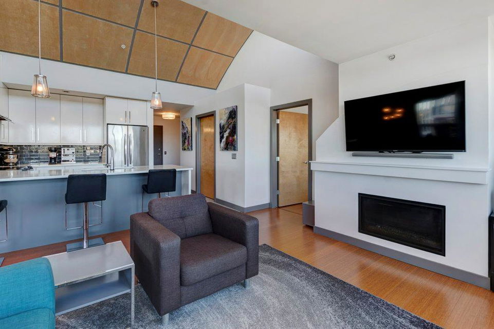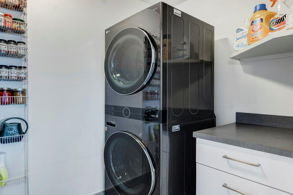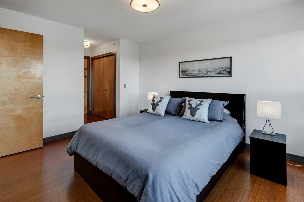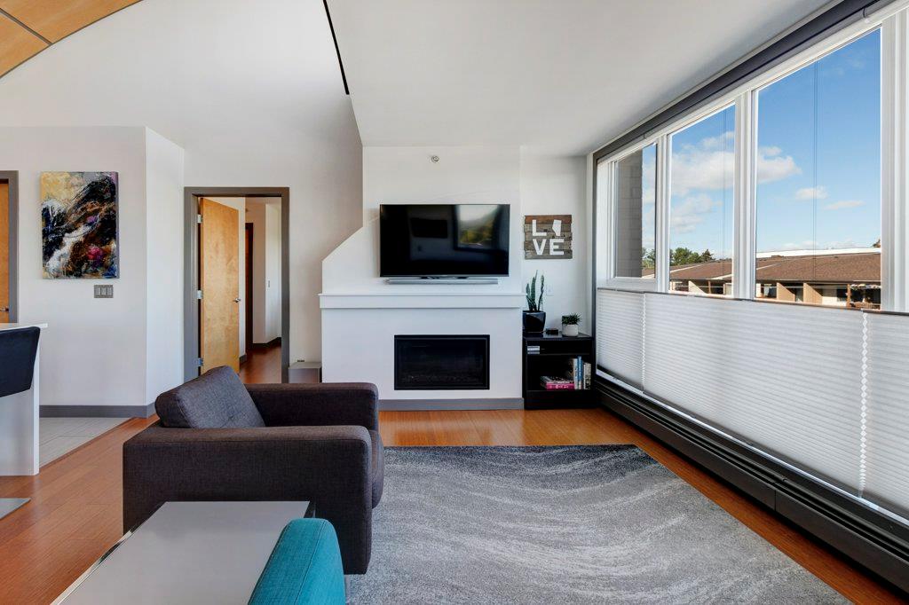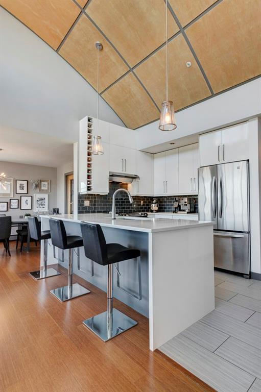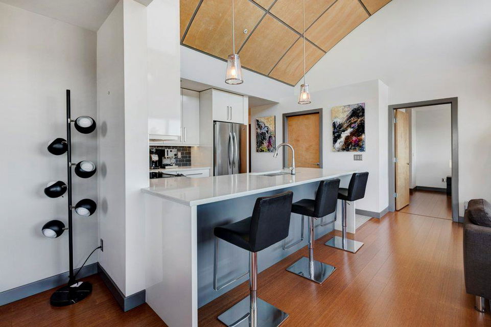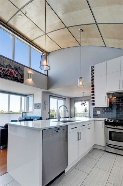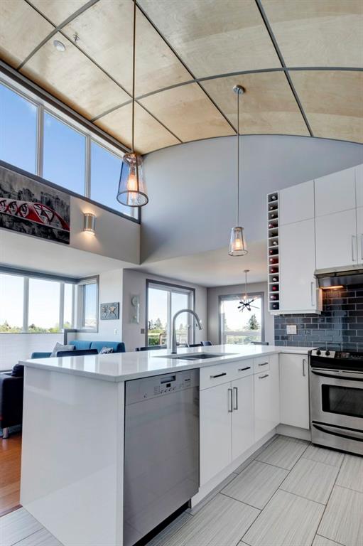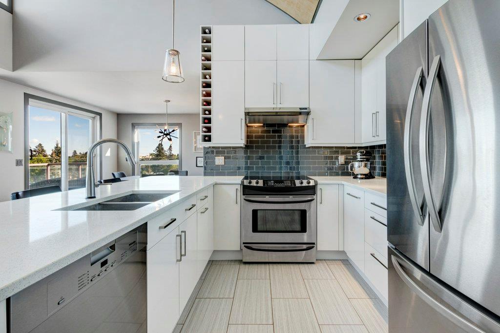Fully renovated, 1,029 sq ft top floor condo facing a lovely neighbourhood green space offers 1 bedroom plus den (large enough to be a second bedroom) and 2 full bathrooms. A very functional layout, several windows to allow natural light in, and a long list of renovations that include: new kitchen (2014), new ensuite (2018), new fireplace (2018), new lighting (2018 & 2020), new second bathroom (2020), new window coverings throughout (2021), and new washer & dryer (2021). Modern open concept kitchen with 15 foot wood panelled ceiling, quartz counters, flat panel cabinets, under cabinet lighting, and stainless steel appliances that is open to the living room with gas fireplace and wall of windows. Dining area is spacious and can accommodate a table for 6 with room to spare for additional furniture. Primary bedroom with double closets and 4 piece ensuite with marble floors, fully tiled shower/tub combo, and custom vanity with quartz countertop. Den is large enough to use as a second bedroom or enjoy the built-in desk to work from home. If you would prefer the desk to be removed, no problem the owners can do this for possession. Second bathroom has a fully tiled stand up shower and custom vanity with quartz counter top. Walk-in storage room has built-in shelving, washer, dryer, and custom recycling centre with counter top. Balcony faces Bridgeland Park and it has a gas line for your BBQ. Titled underground parking stall, assigned storage locker, and lots of street parking surrounding the building. The Ellington is a pet friendly, 23 unit building with many long term owners and few rentals. Fantastic location with a park across the street, a few blocks away from the amenities that Edmonton Trail and Bridgeland have to offer. Quick commute to downtown and great access to many major roadways.