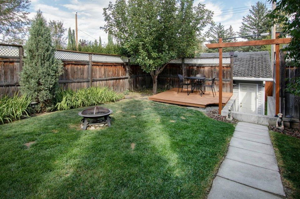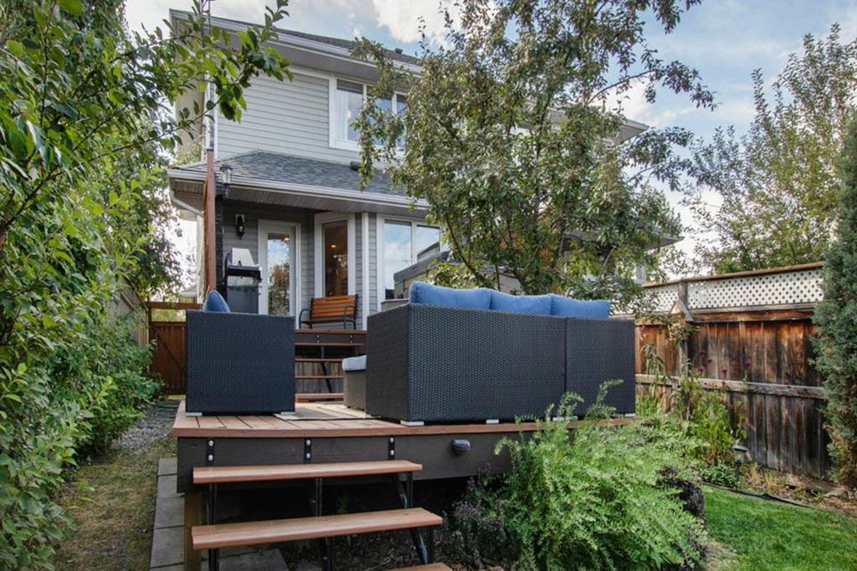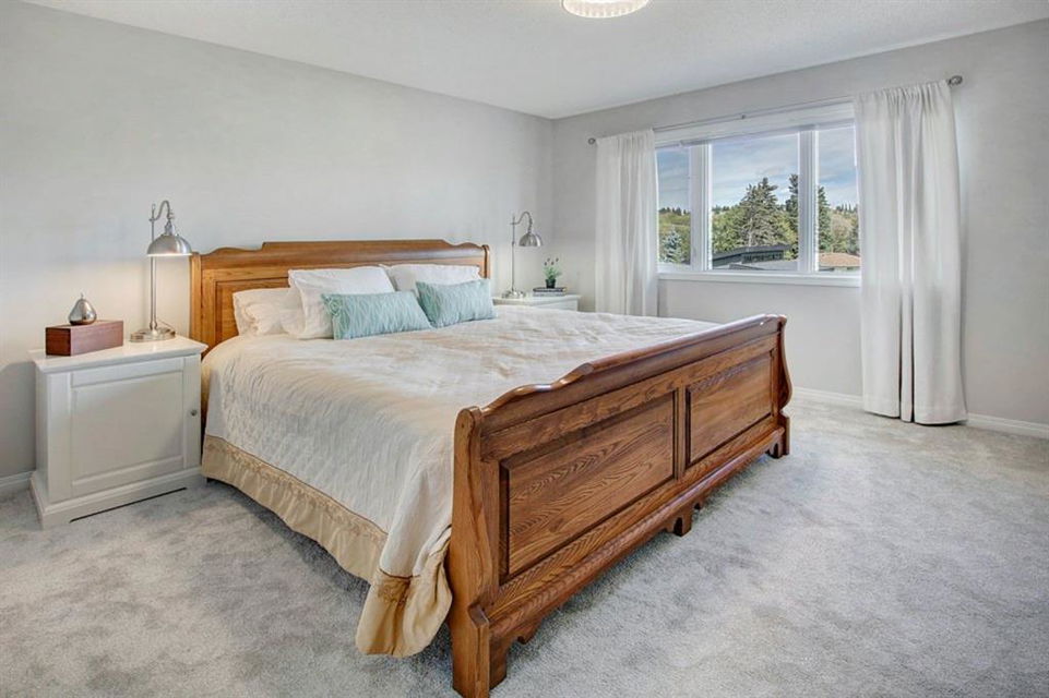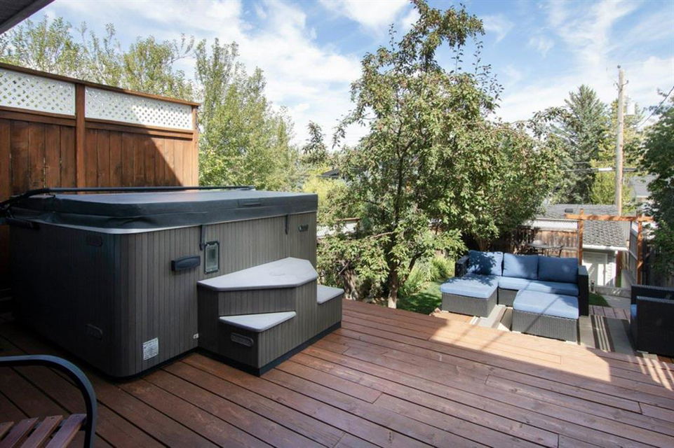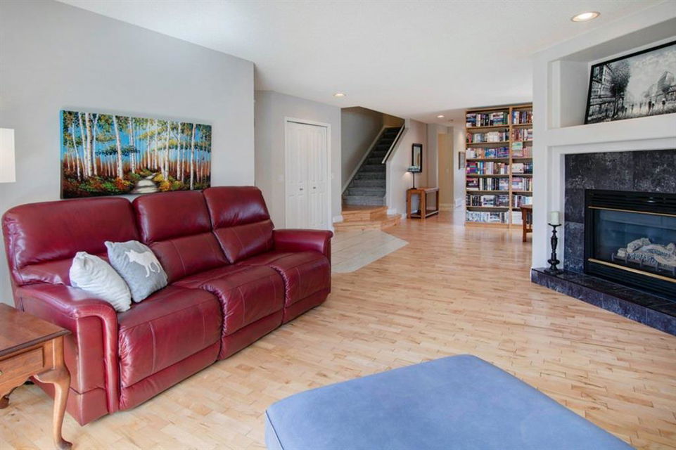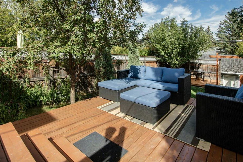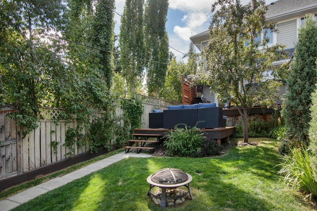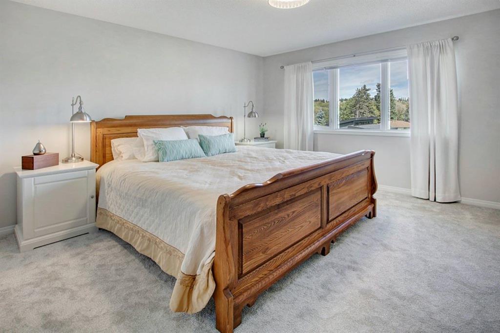 This extremely well kept home is located on a great street on an extra deep 172 foot lot which gives you an amazing large yard far bigger than most infills! Updates over the past few years including brand new carpet just installed throughout the upper level and stairs, shingles on the garage just replaced, shingles on the house replaced in 2019, several updated light fixtures, addition of Hunter Douglas blinds and interior painting throughout in 2017. The main floor offers a bright and spacious living room with 3 large west-facing windows, hardwood flooring and a cozy gas fireplace. The living room opens onto a den/office ( which could be used as a formal dining room). A half bathroom is also on the main level along with a sizable pantry/storage room that has laundry hook ups available should you want a main floor laundry room. The upper level with brand new carpet offers a lovely master bedroom with a walk-in closet and ensuite, a second spacious bedroom (large enough for a king size bed) with a walk-in closet, plus a second 4 piece bathroom. The unfinished basement is framed for future development (bedroom, bathroom, family room) and currently has a laundry area, plenty of storage space and utility room (furnace and ducts just cleaned). The private yard is stunning with 3 different decks to capture sun and shade at different times of the day, and features a hot tub, lots of mature trees/plants, and a detached double garage (23’3″ x 19’4″). Close to Bowness Park, Bowmont Park, the Bow River, Main Street Bowness and schools. Easy access to major roads and quick access out to the mountains.
