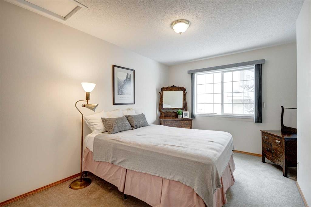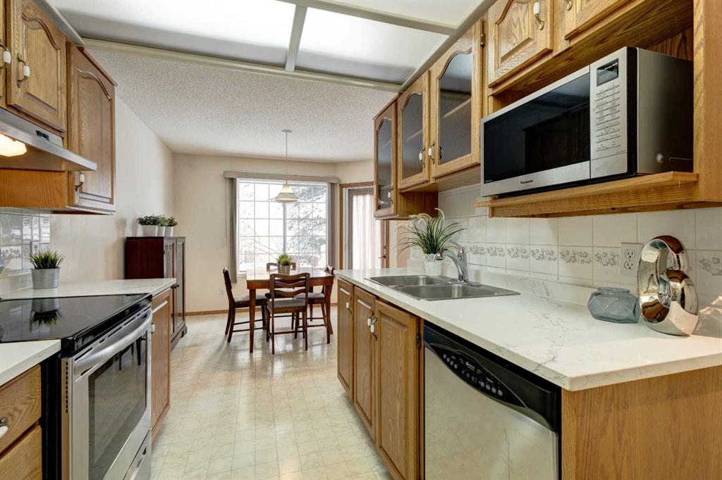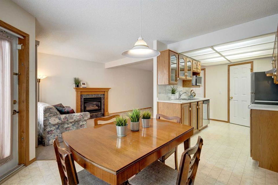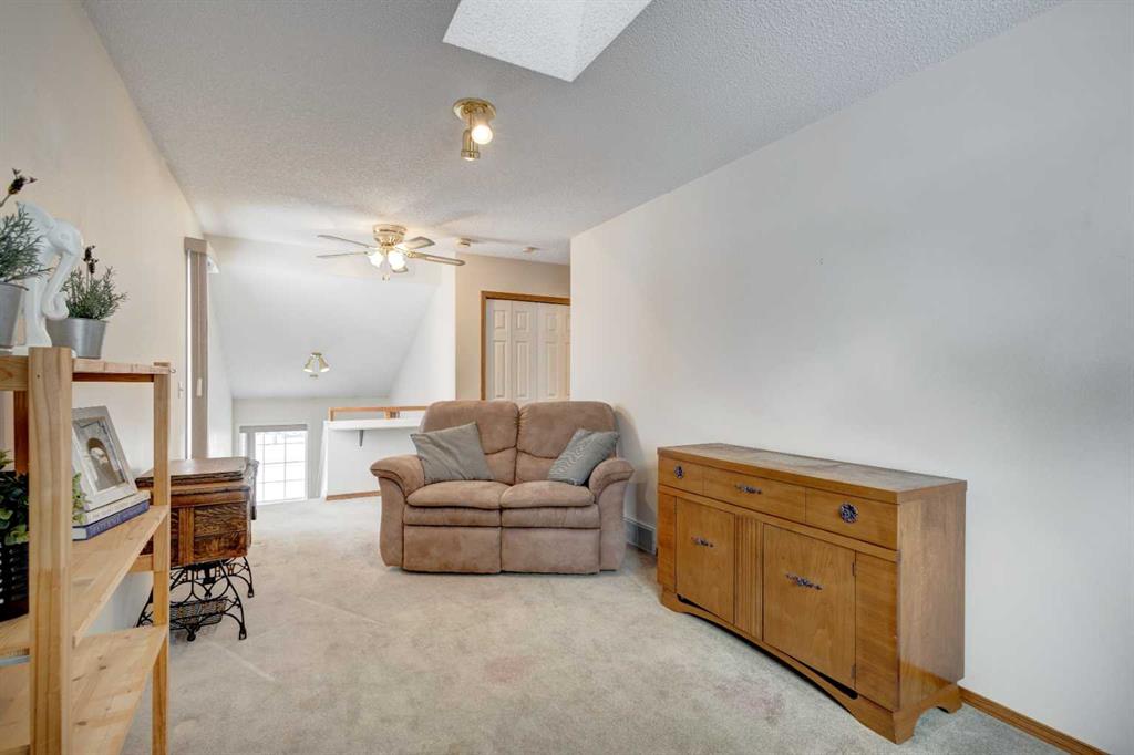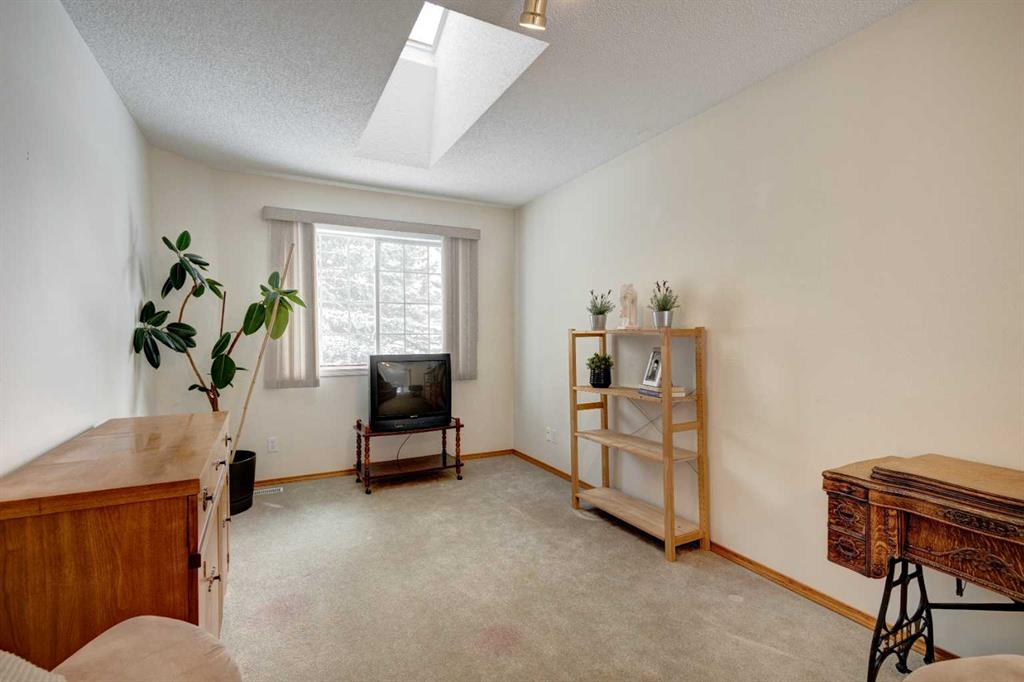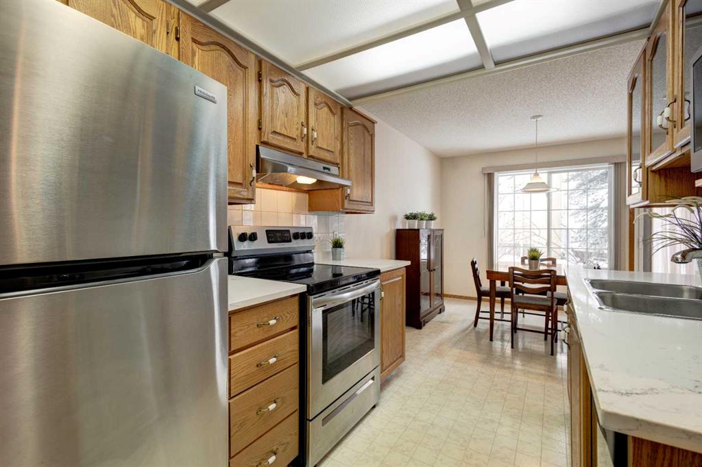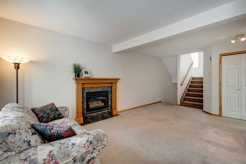 Bright and spacious end unit 2 bedroom, 2 bathroom duplex style condo with single attached garage, south facing patio, and basement living space. Spacious main level with a large living room featuring a gas fireplace and south facing window looking out at trees, good sized kitchen with newer stainless steel appliances, quartz countertops and a pantry, and dining nook with south facing windows and access to the patio. The next level up half a flight of stairs you will find the primary bedroom with a walk-in closet and a full ensuite bathroom which includes a walk-in shower and the stacked newer washer and dryer are tucked away behind the bathroom door. The next half level up is the top level with a spacious, bright flex room with windows and skylight, 2nd bedroom, and the 2nd full bathroom with a tub/shower combo. The basement is partially finished and has a rec room, workshop, roughed-in 3 piece bathroom, utility room with storage shelves built-in, and under the stair storage area. Hot water tank replaced in 2020. Great single attached garage that is large enough to fit a truck and full driveway in front of garage for extra parking. Well run complex located close to a grocery store, restaurants, parks and schools. Great access in and out of the community although tucked away in quiet location. Well maintained home that is ready for a few cosmetic updates and for a new family to move in and enjoy!