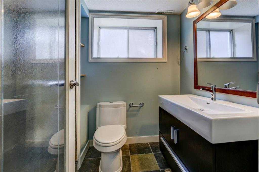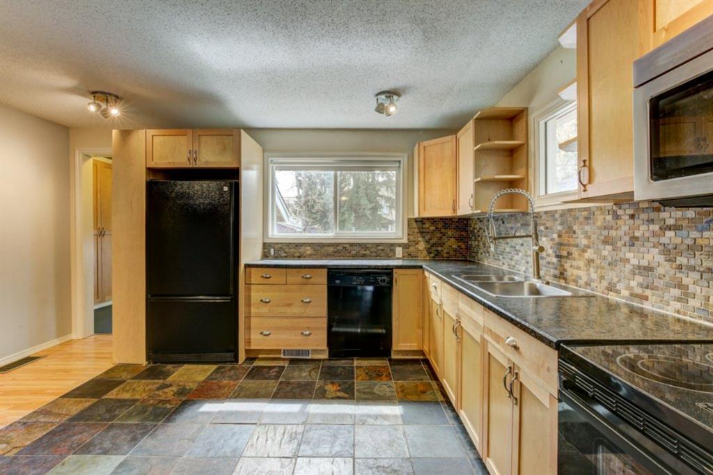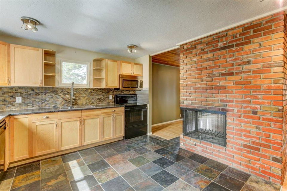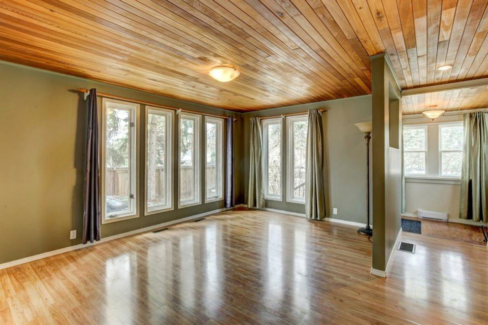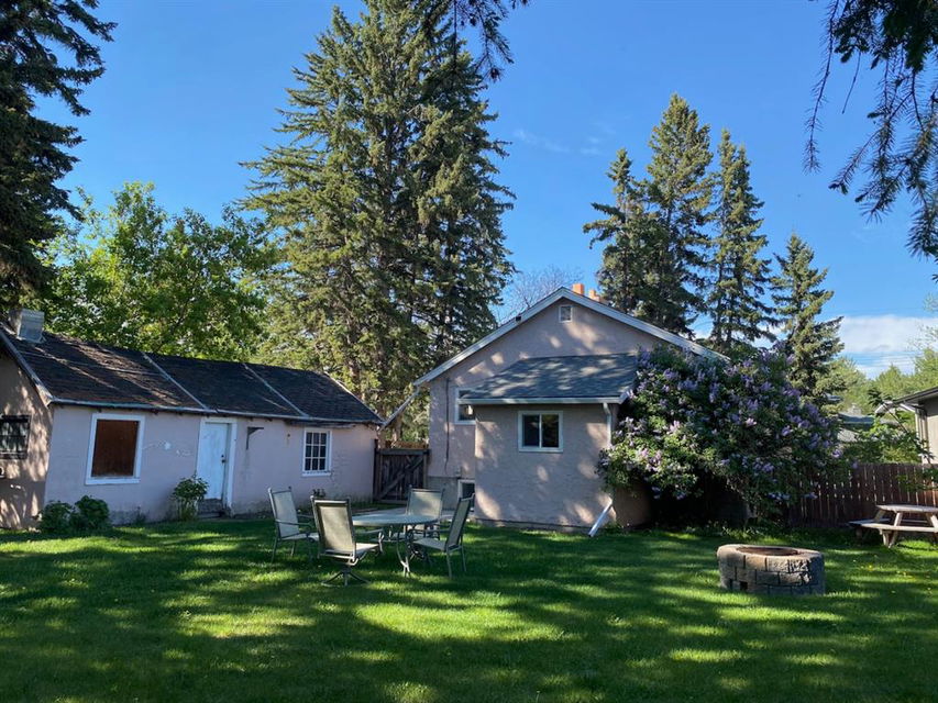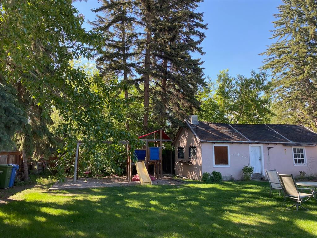Rare Opportunity on Bow Crescent! Your chance to set down roots in a desirable location. This picturesque 8600 sq ft pie shaped lot (expanding to 82 ft. at the back) has a sunny south facing yard which is framed on three sides by mature fir trees. Fully fenced yard includes play area, dog run and plenty of room for garden beds. This lovely family bungalow has been upgraded with a kitchen renovation including maple cabinets, stone backsplash, slate flooring, and window looking out to the expansive yard (2011), new shingles (2011) and upgraded main floor bath with new marble+glass tile in tub area. Spacious living/dining room with original wood burning brick fireplace open on three sides for cozy family gatherings. Two bedrooms complete this level, which has been freshly painted in a neutral palette, move in ready! The fully refinished basement provides a bright family room with wet bar, additional bedroom, 3 piece bathroom with modern vanity, slate floors and slate shower and laundry area. Basement was refinished in 2013 with new electrical, drywall, flooring, paint, lighting, furnace and hot water tank! Front drive garage and rear alley access. Excellent Bow Crescent location, close to Shouldice Park, the Bow River bike path system and quick access to hospitals, UofC, downtown and the mountains. Enjoy inner city living with a country feel. So much more to appreciate – come have a look!