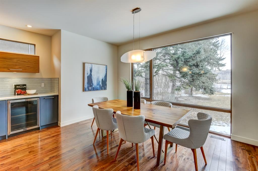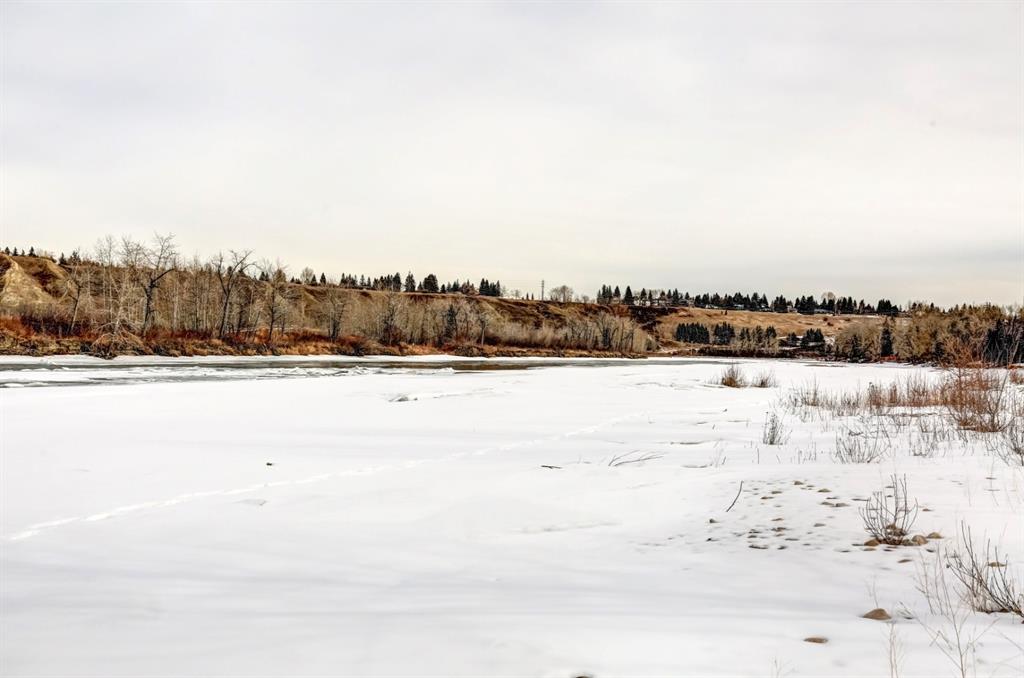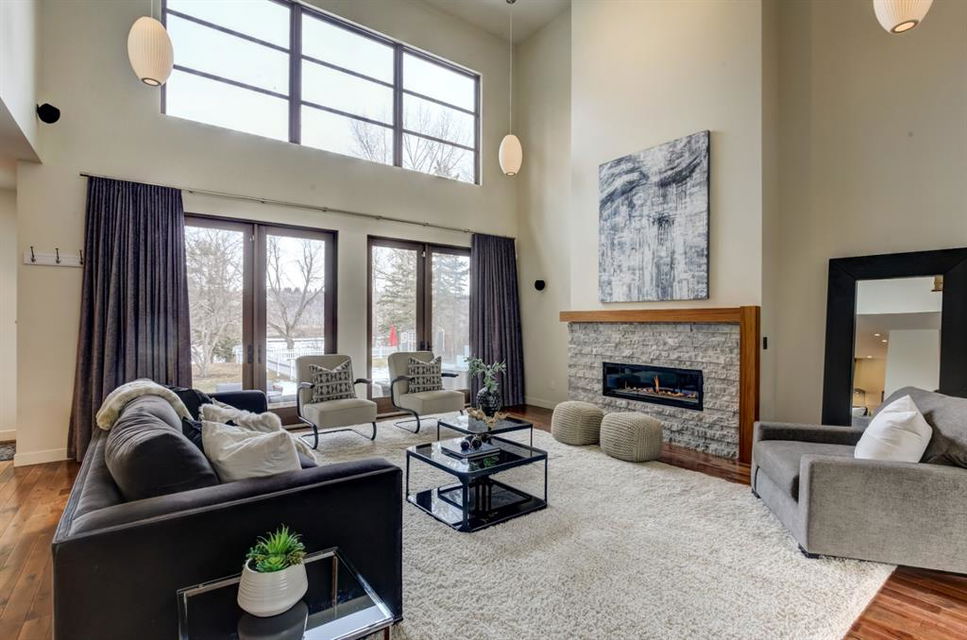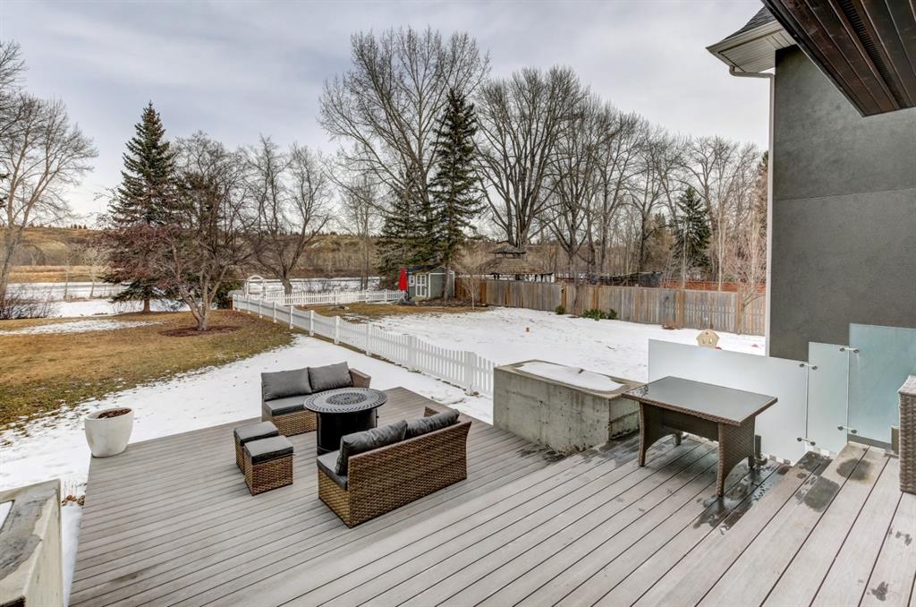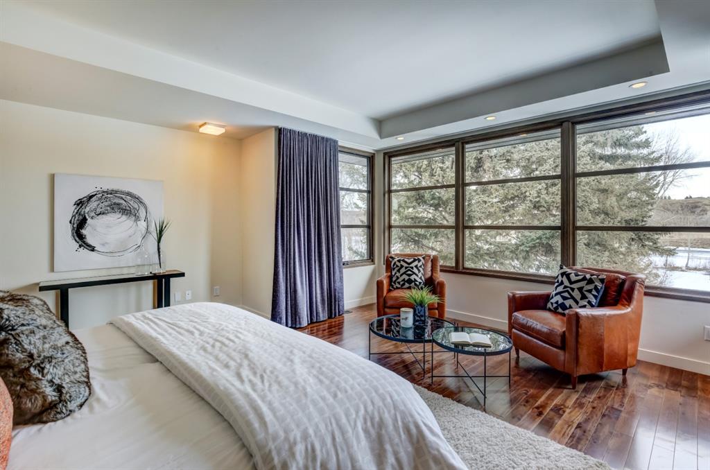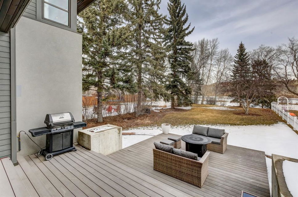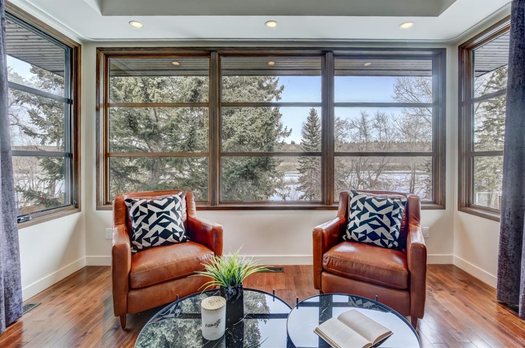 Beautiful modern riverfront family home with quadruple attached heated garage. Here is a rare chance to own riverfront on Bow Crescent in this 2010 built stunning home with 4 bedrooms, 3.5 bathrooms and modern features throughout. You will find hardwood throughout this home on the main level, upper level and both staircases, and tile throughout the rest of the living spaces, along with gorgeous wood windows, glass railings, and solid natural walnut doors. The main floor offers an open floor plan with the a stylish kitchen, dining area and two-storey living room all facing the yard, river and Bowmont park. Spacious kitchen with custom cabinetry features both lacquered and natural walnut cabinets, stainless steel appliances including a wall mount Bosch oven and microwave, gas cooktop and full size separate fridge and freezer, quartz countertops, a stylish island and pantry for extra storage. The dining area leads you out to the oversized composite deck with concrete built-in planters, a gas line for your BBQ and built-in speakers. The two-storey great room features four patio doors that all open onto the deck, a gas fireplace with stone veneer, custom drapery, and upper level windows. The main level also offers a large front flex room with upper windows designed especially to let natural sunlight in during all months of the year. This room can be a media room, home office, playroom or formal dining space. A second flex room can be set up as an office, media room, or playroom as well. 2 front closets and a powder room complete the main level. On the upper level you will find 3 bedrooms including the large primary bedroom with amazing river and Bowmont Park views from the many windows, custom drapery, and an ensuite with heated limestone flooring, walnut cabinetry, a freestanding soaker tub and tiled shower with 10mm glass. Two more oversized bedrooms are also on this level (one of which would need a railing closed in to use as a bedroom). A full bathroom and laundry room are also located on this upper level. The basement is fully finished with in-floor heat throughout, a large mudroom with custom built-ins, bedroom with 2 closets, full bathroom, finished storage area and utility room with plenty of storage space. The 4-car garage is a double tandem, with an oversized 18 ft wide garage door, has in-floor radiant heat, epoxy finish on the floor and is fully insulated, drywalled and painted. The riverfront yard is simply amazing and has a lower yard right beside the river as well. Truly a beautiful place to live with great neighbours, views and location on the river path system and across from Bowmont Park. Quick access to downtown and great nearby amenities.