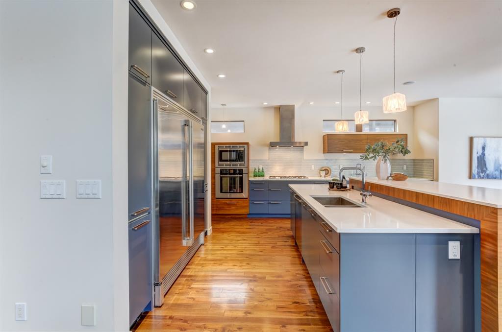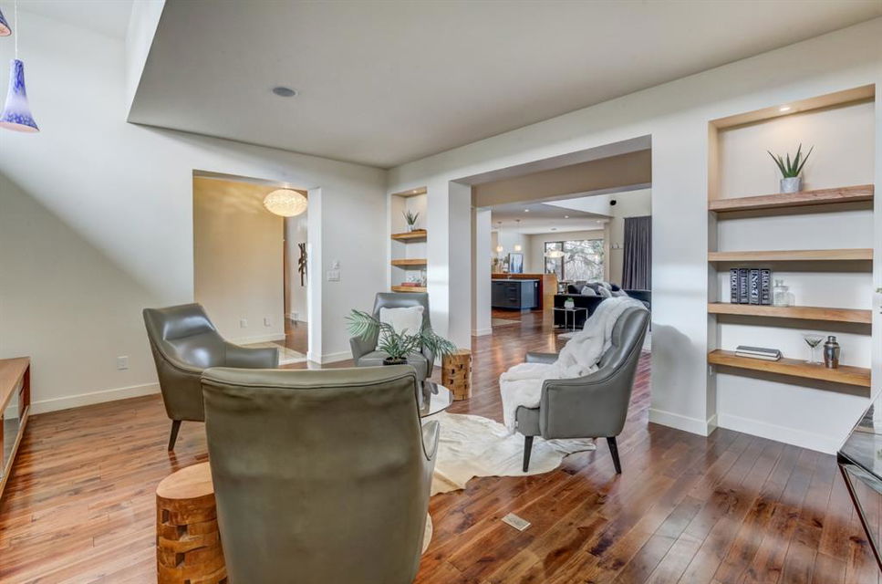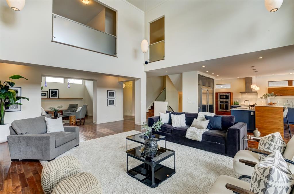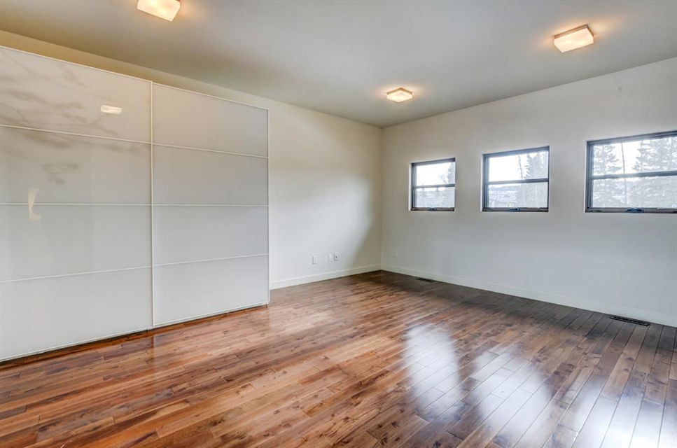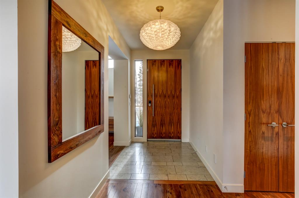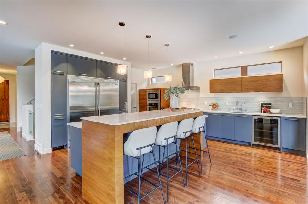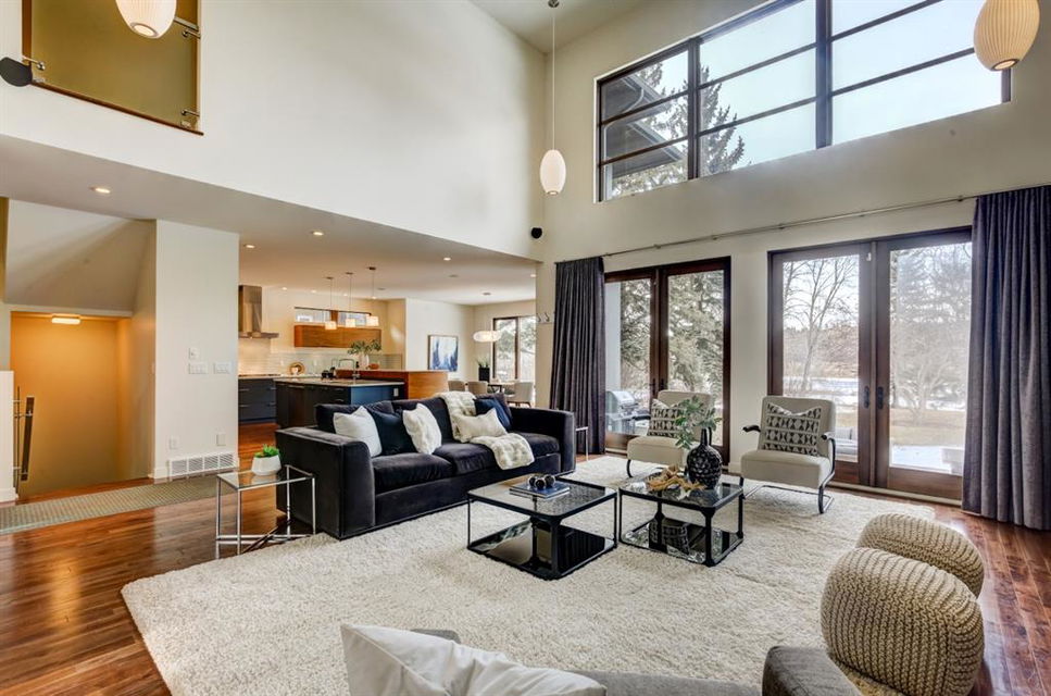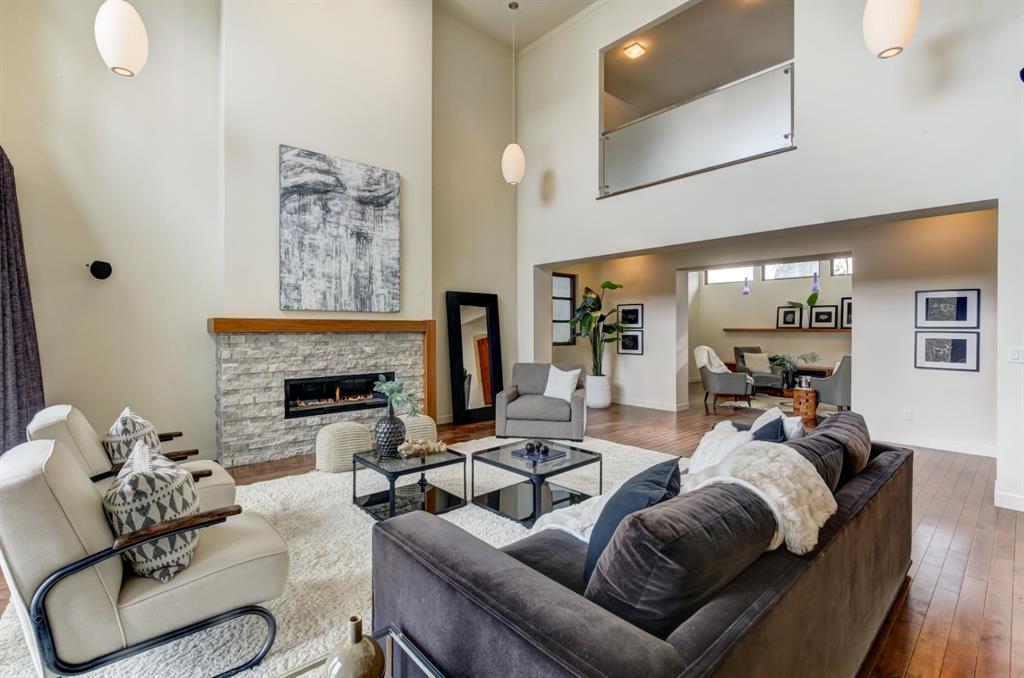 Beautiful modern riverfront family home with quadruple attached heated garage. Here is a rare chance to own riverfront on Bow Crescent in this 2010 built stunning home with 4 bedrooms, 3.5 bathrooms and modern features throughout. You will find hardwood throughout this home on the main level, upper level and both staircases, and tile throughout the rest of the living spaces, along with gorgeous wood windows, glass railings, and solid natural walnut doors. The main floor offers an open floor plan with the a stylish kitchen, dining area and two-storey living room all facing the yard, river and Bowmont park. Spacious kitchen with custom cabinetry features both lacquered and natural walnut cabinets, stainless steel appliances including a wall mount Bosch oven and microwave, gas cooktop and full size separate fridge and freezer, quartz countertops, a stylish island and pantry for extra storage. The dining area leads you out to the oversized composite deck with concrete built-in planters, a gas line for your BBQ and built-in speakers. The two-storey great room features four patio doors that all open onto the deck, a gas fireplace with stone veneer, custom drapery, and upper level windows. The main level also offers a large front flex room with upper windows designed especially to let natural sunlight in during all months of the year. This room can be a media room, home office, playroom or formal dining space. A second flex room can be set up as an office, media room, or playroom as well. 2 front closets and a powder room complete the main level. On the upper level you will find 3 bedrooms including the large primary bedroom with amazing river and Bowmont Park views from the many windows, custom drapery, and an ensuite with heated limestone flooring, walnut cabinetry, a freestanding soaker tub and tiled shower with 10mm glass. Two more oversized bedrooms are also on this level (one of which would need a railing closed in to use as a bedroom). A full bathroom and laundry room are also located on this upper level. The basement is fully finished with in-floor heat throughout, a large mudroom with custom built-ins, bedroom with 2 closets, full bathroom, finished storage area and utility room with plenty of storage space. The 4-car garage is a double tandem, with an oversized 18 ft wide garage door, has in-floor radiant heat, epoxy finish on the floor and is fully insulated, drywalled and painted. The riverfront yard is simply amazing and has a lower yard right beside the river as well. Truly a beautiful place to live with great neighbours, views and location on the river path system and across from Bowmont Park. Quick access to downtown and great nearby amenities.