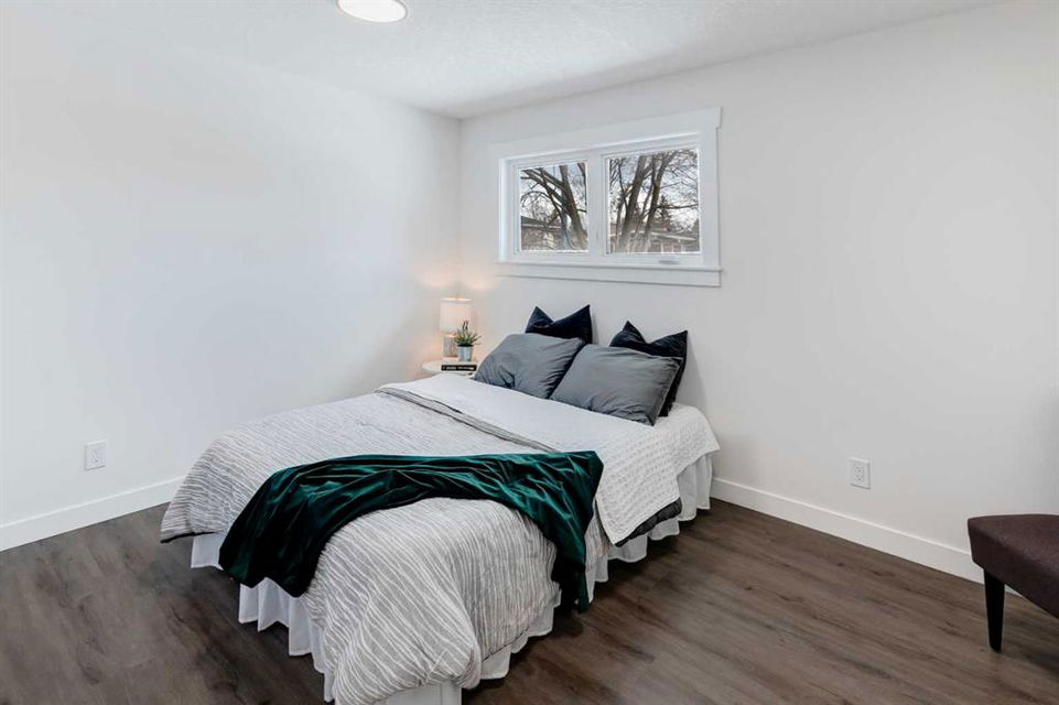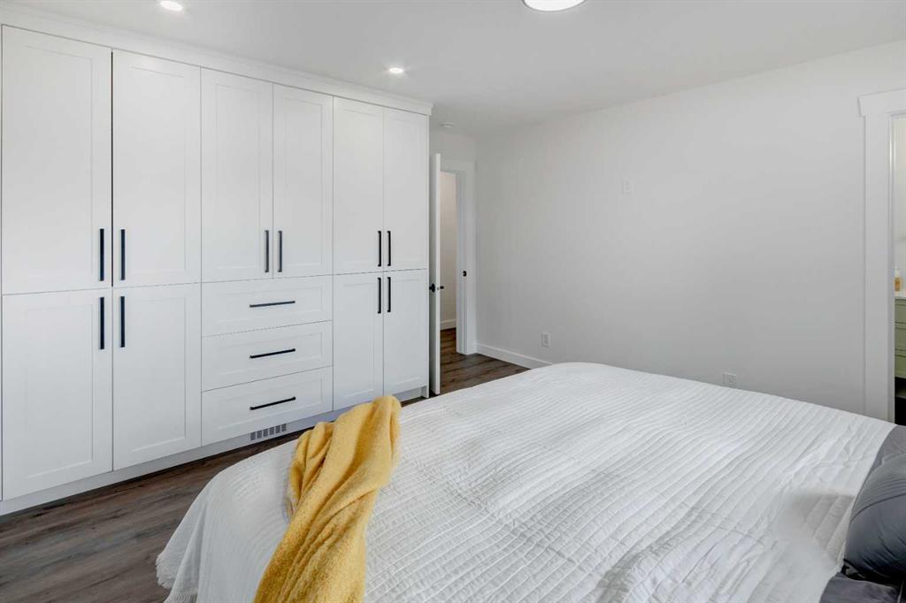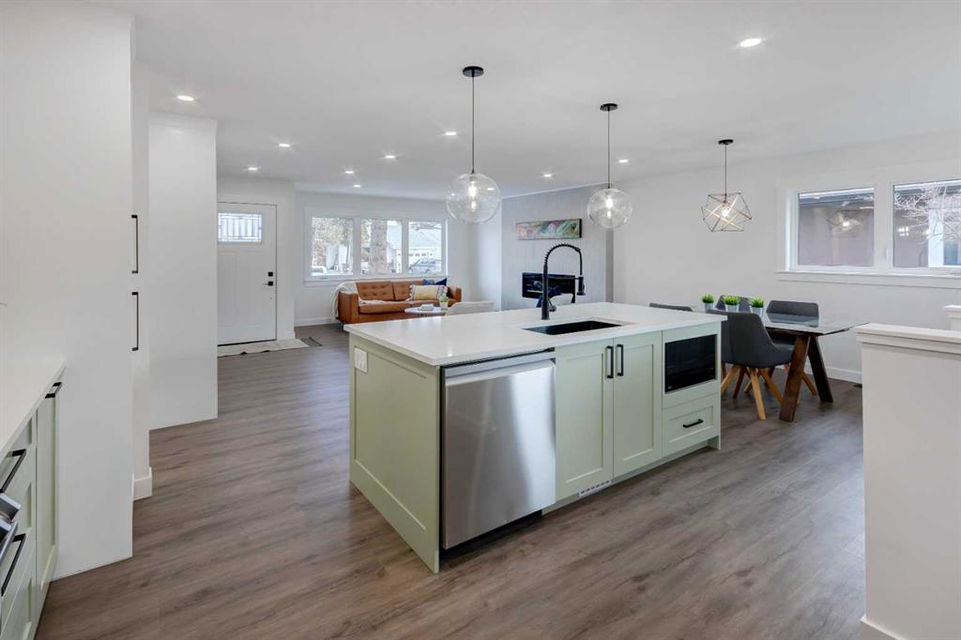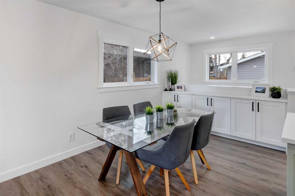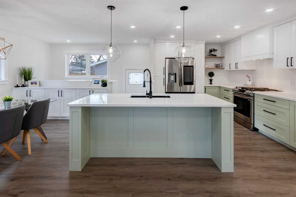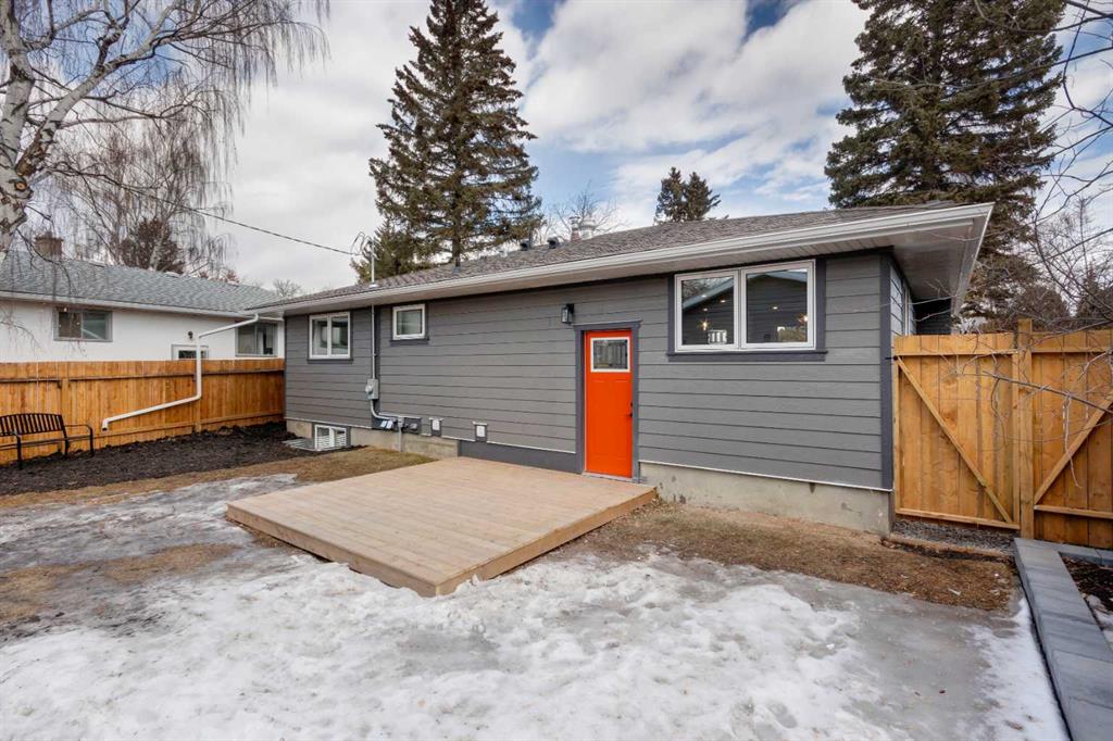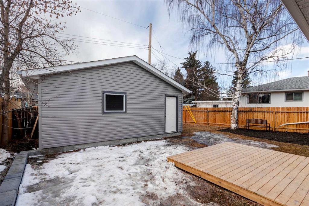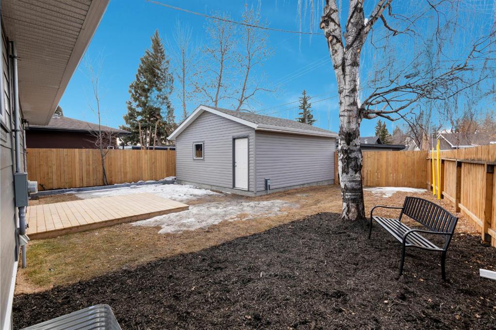 Welcome to this professionally renovated, modern and trendy 4 bedroom, 3 full bathroom bungalow with 2189 sq ft of total living space, on a large lot with a south-facing yard and brand new detached garage. This home is on a beautiful street in west Haysboro with excellent quality finishing throughout, a thoughtful layout, and lovely design choices from top to bottom. The main level of this bungalow is 1164 sq ft and the front foyer with built-in closet and built-in bench greets you as you enter. Brand new custom kitchen with stylish lacquered cabinetry, black hardware, quartz countertops, stainless steel appliances including a gas range, site-built hoodfan and large island with seating. The kitchen opens onto the dining area with more built-in cabinetry and quartz counter space. The spacious living room features large windows and a fireplace with floor to ceiling textured tile surround. 2 bedrooms on the main level, including the primary suite with built-in wardrobe closets with doors and drawers, and an amazing ensuite with a gorgeous tiled shower with custom niche with built-in lighting and glass wall and door, his & hers sinks, and heated tile floor. The second bedroom is spacious and also has plenty of built-in wardrobe closets. A second beautiful full bathroom completes this main level. All new vinyl plank flooring, knockdown ceilings, baseboards, trim and lighting throughout the the entire home. In the basement you will find a bright and roomy family room with a tiled fireplace, large window, and wet bar with fridge, and a glass wall by the stairs that brings in extra light. 2 large bedrooms with new windows and built-in closets, the 3rd full bathroom, a great laundry room with brand new washer & dryer are located in the basement, along with a den/flex room, utility room and under the stair storage. The large south-facing yard features a brand new 21’6″ x 21′ double garage and new deck. New electrrical panel and all new wiring, new hot water tank, and the furnace/ducts were just inspected and cleaned. New Hardieboard exterior on the house and all new windows. Great quiet street and neighborhood close to the Glenmore Reservoir and so many nearby amenities. a great place to call home!