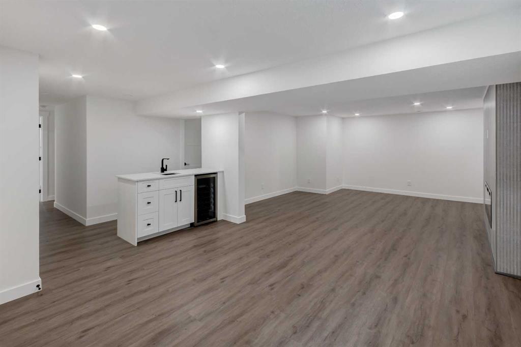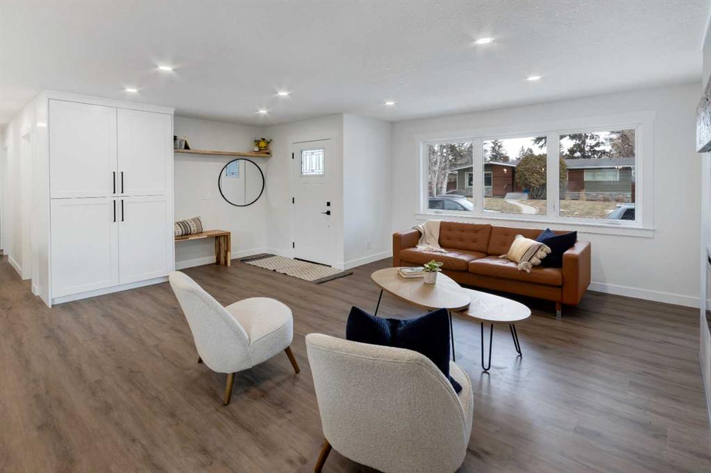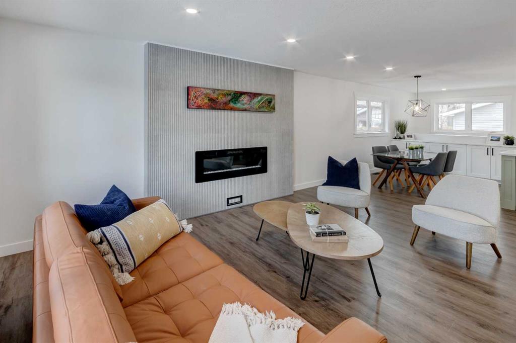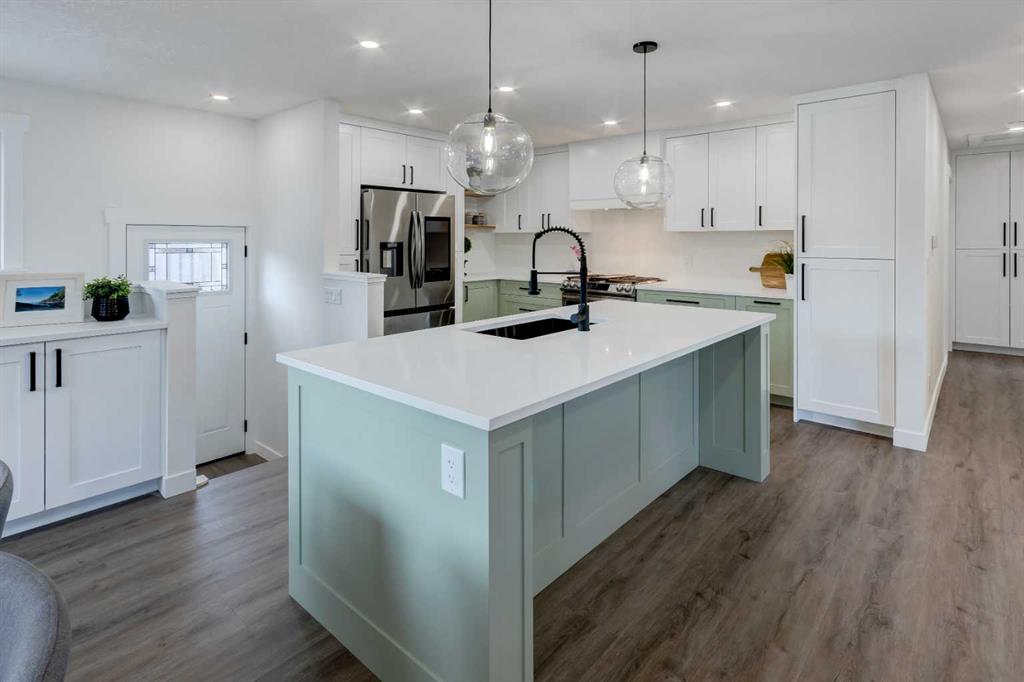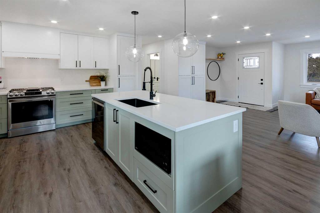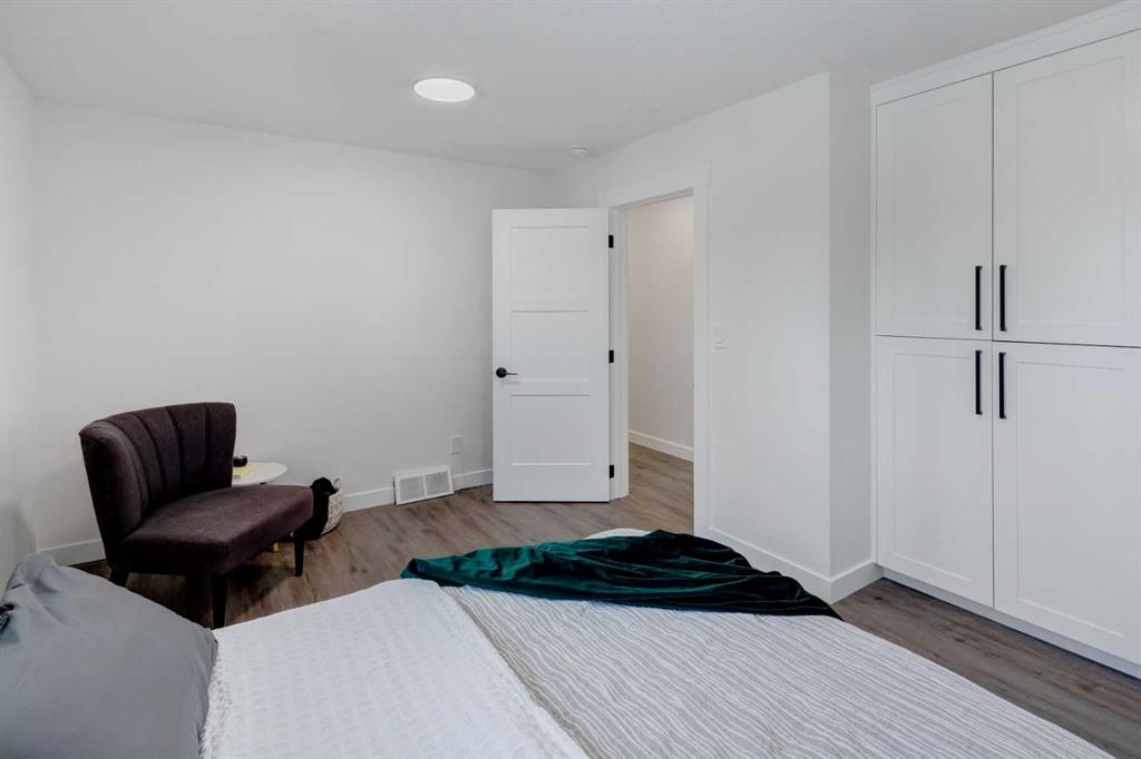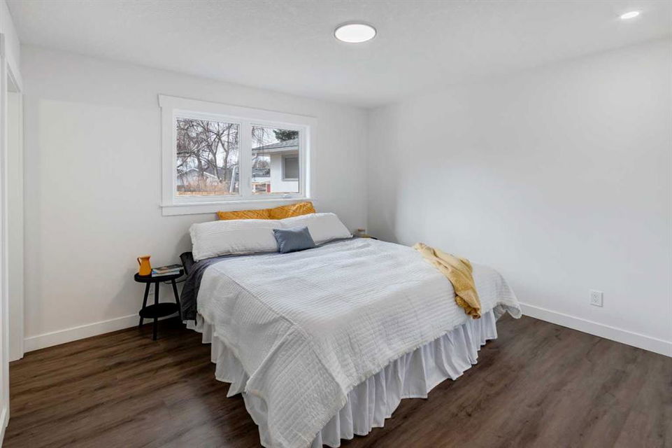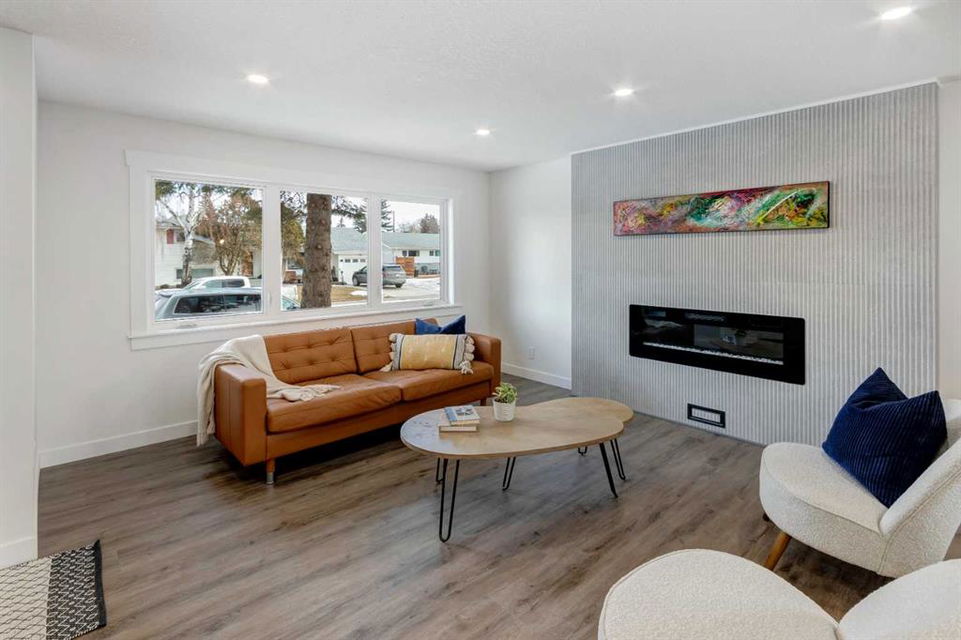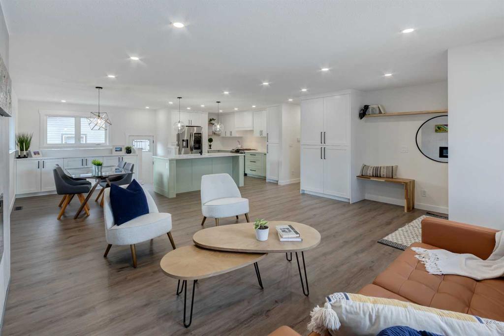 Welcome to this professionally renovated, modern and trendy 4 bedroom, 3 full bathroom bungalow with 2189 sq ft of total living space, on a large lot with a south-facing yard and brand new detached garage. This home is on a beautiful street in west Haysboro with excellent quality finishing throughout, a thoughtful layout, and lovely design choices from top to bottom. The main level of this bungalow is 1164 sq ft and the front foyer with built-in closet and built-in bench greets you as you enter. Brand new custom kitchen with stylish lacquered cabinetry, black hardware, quartz countertops, stainless steel appliances including a gas range, site-built hoodfan and large island with seating. The kitchen opens onto the dining area with more built-in cabinetry and quartz counter space. The spacious living room features large windows and a fireplace with floor to ceiling textured tile surround. 2 bedrooms on the main level, including the primary suite with built-in wardrobe closets with doors and drawers, and an amazing ensuite with a gorgeous tiled shower with custom niche with built-in lighting and glass wall and door, his & hers sinks, and heated tile floor. The second bedroom is spacious and also has plenty of built-in wardrobe closets. A second beautiful full bathroom completes this main level. All new vinyl plank flooring, knockdown ceilings, baseboards, trim and lighting throughout the the entire home. In the basement you will find a bright and roomy family room with a tiled fireplace, large window, and wet bar with fridge, and a glass wall by the stairs that brings in extra light. 2 large bedrooms with new windows and built-in closets, the 3rd full bathroom, a great laundry room with brand new washer & dryer are located in the basement, along with a den/flex room, utility room and under the stair storage. The large south-facing yard features a brand new 21’6″ x 21′ double garage and new deck. New electrrical panel and all new wiring, new hot water tank, and the furnace/ducts were just inspected and cleaned. New Hardieboard exterior on the house and all new windows. Great quiet street and neighborhood close to the Glenmore Reservoir and so many nearby amenities. a great place to call home!