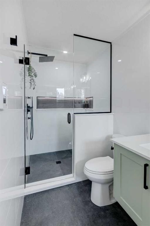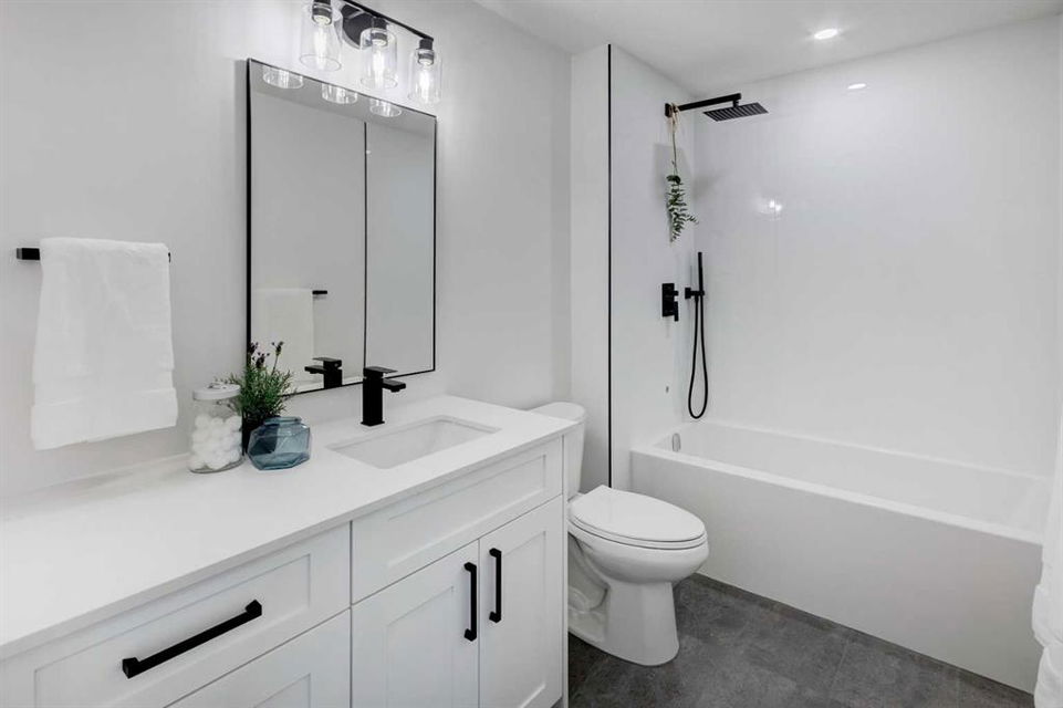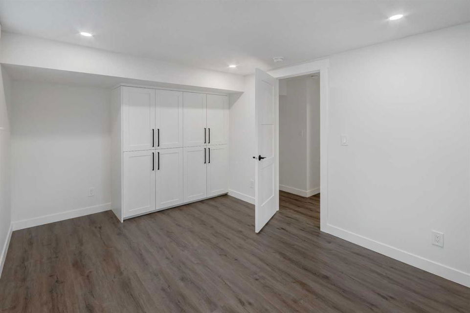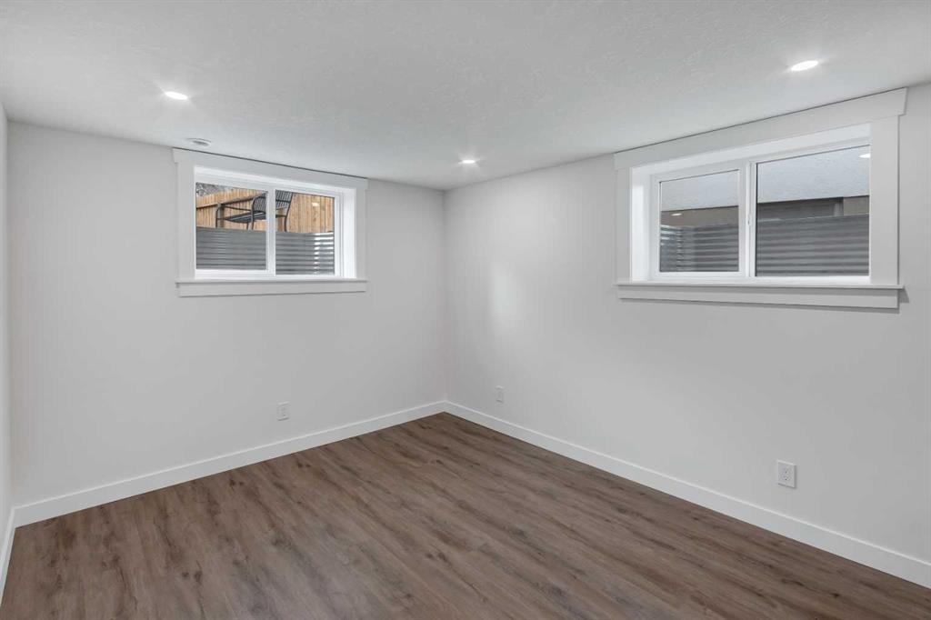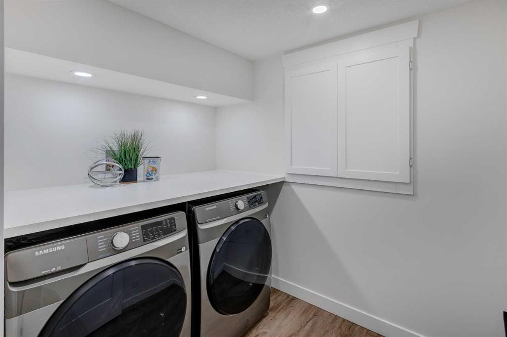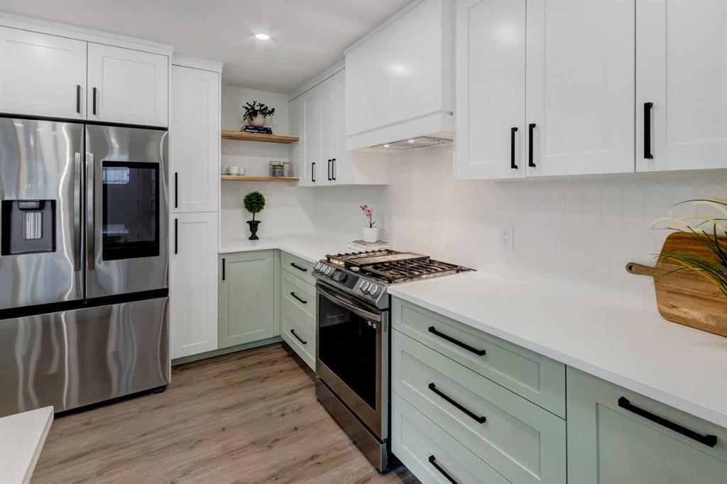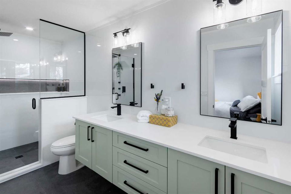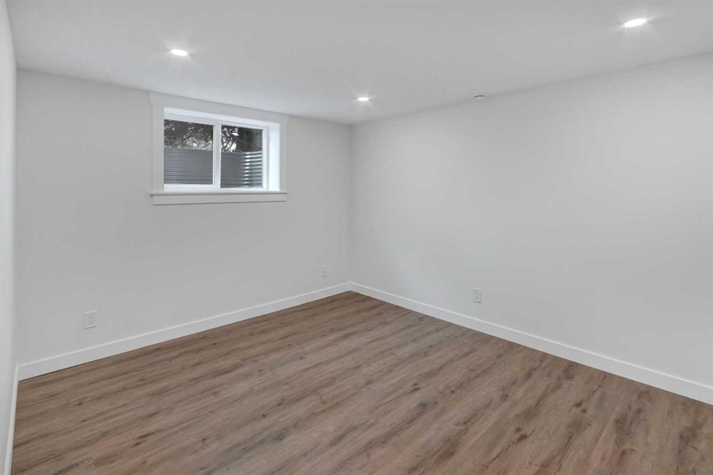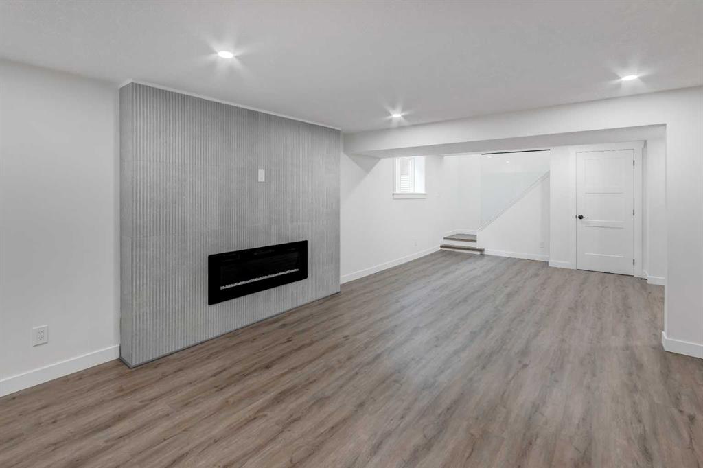 Welcome to this professionally renovated, modern and trendy 4 bedroom, 3 full bathroom bungalow with 2189 sq ft of total living space, on a large lot with a south-facing yard and brand new detached garage. This home is on a beautiful street in west Haysboro with excellent quality finishing throughout, a thoughtful layout, and lovely design choices from top to bottom. The main level of this bungalow is 1164 sq ft and the front foyer with built-in closet and built-in bench greets you as you enter. Brand new custom kitchen with stylish lacquered cabinetry, black hardware, quartz countertops, stainless steel appliances including a gas range, site-built hoodfan and large island with seating. The kitchen opens onto the dining area with more built-in cabinetry and quartz counter space. The spacious living room features large windows and a fireplace with floor to ceiling textured tile surround. 2 bedrooms on the main level, including the primary suite with built-in wardrobe closets with doors and drawers, and an amazing ensuite with a gorgeous tiled shower with custom niche with built-in lighting and glass wall and door, his & hers sinks, and heated tile floor. The second bedroom is spacious and also has plenty of built-in wardrobe closets. A second beautiful full bathroom completes this main level. All new vinyl plank flooring, knockdown ceilings, baseboards, trim and lighting throughout the the entire home. In the basement you will find a bright and roomy family room with a tiled fireplace, large window, and wet bar with fridge, and a glass wall by the stairs that brings in extra light. 2 large bedrooms with new windows and built-in closets, the 3rd full bathroom, a great laundry room with brand new washer & dryer are located in the basement, along with a den/flex room, utility room and under the stair storage. The large south-facing yard features a brand new 21’6″ x 21′ double garage and new deck. New electrrical panel and all new wiring, new hot water tank, and the furnace/ducts were just inspected and cleaned. New Hardieboard exterior on the house and all new windows. Great quiet street and neighborhood close to the Glenmore Reservoir and so many nearby amenities. a great place to call home!