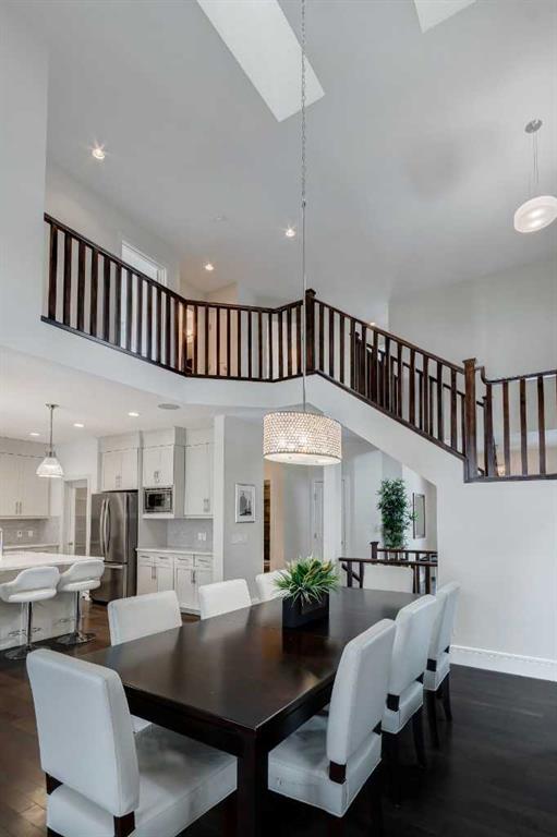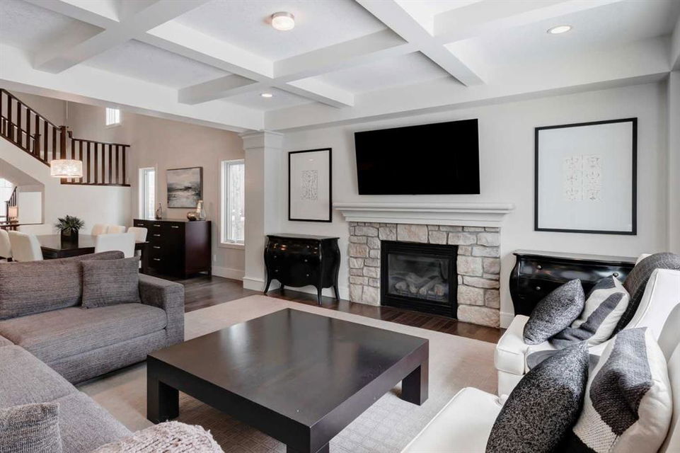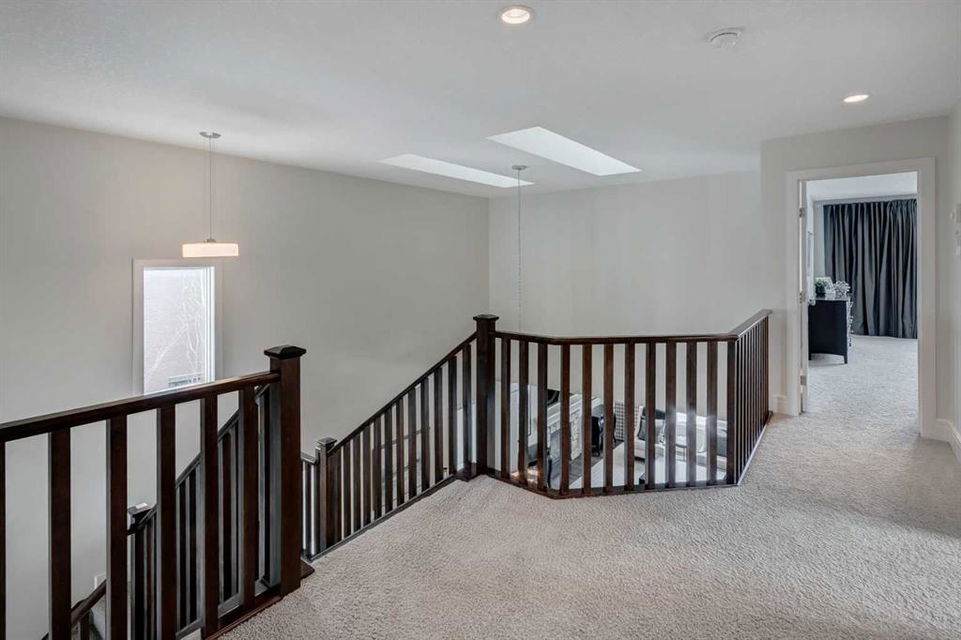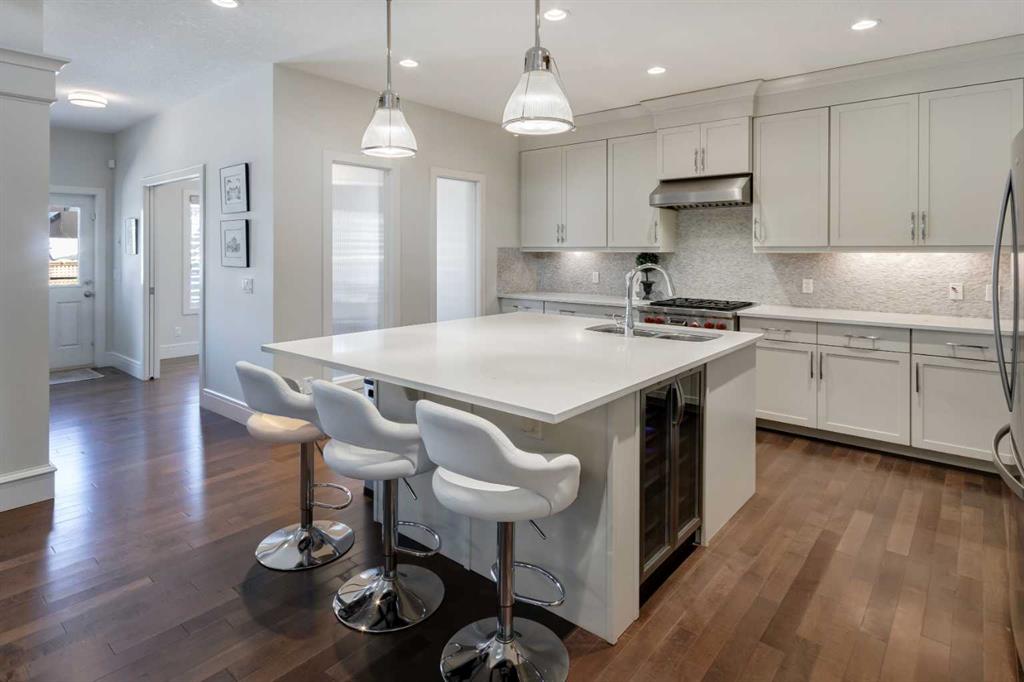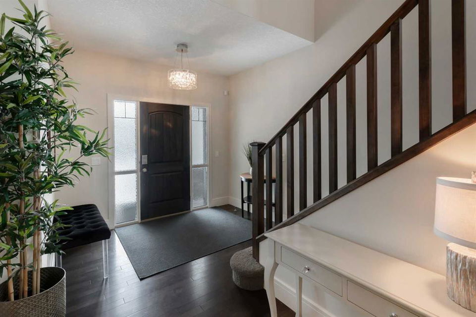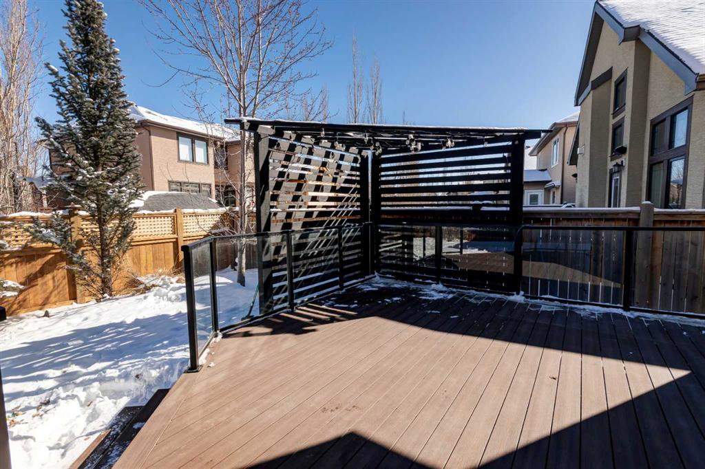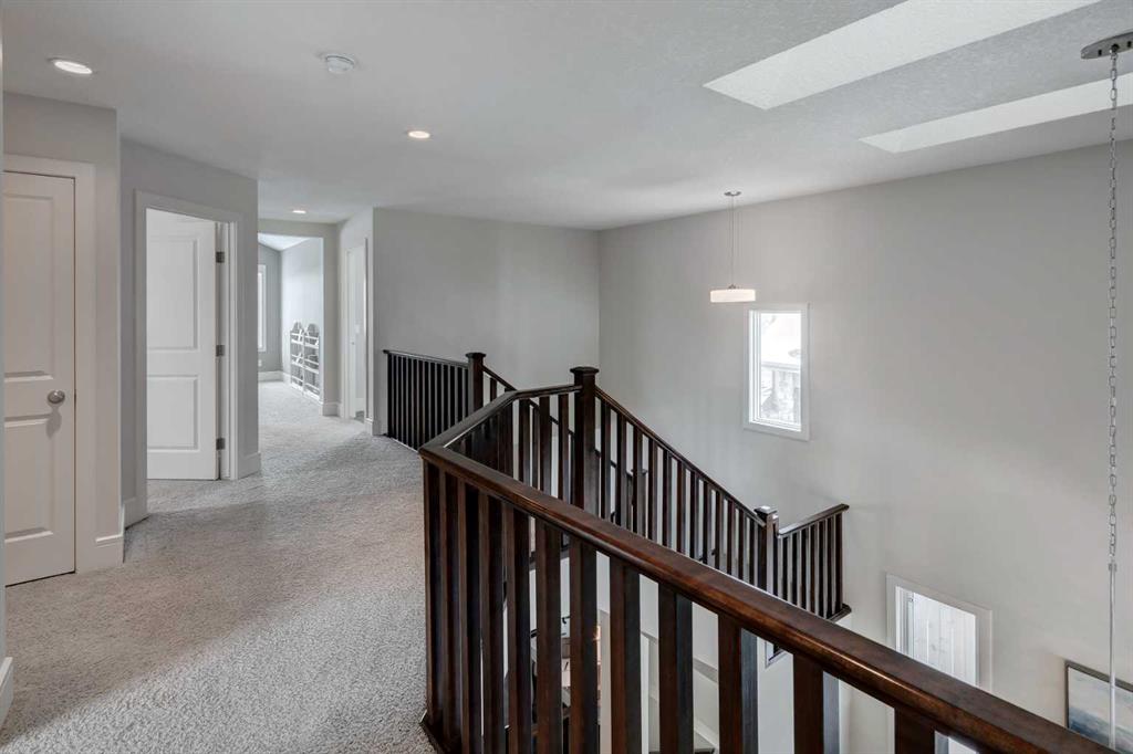 Beautiful, upgraded and very well maintained 4 bedroom family home with 3826 sq ft of total developed living space, with a fully landscaped backyard on a lovely quiet street. Hardwood flooring throughout the main level, central air conditioning, new dishwasher & refrigerator (2023), new garage door opener (2024), new composite deck (2022), and furnace just cleaned! Spacious kitchen with plenty of cabinetry, quartz countertops, marble backsplash, stainless steel appliances including a Wolf range and a wine fridge, island with seating, and a large corner pantry. The open concept living room has coffered ceilings, gas fireplace and great windows facing the yard. Stunning 2 storey open dining room with skylights. Private den/office off the living room with views of the yard and double french pocket doors. Mudroom with access to the double attached garage, front foyer and a powder room complete this well laid out main level. The upper level features 3 bedrooms including the sizeable primary bedroom with space for a king bed, dressers and a sitting area, and leads to the great walk-in closet with custom built-ins, and the beautiful ensuite bathroom with dual vanities, granite countertops, a deep soaker tub, tiled shower with wall and overhead rain shower heads, and a private water closet. 2 more spacious bedrooms, a full bathroom, bonus room with vaulted ceilings, and a bright laundry room with loads of storage completes the upper level. In the basement you will find the 4th bedroom, full bathroom, gym/flex room with gym flooring and wall mirrors, large family/recreation room, plus the utility room and storage. The fully landscaped yard has trees, shrubs, composite deck, pergola, stone patio sitting area, irrigation and landscape lighting. Located in the Wentworth section of West Springs, this home is close to schools, playgrounds, walking paths and the many community amenities and restaurants. Modern, beautifully kept, and thoughtfully laid out, don’t miss out on seeing this home in person before it is sold!